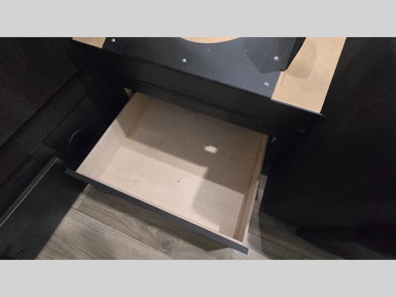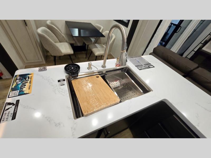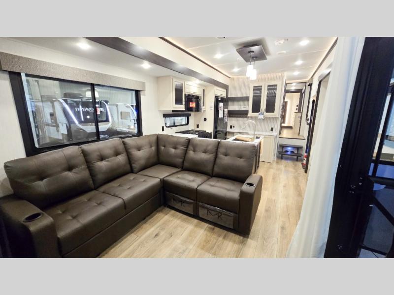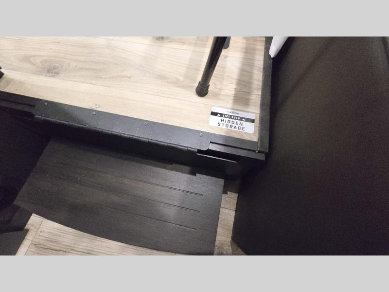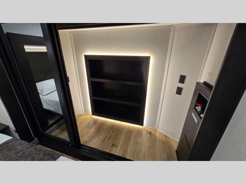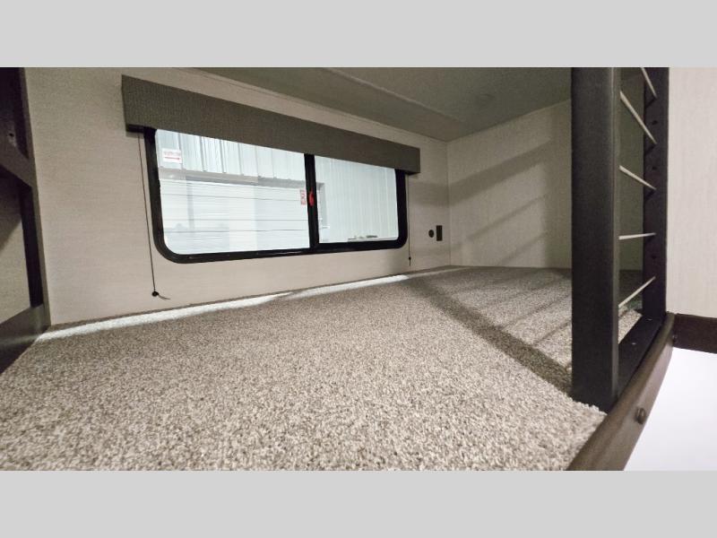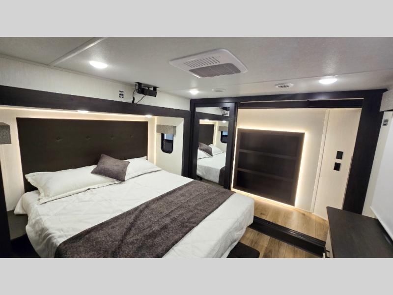 This is the perfect fifth wheel if you enjoy camping with friends and family! You'll have the front private bedroom with a camper king bed slide all to yourselves, while your guests take the rear den. There is a tri-fold sofa here, along with a wardrobe with a desk, additional shelves plus a loft above this room for even more sleeping or storage space! The main living room features an L-shaped sectional sofa, a fireplace and an entertainment center. And the patio deck with a 12' awning is right off of this room so you can visit with friends indoors or outdoors! There is generous counter space in the full kitchen, along with a pull-out storage drawer and a versatile dinette/desk. There are many more stand-out features found in this fifth wheel, including washer and dryer prep in the front bedroom, a 70" projector screen in the rear den, a second power awning, and the list goes on!