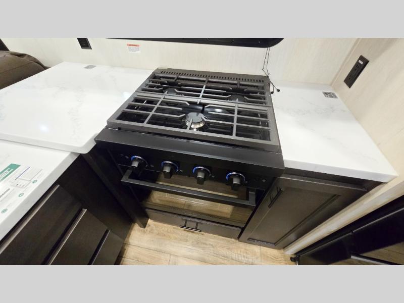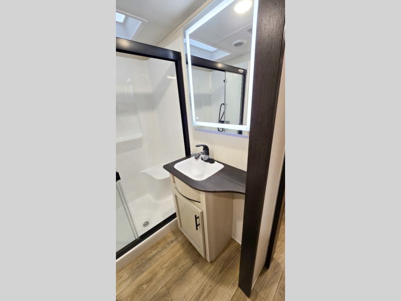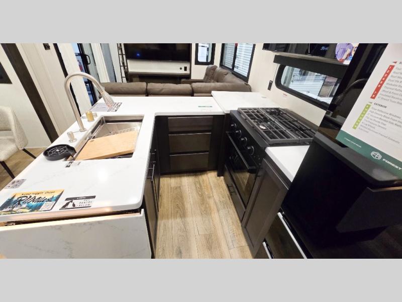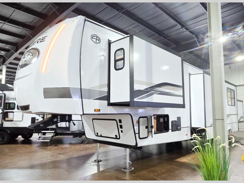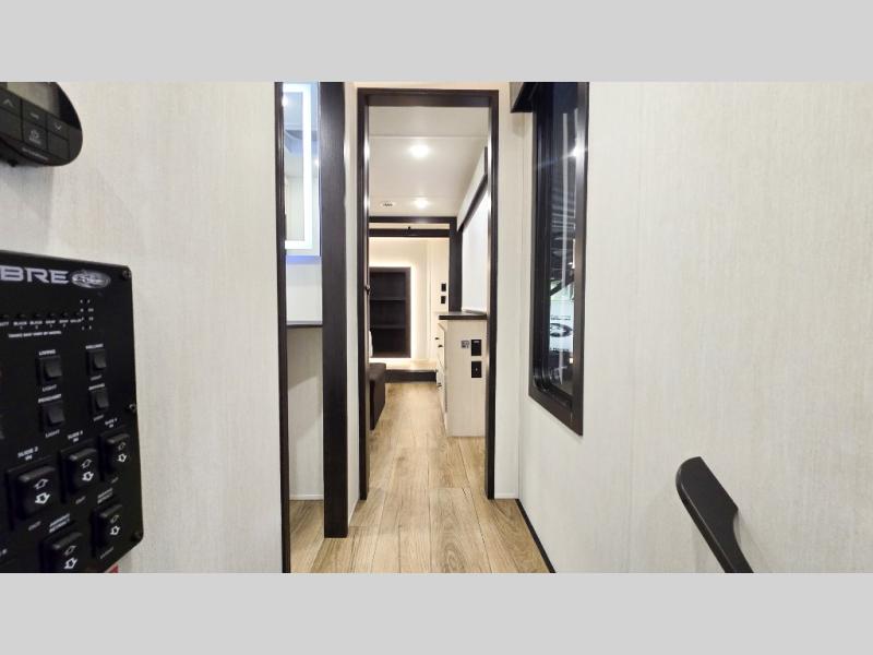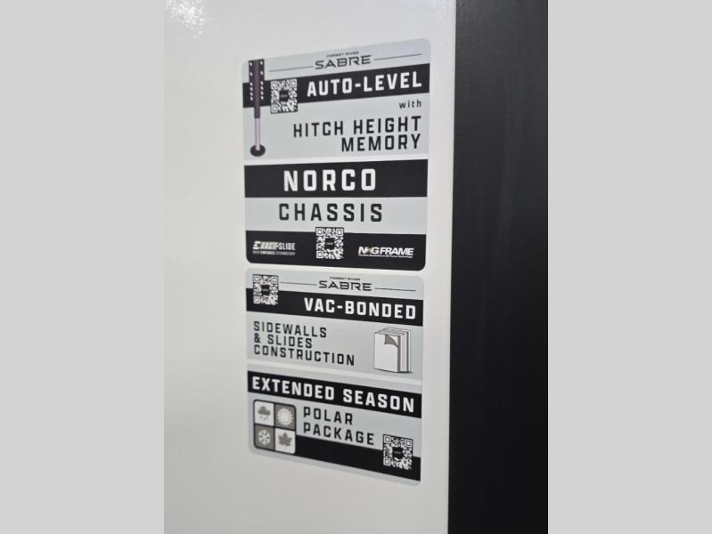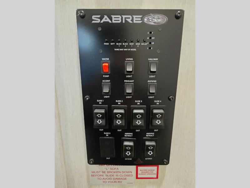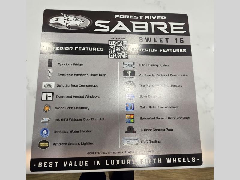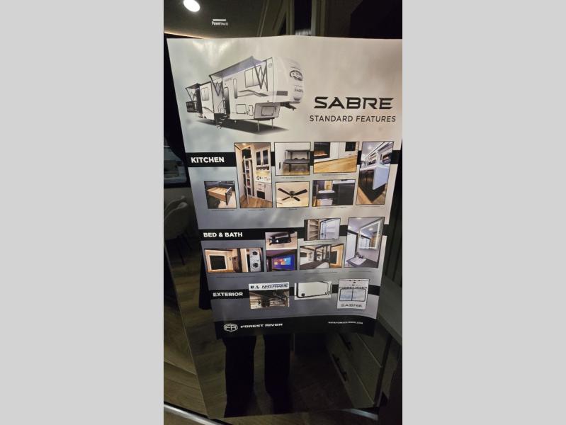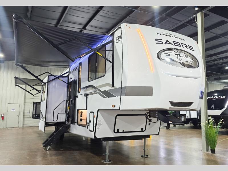 You will experience luxurious camping trips at an affordable price with any one of these Forest River Cherokee Sabre fifth wheels! These models are durable and ready to travel anytime of the year thanks to features like the high-gloss gel-coat front cap with LED lighting, the PVC roof membrane, and the forced air underbelly with enclosed gate valves. The electric auto-leveling system makes setting up easy and safe, and the adjustable power awning with LED lighting will create an inviting outdoor living space. Each model includes a universal docking station which includes a black tank flush and an outside shower, and adjustable stable steps for you to enter and exit the unit safely. Inside, you will love the design of the ambient accent lighting in the living area, the real wood lumbercore cabinetry, and the linoleum flooring!