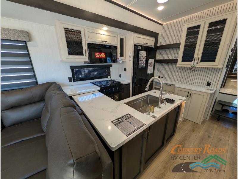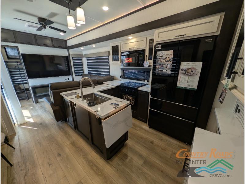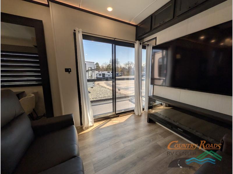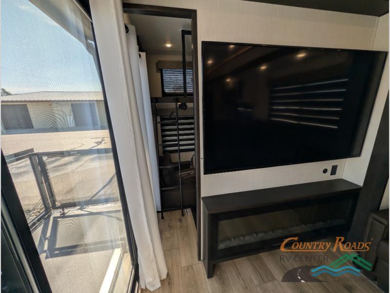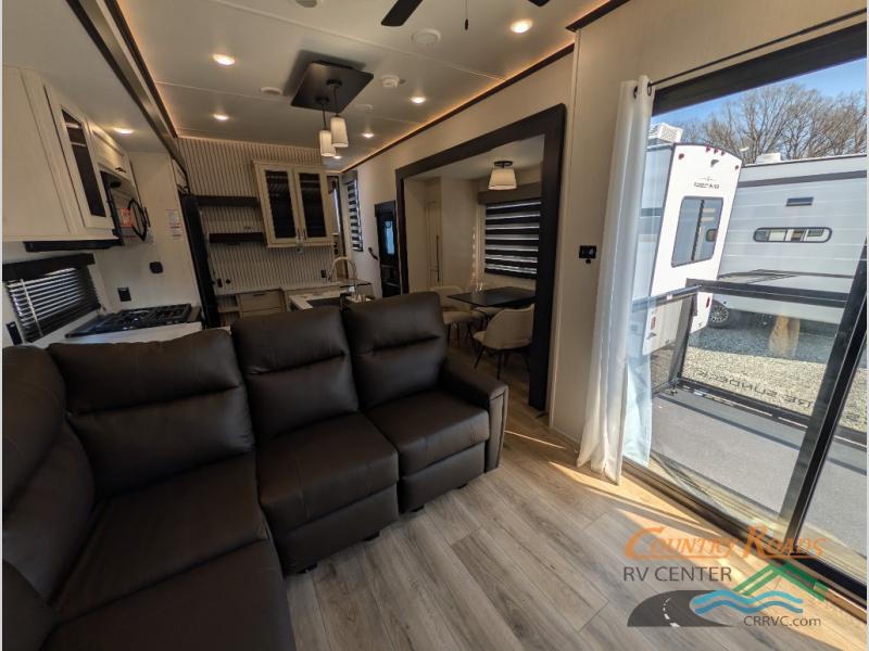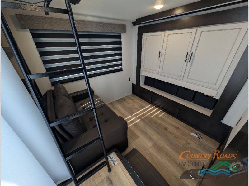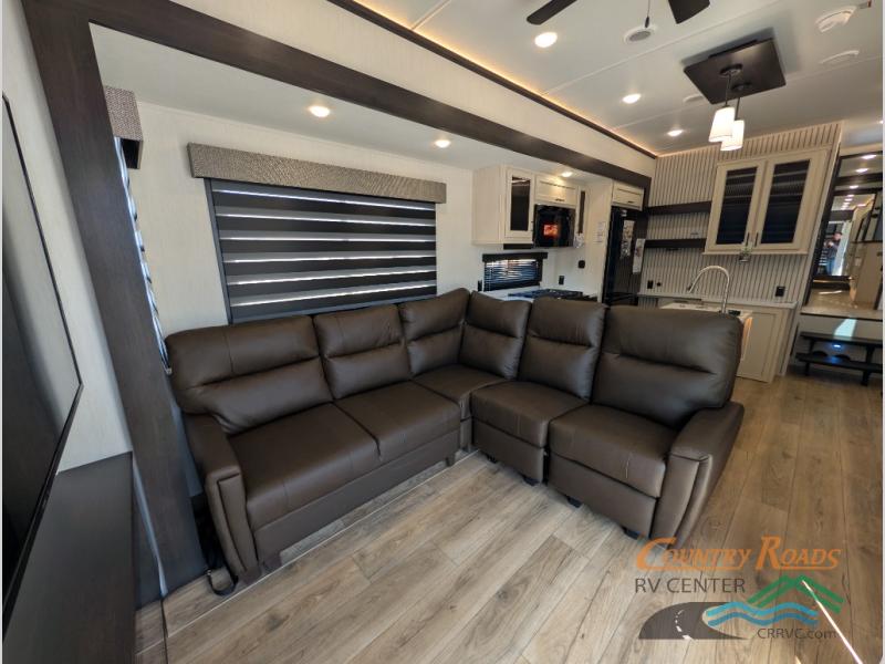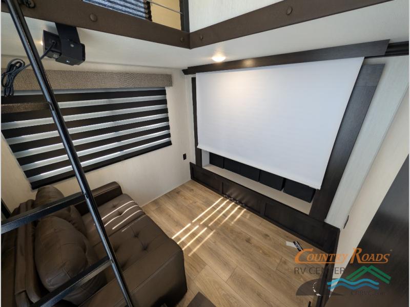 This is the perfect fifth wheel if you enjoy camping with friends and family! You'll have the front private bedroom with a camper king bed slide all to yourselves, while your guests take the rear den. There is a tri-fold sofa here, along with a wardrobe with a desk, additional shelves plus a loft above this room for even more sleeping or storage space! The main living room features an L-shaped sectional sofa, a fireplace and an entertainment center. And the patio deck with a 12' awning is right off of this room so you can visit with friends indoors or outdoors! There is generous counter space in the full kitchen, along with a pull-out storage drawer and a versatile dinette/desk. There are many more stand-out features found in this fifth wheel, including washer and dryer prep in the front bedroom, a 70" projector screen in the rear den, a second power awning, and the list goes on!