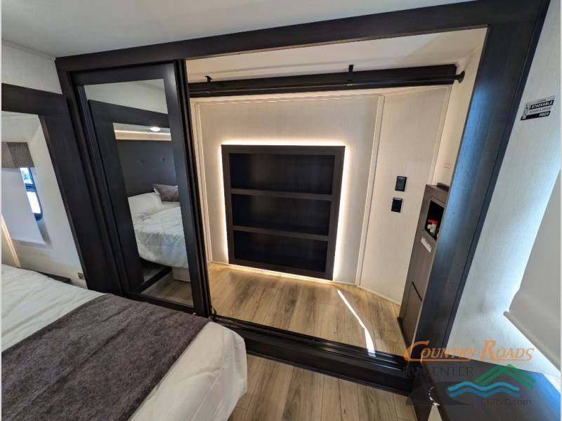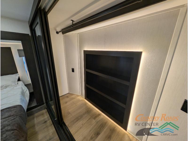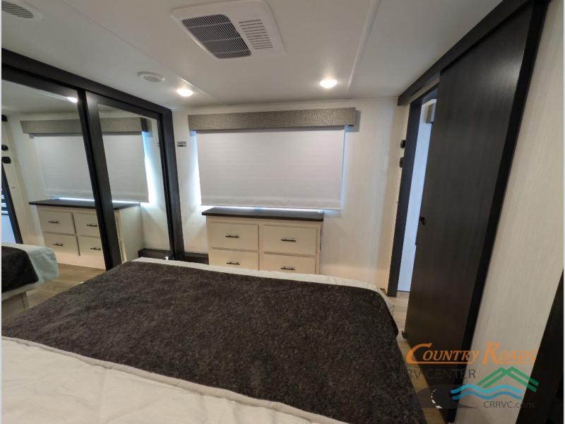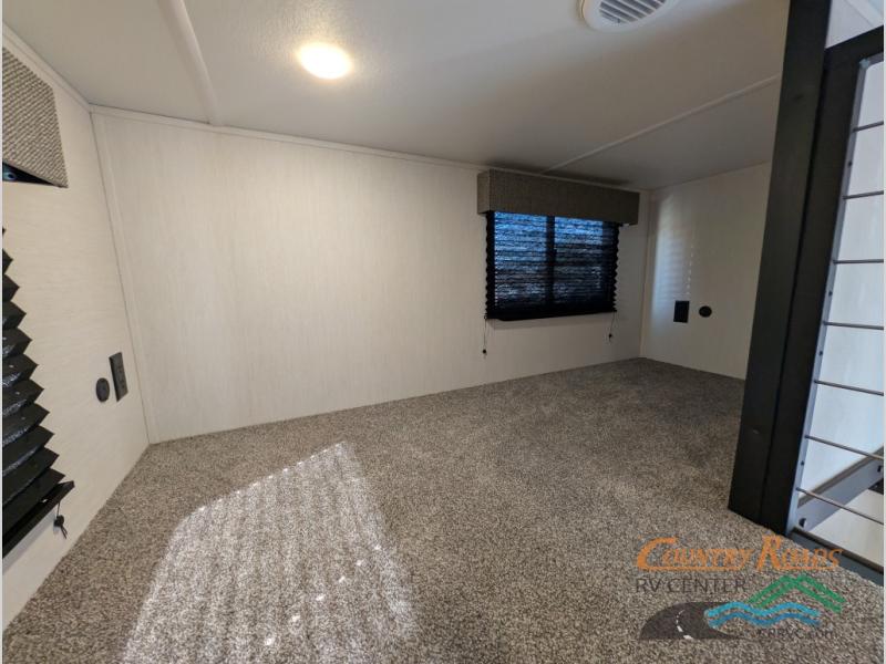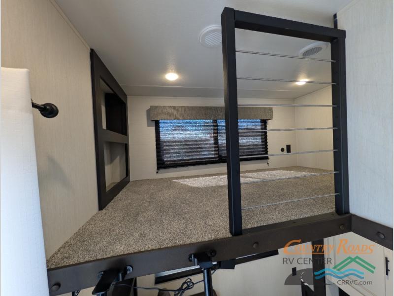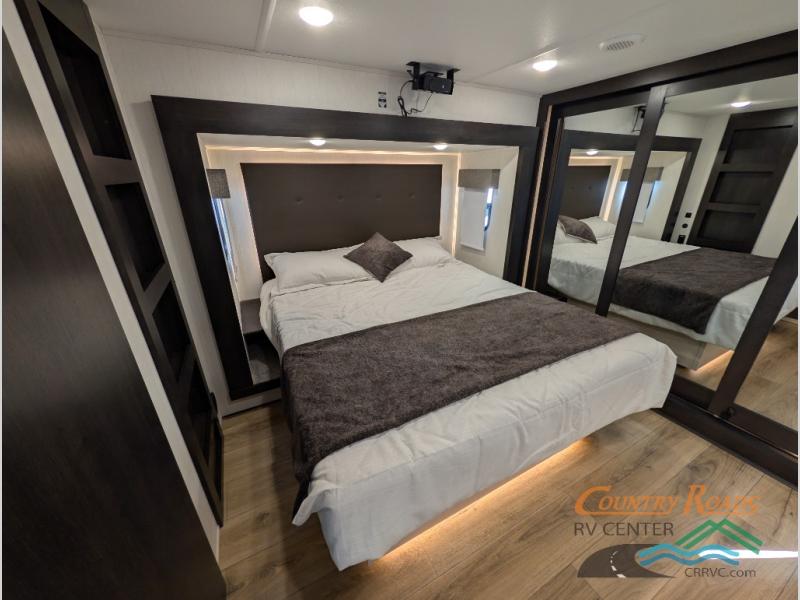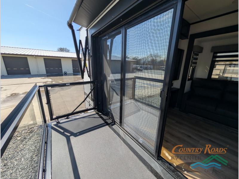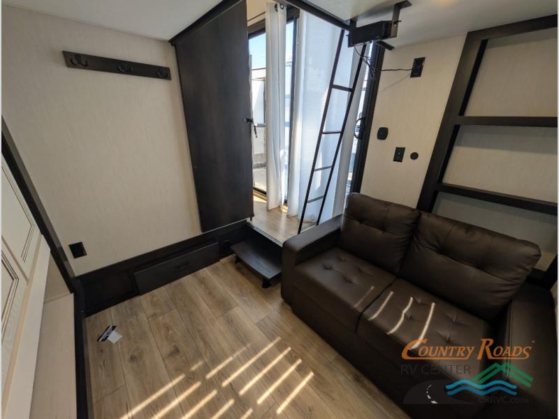 This is the perfect fifth wheel if you enjoy camping with friends and family! You'll have the front private bedroom with a camper king bed slide all to yourselves, while your guests take the rear den. There is a tri-fold sofa here, along with a wardrobe with a desk, additional shelves plus a loft above this room for even more sleeping or storage space! The main living room features an L-shaped sectional sofa, a fireplace and an entertainment center. And the patio deck with a 12' awning is right off of this room so you can visit with friends indoors or outdoors! There is generous counter space in the full kitchen, along with a pull-out storage drawer and a versatile dinette/desk. There are many more stand-out features found in this fifth wheel, including washer and dryer prep in the front bedroom, a 70" projector screen in the rear den, a second power awning, and the list goes on!