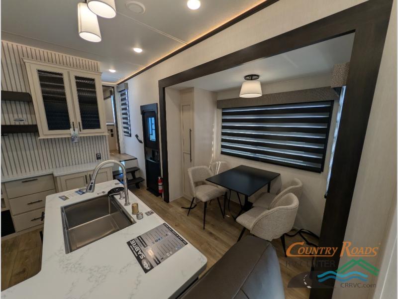 You will experience luxurious camping trips at an affordable price with any one of these Forest River Cherokee Sabre fifth wheels! These models are durable and ready to travel anytime of the year thanks to features like the high-gloss gel-coat front cap with LED lighting, the PVC roof membrane, and the forced air underbelly with enclosed gate valves. The electric auto-leveling system makes setting up easy and safe, and the adjustable power awning with LED lighting will create an inviting outdoor living space. Each model includes a universal docking station which includes a black tank flush and an outside shower, and adjustable stable steps for you to enter and exit the unit safely. Inside, you will love the design of the ambient accent lighting in the living area, the real wood lumbercore cabinetry, and the linoleum flooring!