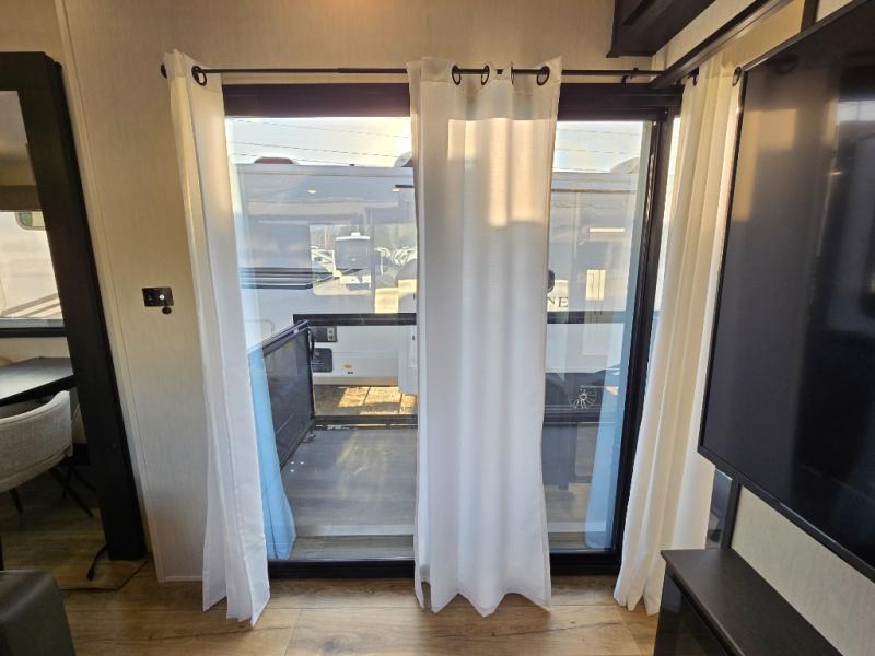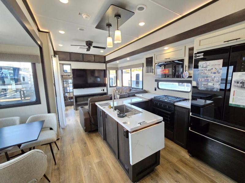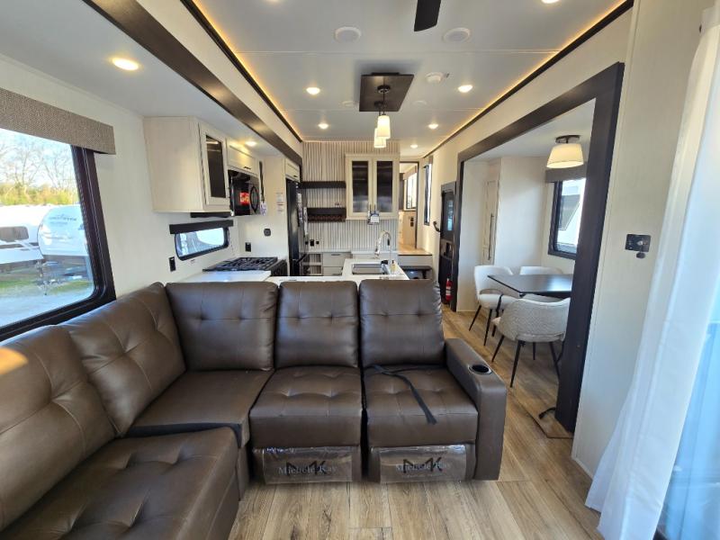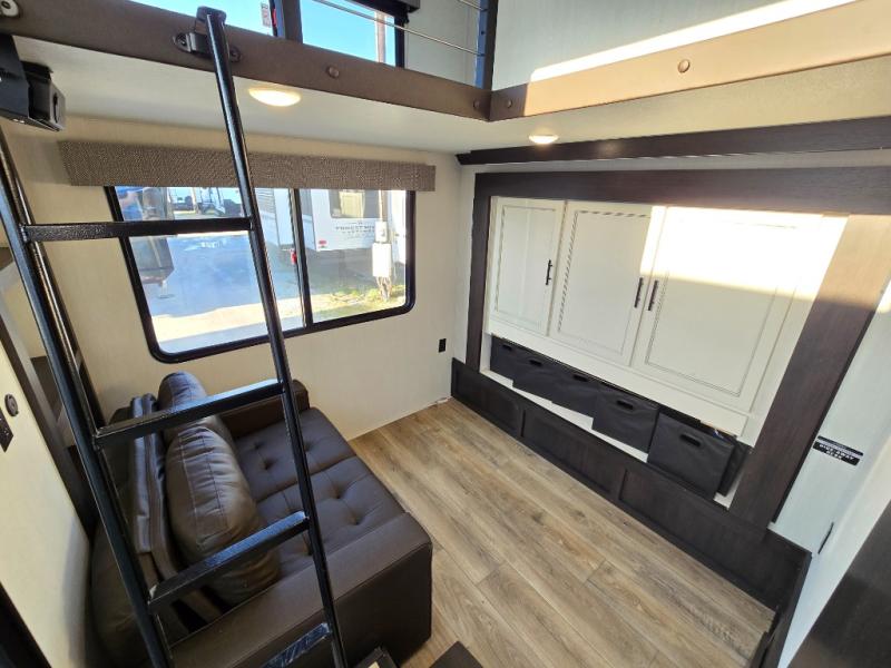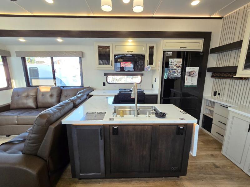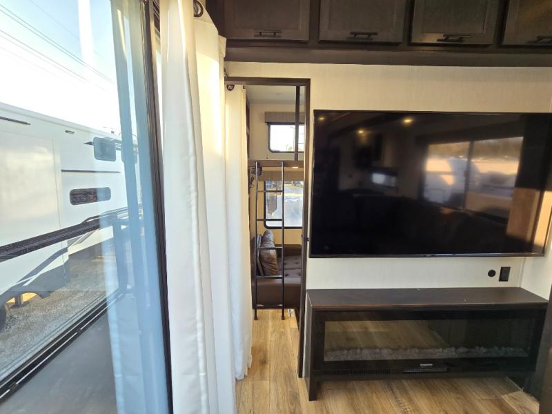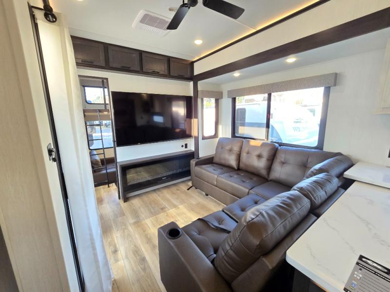 This is the perfect fifth wheel if you enjoy camping with friends and family! You'll have the front private bedroom with a camper king bed slide all to yourselves, while your guests take the rear den. There is a tri-fold sofa here, along with a wardrobe with a desk, additional shelves plus a loft above this room for even more sleeping or storage space! The main living room features an L-shaped sectional sofa, a fireplace and an entertainment center. And the patio deck with a 12' awning is right off of this room so you can visit with friends indoors or outdoors! There is generous counter space in the full kitchen, along with a pull-out storage drawer and a versatile dinette/desk. There are many more stand-out features found in this fifth wheel, including washer and dryer prep in the front bedroom, a 70" projector screen in the rear den, a second power awning, and the list goes on!
