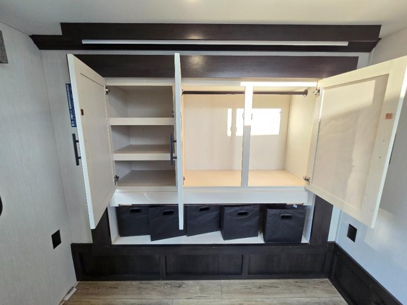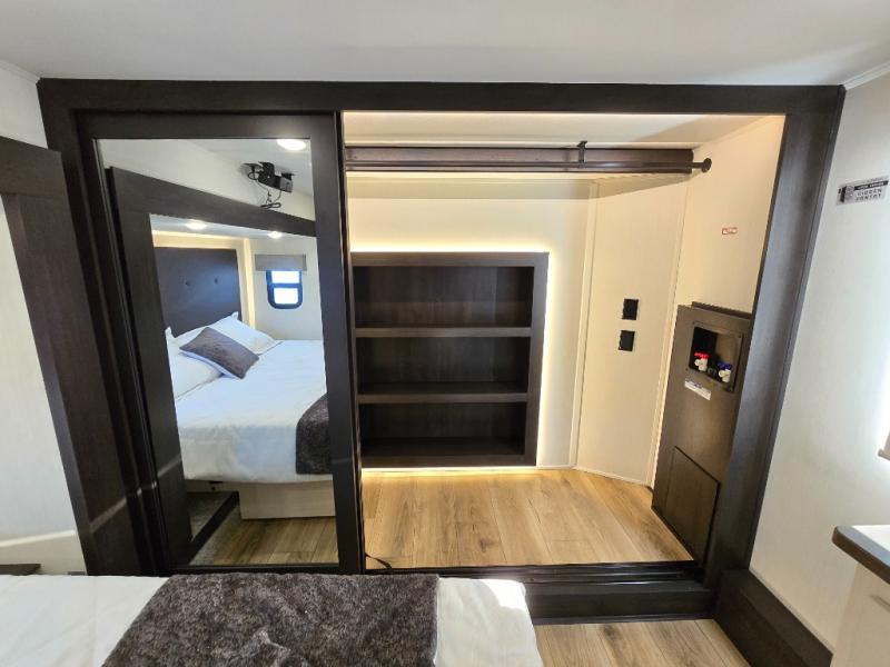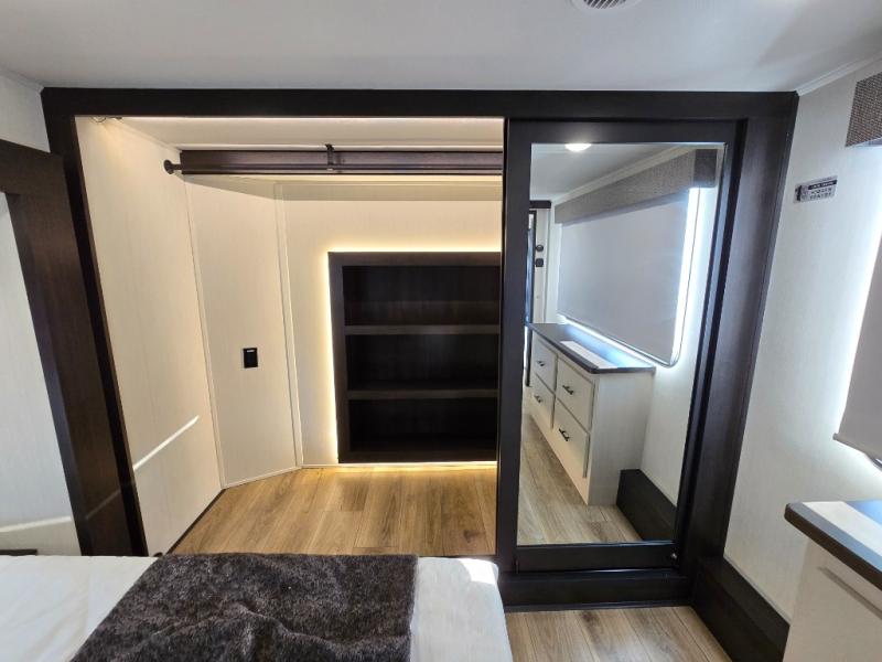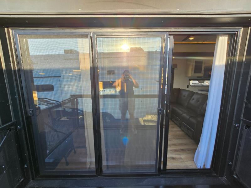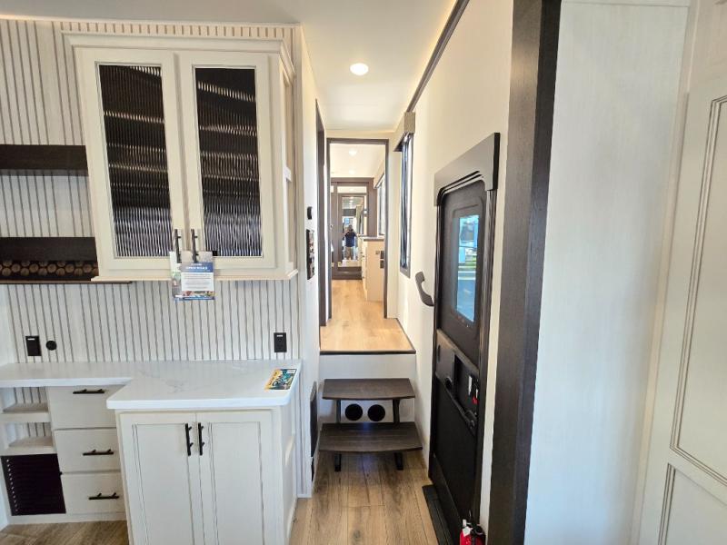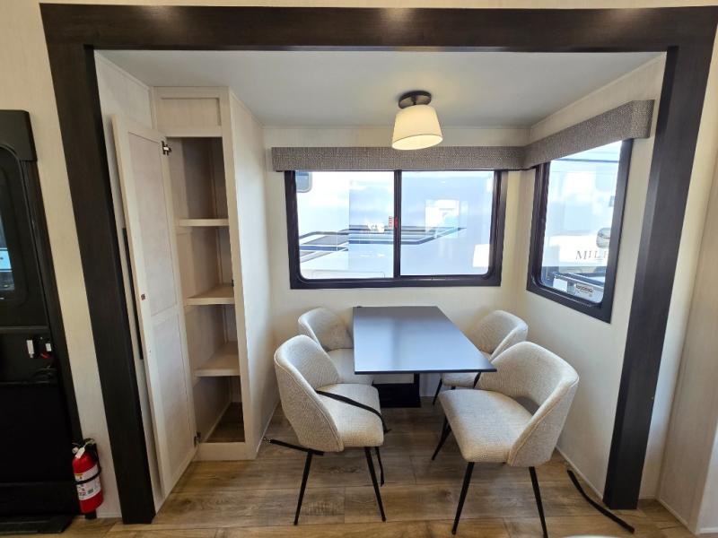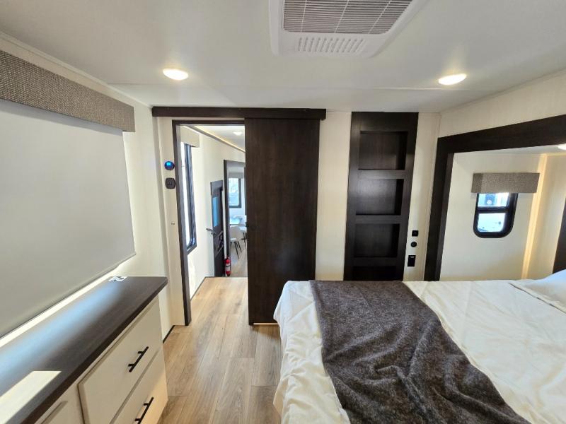 This is the perfect fifth wheel if you enjoy camping with friends and family! You'll have the front private bedroom with a camper king bed slide all to yourselves, while your guests take the rear den. There is a tri-fold sofa here, along with a wardrobe with a desk, additional shelves plus a loft above this room for even more sleeping or storage space! The main living room features an L-shaped sectional sofa, a fireplace and an entertainment center. And the patio deck with a 12' awning is right off of this room so you can visit with friends indoors or outdoors! There is generous counter space in the full kitchen, along with a pull-out storage drawer and a versatile dinette/desk. There are many more stand-out features found in this fifth wheel, including washer and dryer prep in the front bedroom, a 70" projector screen in the rear den, a second power awning, and the list goes on!