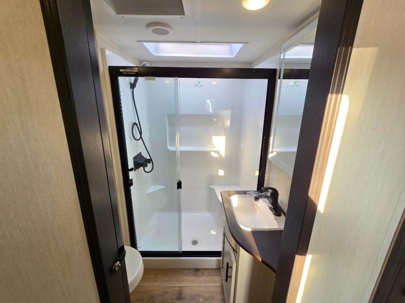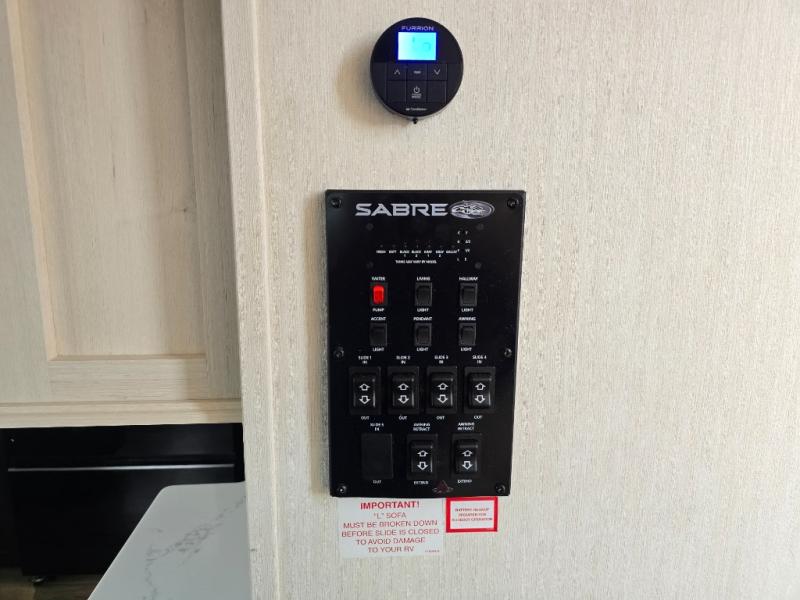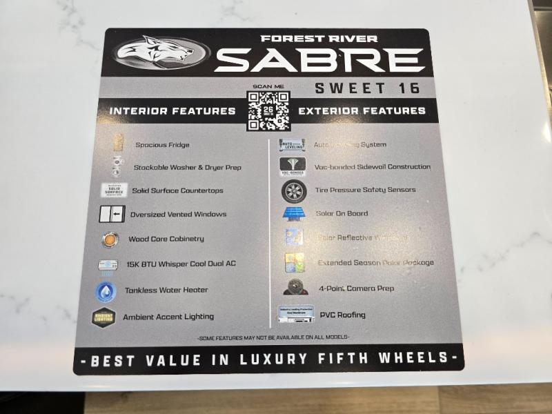You will experience luxurious camping trips at an affordable price with any one of these Forest River Cherokee Sabre fifth wheels! These models are durable and ready to travel anytime of the year thanks to features like the high-gloss gel-coat front cap with LED lighting, the PVC roof membrane, and the forced air underbelly with enclosed gate valves. The electric auto-leveling system makes setting up easy and safe, and the adjustable power awning with LED lighting will create an inviting outdoor living space. Each model includes a universal docking station which includes a black tank flush and an outside shower, and adjustable stable steps for you to enter and exit the unit safely. Inside, you will love the design of the ambient accent lighting in the living area, the real wood lumbercore cabinetry, and the linoleum flooring!