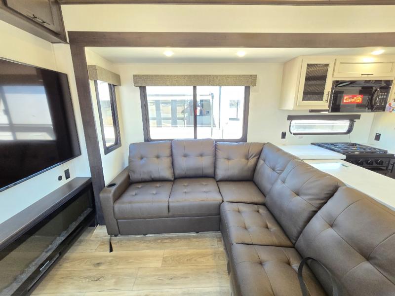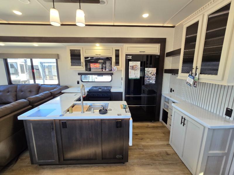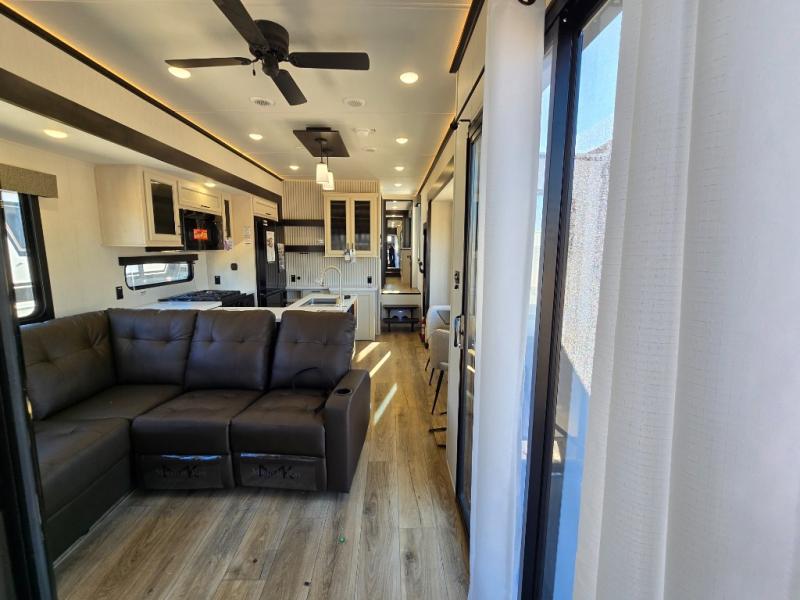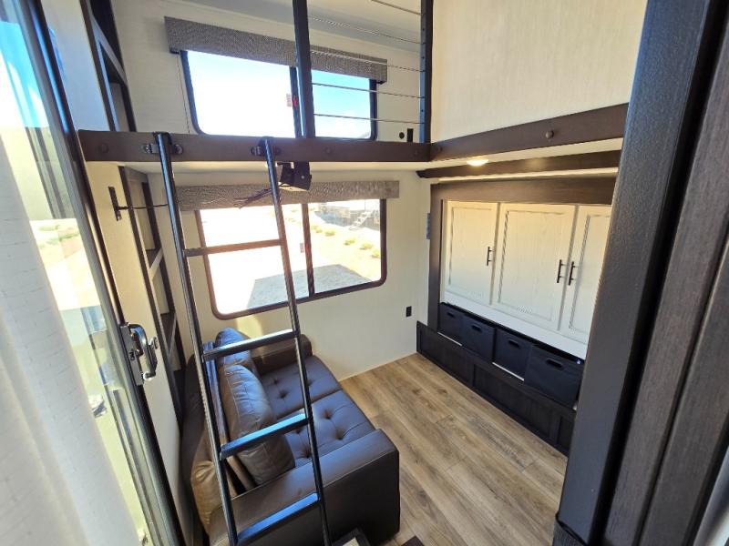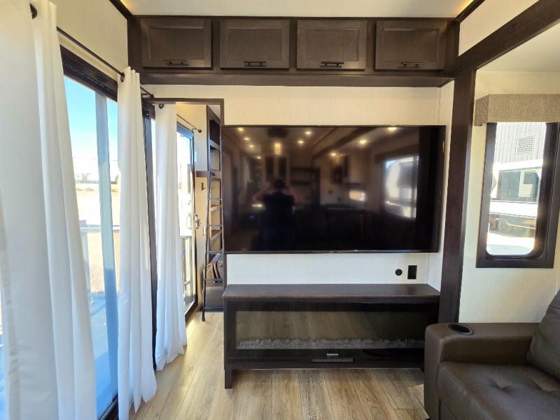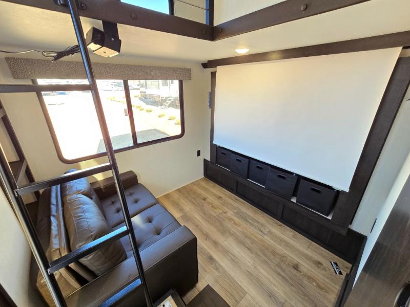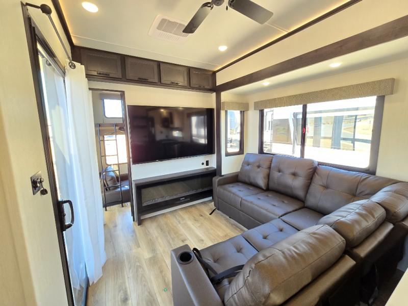 This is the perfect fifth wheel if you enjoy camping with friends and family! You'll have the front private bedroom with a camper king bed slide all to yourselves, while your guests take the rear den. There is a tri-fold sofa here, along with a wardrobe with a desk, additional shelves plus a loft above this room for even more sleeping or storage space! The main living room features an L-shaped sectional sofa, a fireplace and an entertainment center. And the patio deck with a 12' awning is right off of this room so you can visit with friends indoors or outdoors! There is generous counter space in the full kitchen, along with a pull-out storage drawer and a versatile dinette/desk. There are many more stand-out features found in this fifth wheel, including washer and dryer prep in the front bedroom, a 70" projector screen in the rear den, a second power awning, and the list goes on!