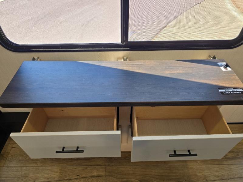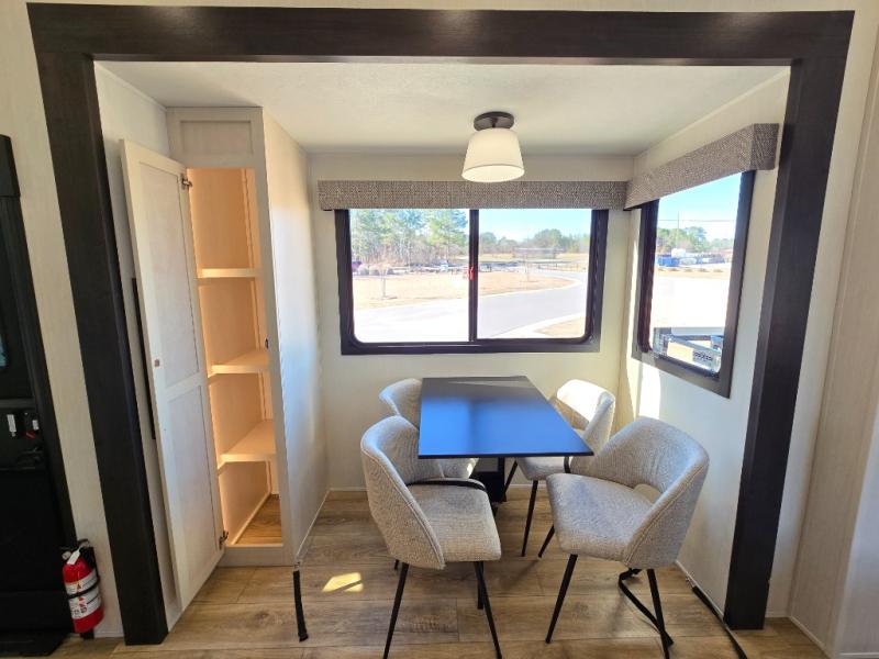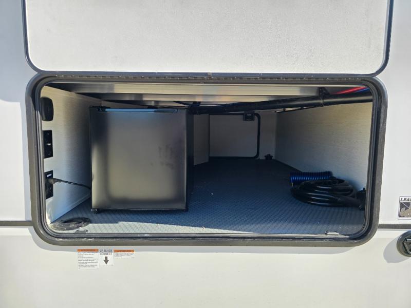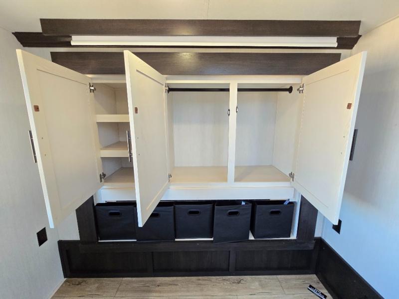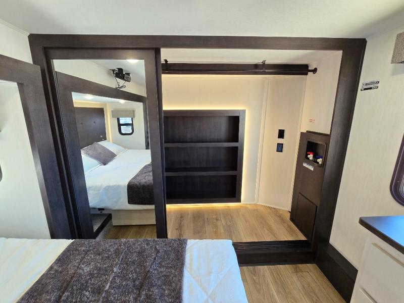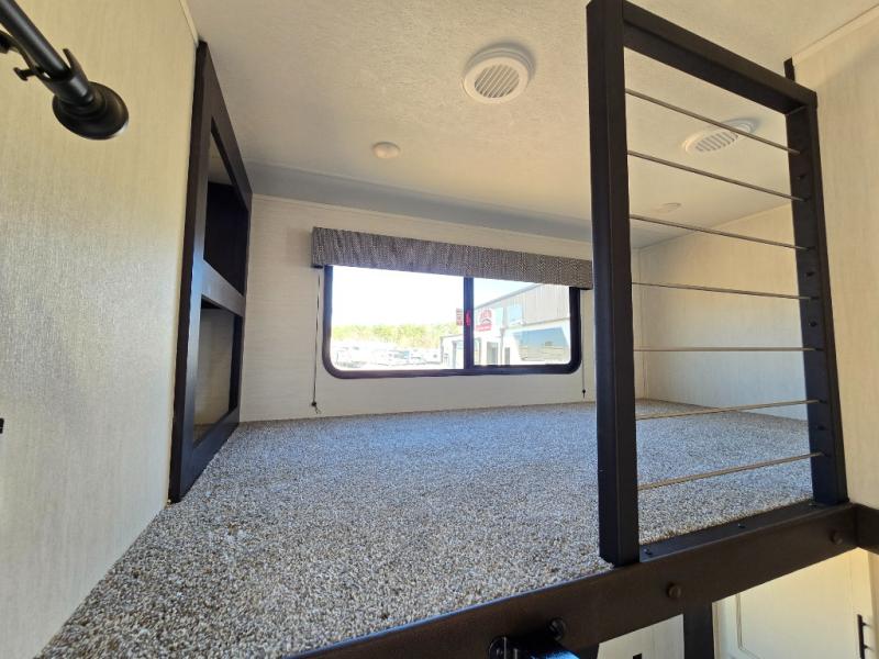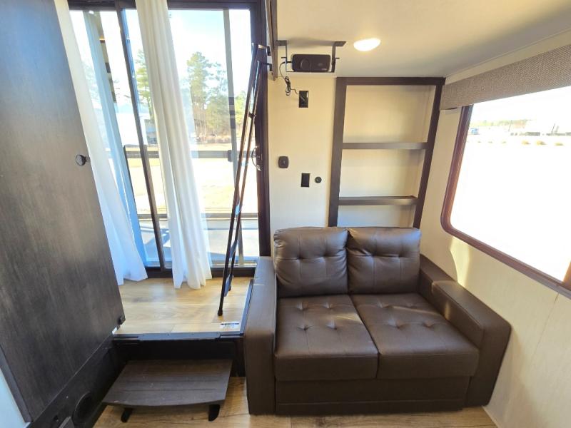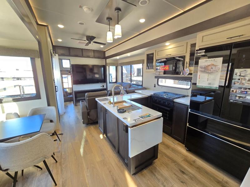 This is the perfect fifth wheel if you enjoy camping with friends and family! You'll have the front private bedroom with a camper king bed slide all to yourselves, while your guests take the rear den. There is a tri-fold sofa here, along with a wardrobe with a desk, additional shelves plus a loft above this room for even more sleeping or storage space! The main living room features an L-shaped sectional sofa, a fireplace and an entertainment center. And the patio deck with a 12' awning is right off of this room so you can visit with friends indoors or outdoors! There is generous counter space in the full kitchen, along with a pull-out storage drawer and a versatile dinette/desk. There are many more stand-out features found in this fifth wheel, including washer and dryer prep in the front bedroom, a 70" projector screen in the rear den, a second power awning, and the list goes on!