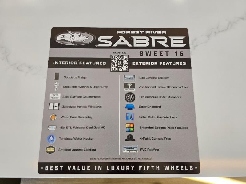 You will experience luxurious camping trips at an affordable price with any one of these Forest River Cherokee Sabre fifth wheels! These models are durable and ready to travel anytime of the year thanks to features like the high-gloss gel-coat front cap with LED lighting, the PVC roof membrane, and the forced air underbelly with enclosed gate valves. The electric auto-leveling system makes setting up easy and safe, and the adjustable power awning with LED lighting will create an inviting outdoor living space. Each model includes a universal docking station which includes a black tank flush and an outside shower, and adjustable stable steps for you to enter and exit the unit safely. Inside, you will love the design of the ambient accent lighting in the living area, the real wood lumbercore cabinetry, and the linoleum flooring!