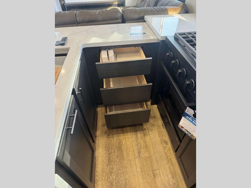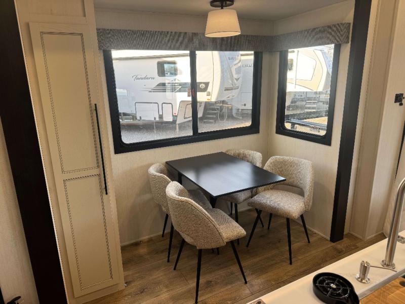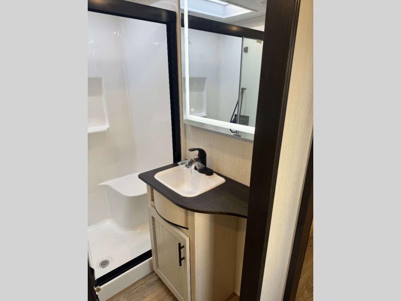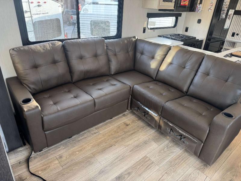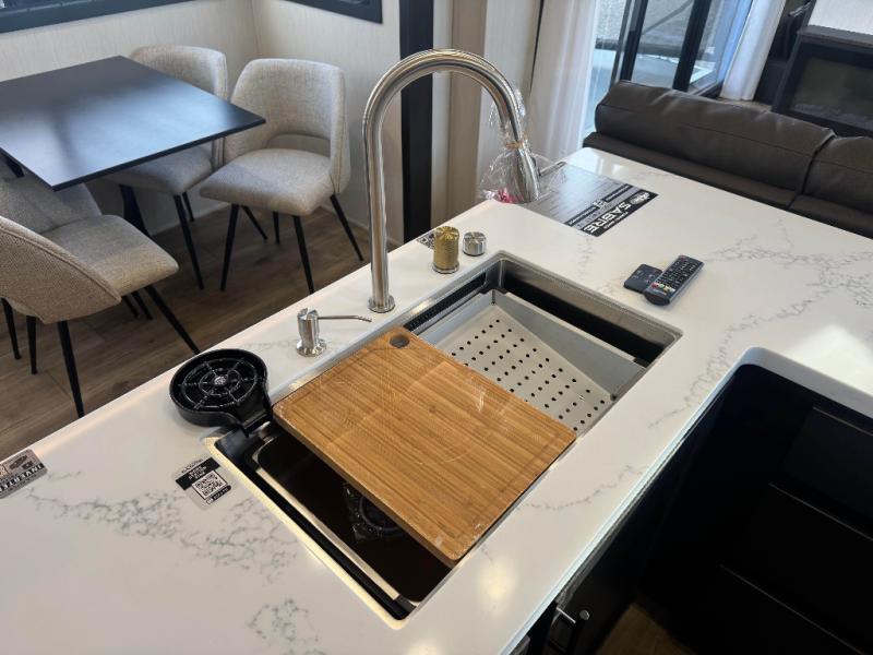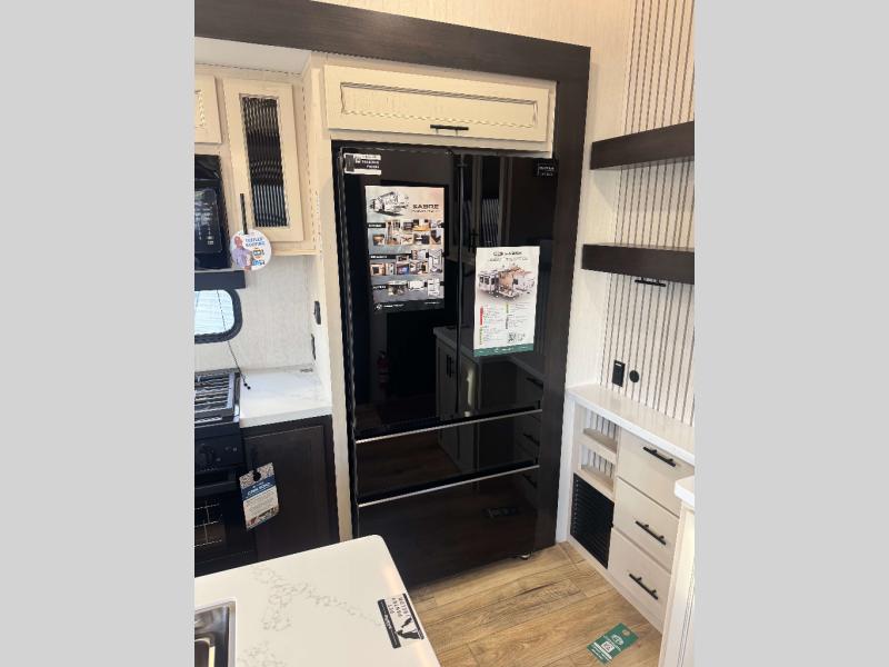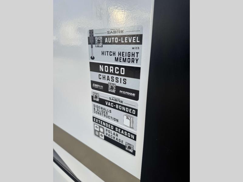 You will experience luxurious camping trips at an affordable price with any one of these Forest River Cherokee Sabre fifth wheels! These models are durable and ready to travel anytime of the year thanks to features like the high-gloss gel-coat front cap with LED lighting, the PVC roof membrane, and the forced air underbelly with enclosed gate valves. The electric auto-leveling system makes setting up easy and safe, and the adjustable power awning with LED lighting will create an inviting outdoor living space. Each model includes a universal docking station which includes a black tank flush and an outside shower, and adjustable stable steps for you to enter and exit the unit safely. Inside, you will love the design of the ambient accent lighting in the living area, the real wood lumbercore cabinetry, and the linoleum flooring!