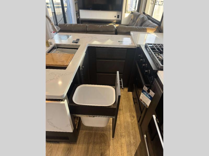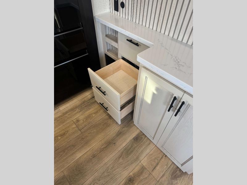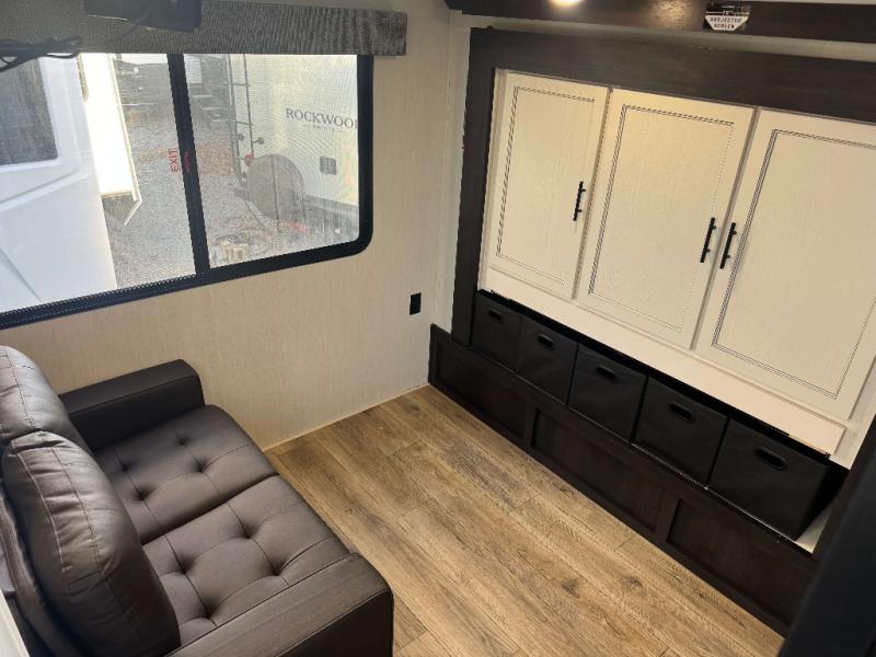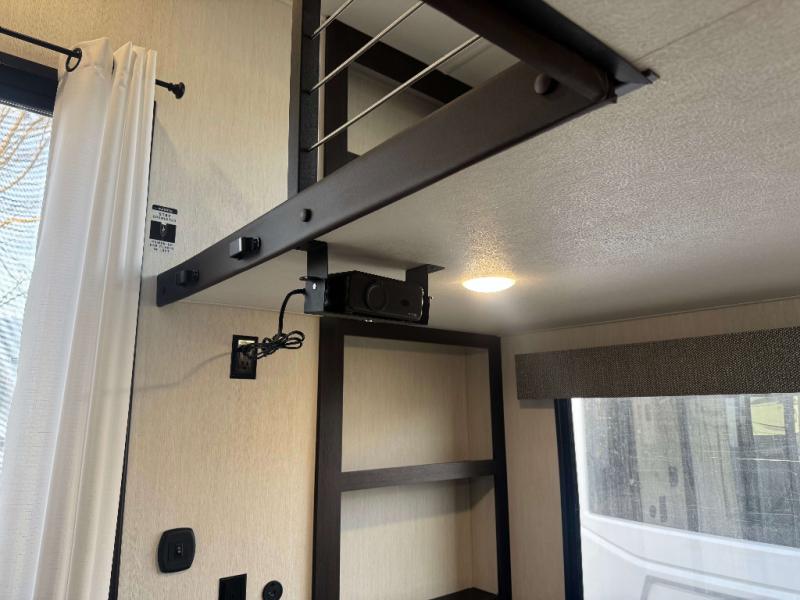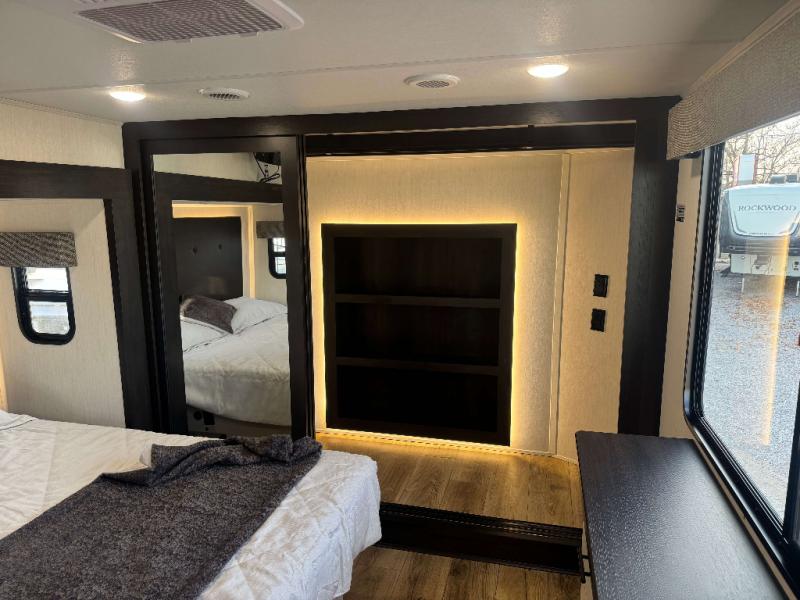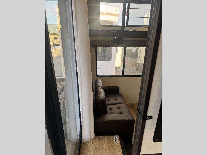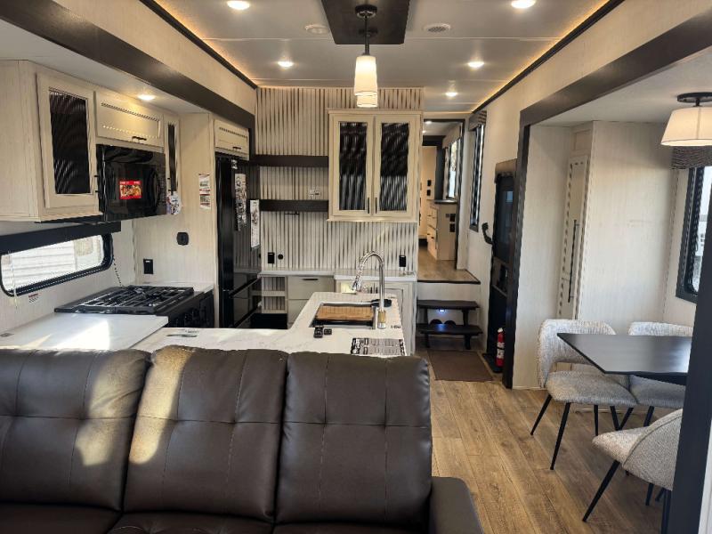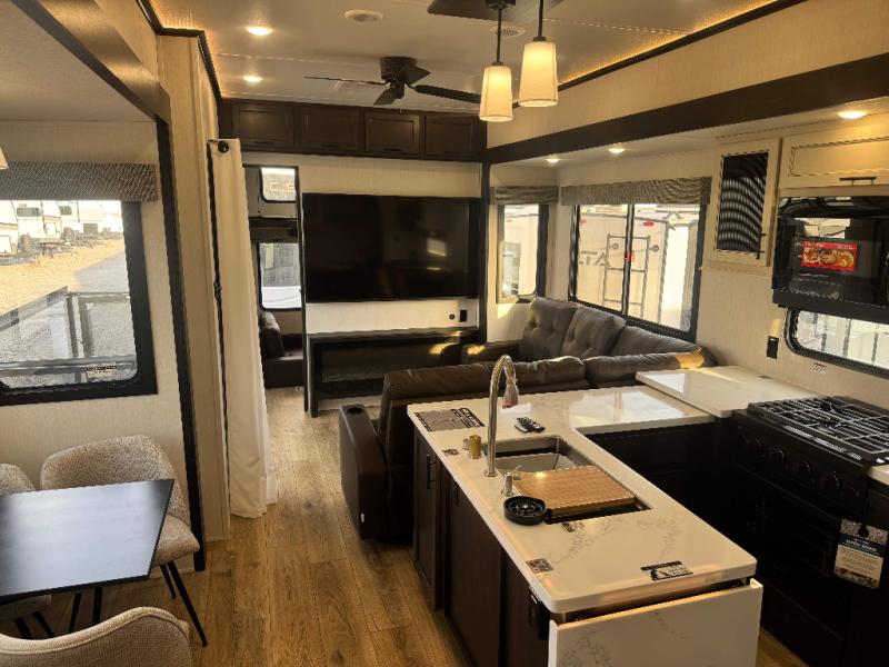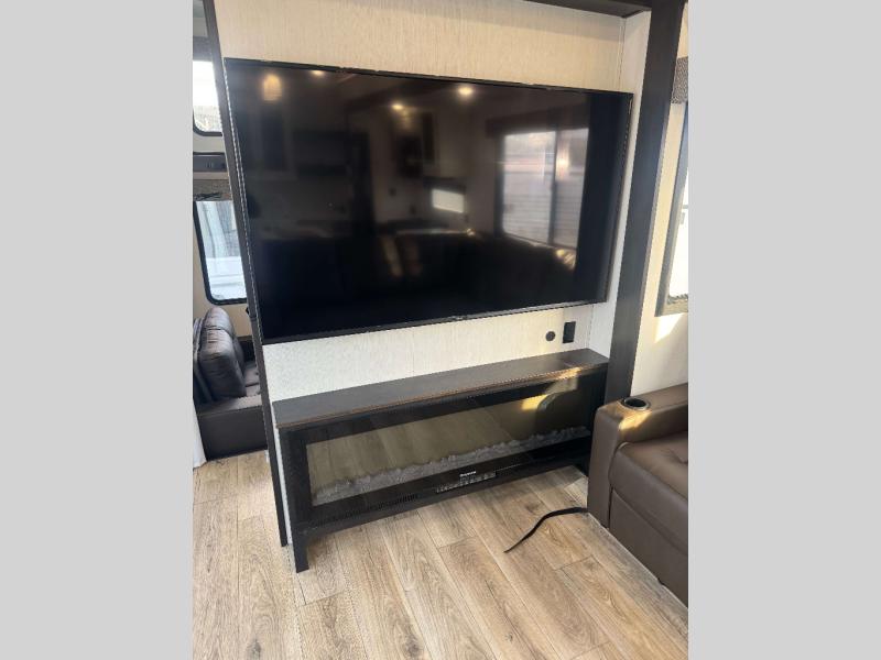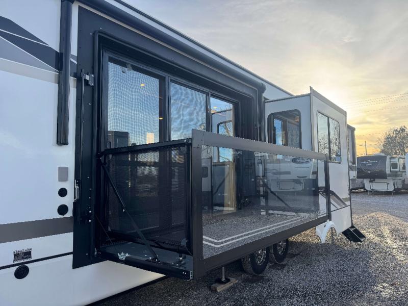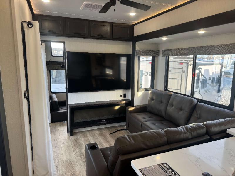 This is the perfect fifth wheel if you enjoy camping with friends and family! You'll have the front private bedroom with a camper king bed slide all to yourselves, while your guests take the rear den. There is a tri-fold sofa here, along with a wardrobe with a desk, additional shelves plus a loft above this room for even more sleeping or storage space! The main living room features an L-shaped sectional sofa, a fireplace and an entertainment center. And the patio deck with a 12' awning is right off of this room so you can visit with friends indoors or outdoors! There is generous counter space in the full kitchen, along with a pull-out storage drawer and a versatile dinette/desk. There are many more stand-out features found in this fifth wheel, including washer and dryer prep in the front bedroom, a 70" projector screen in the rear den, a second power awning, and the list goes on!