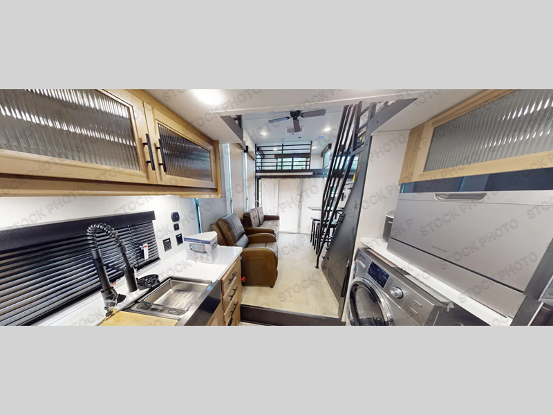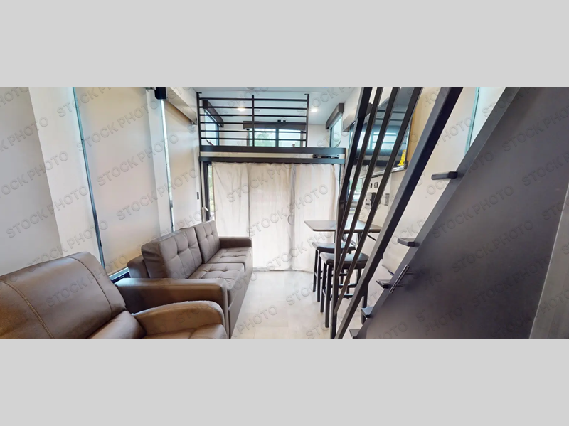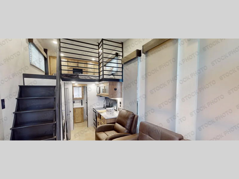 You will fall in love with this mini-loft destination trailer that will feel more like a tiny home. There are steps leading up to the loft with a queen bed, cabinets, and even a fireplace! The kitchen includes a cooktop and a microwave oven to prepare meals, plus a refrigerator to keep perishables fresh. You'll enjoy relaxing on the hide-a-bed sofa, dining at the high top table, or reading a book on the lounge chair. There is also a rear deck with patio doors where you can spend your evenings together, and there is even a second loft above the deck for added sleeping or storage space!