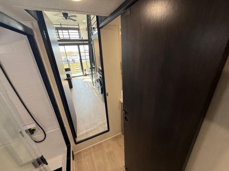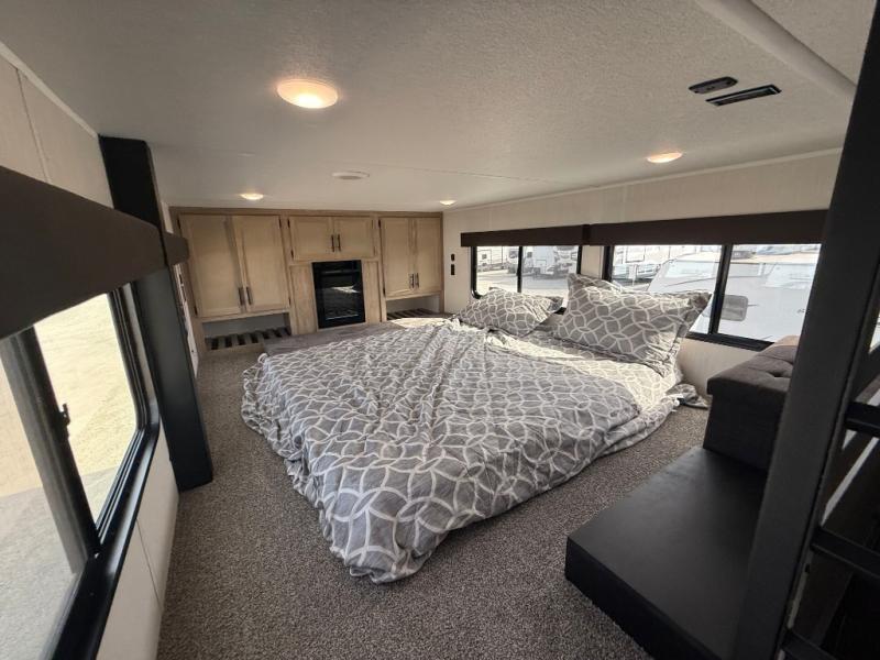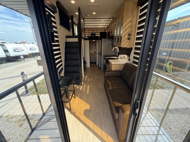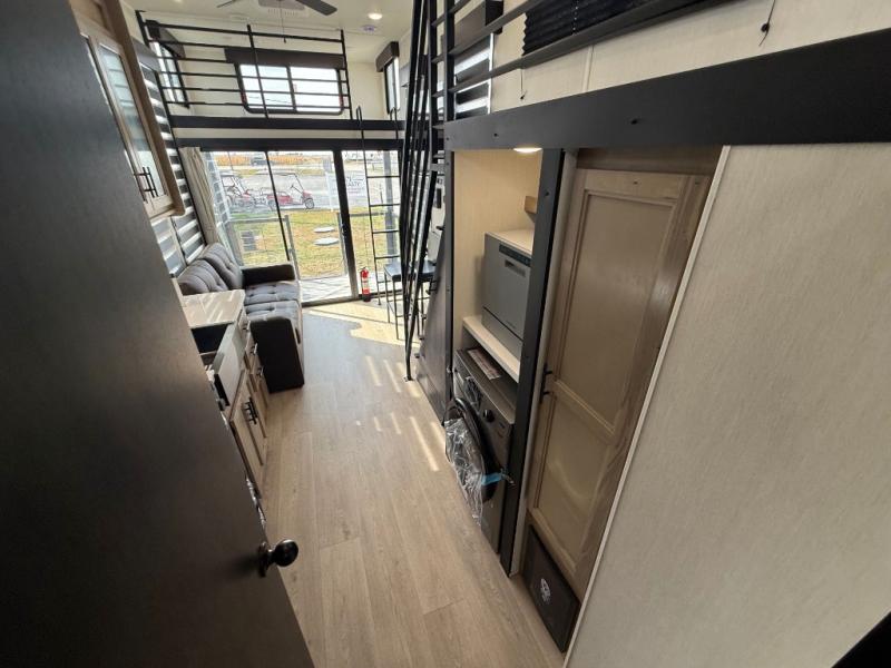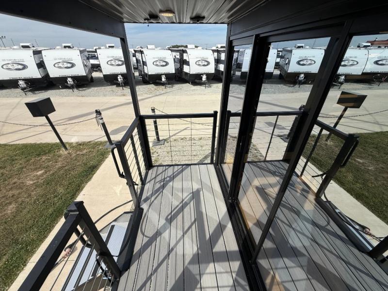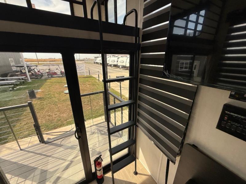This model is similar to 16ML but larger! A bigger bathroom, king bed in the lower master, and a queen bed plus a twin bunk mat in the front loft. There is an 18 cu. ft. refrigerator so you can stock up for a week long vacation, a hide-a-bed sofa that can transform into added sleeping for guests, and a high top table with two stools to dine at. A ladder allows access into the upper front loft that is over the covered patio. The bathroom below is split with a shower on one side, and a private toilet area and sink opposite. And the view is amazing from just about anywhere inside.
