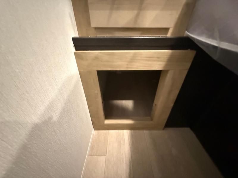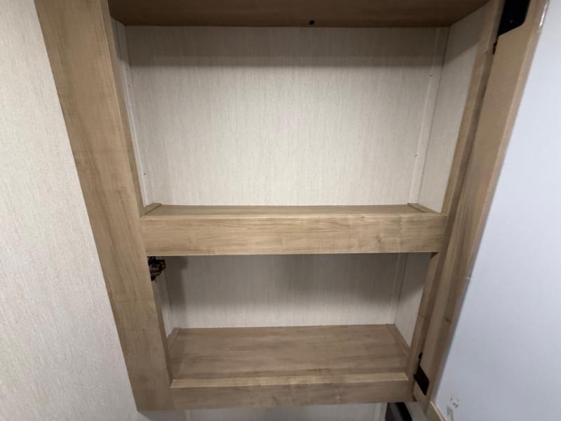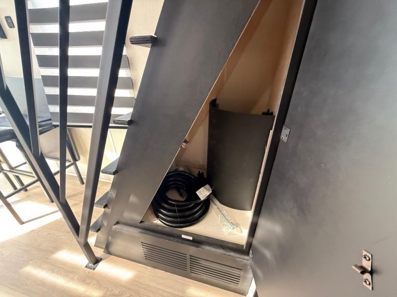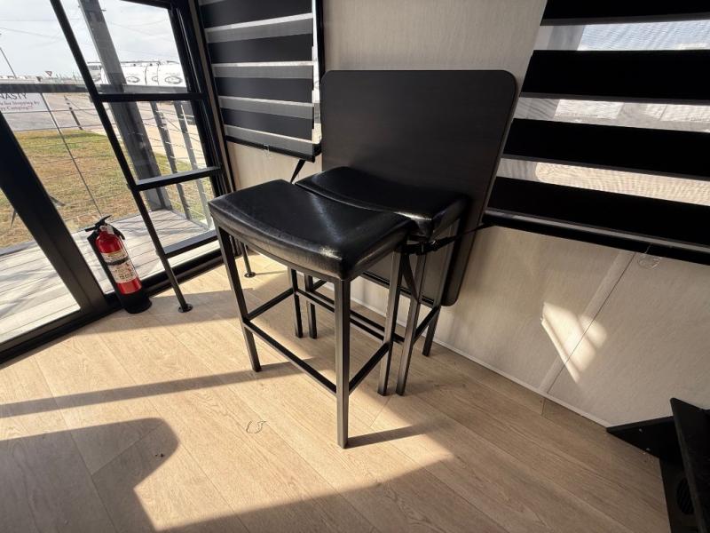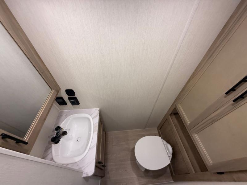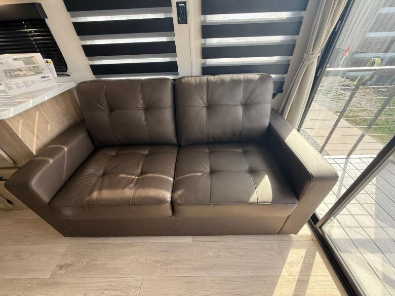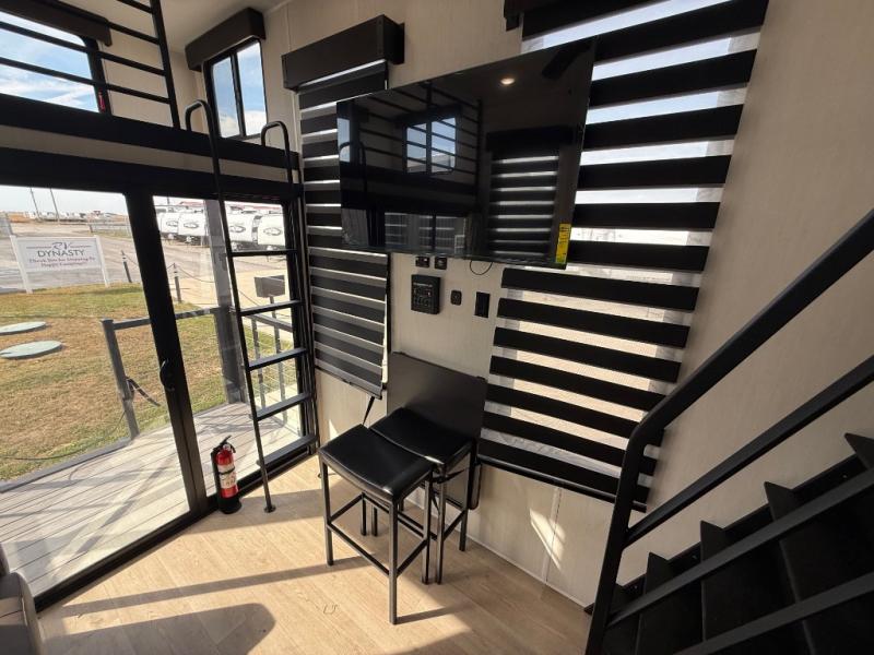 This model is similar to 16ML but larger! A bigger bathroom, king bed in the lower master, and a queen bed plus a twin bunk mat in the front loft. There is an 18 cu. ft. refrigerator so you can stock up for a week long vacation, a hide-a-bed sofa that can transform into added sleeping for guests, and a high top table with two stools to dine at. A ladder allows access into the upper front loft that is over the covered patio. The bathroom below is split with a shower on one side, and a private toilet area and sink opposite. And the view is amazing from just about anywhere inside.