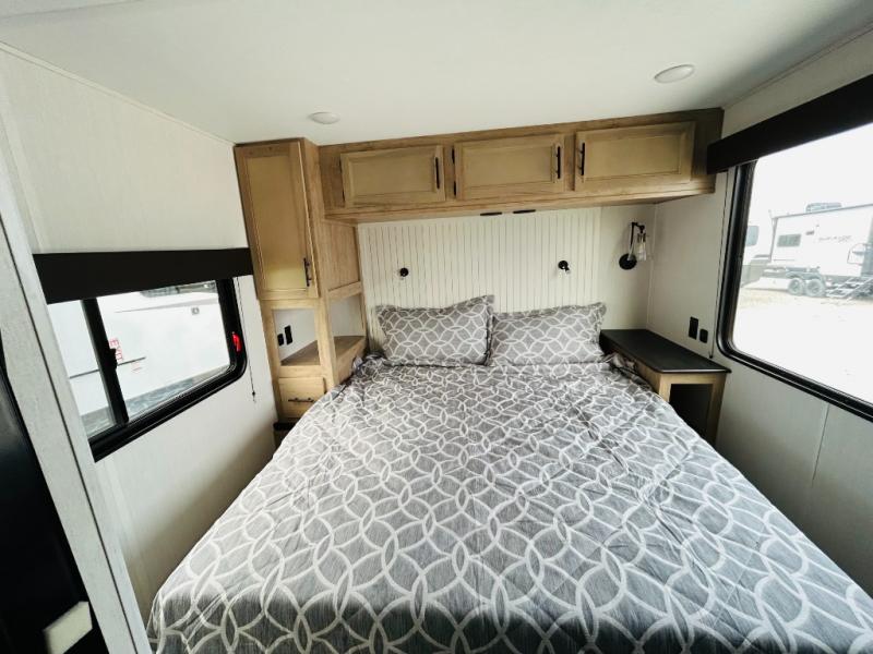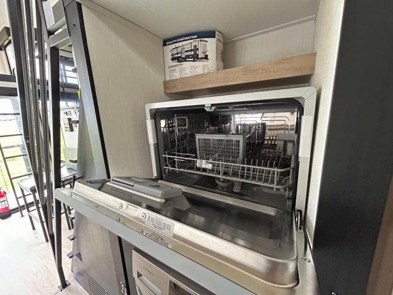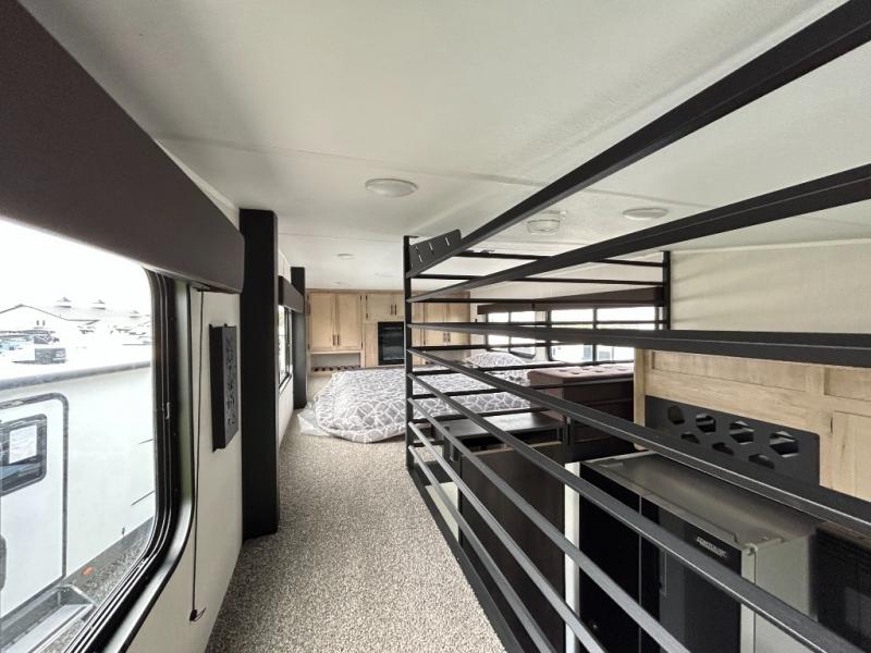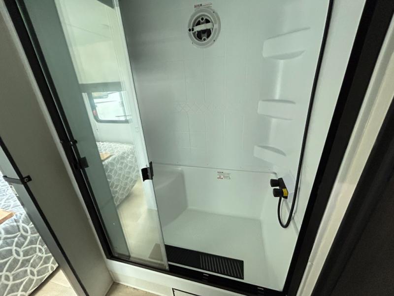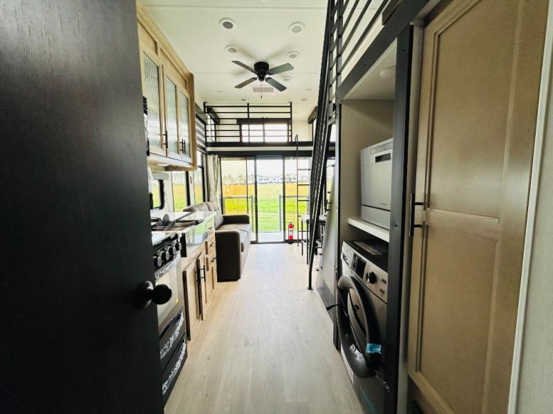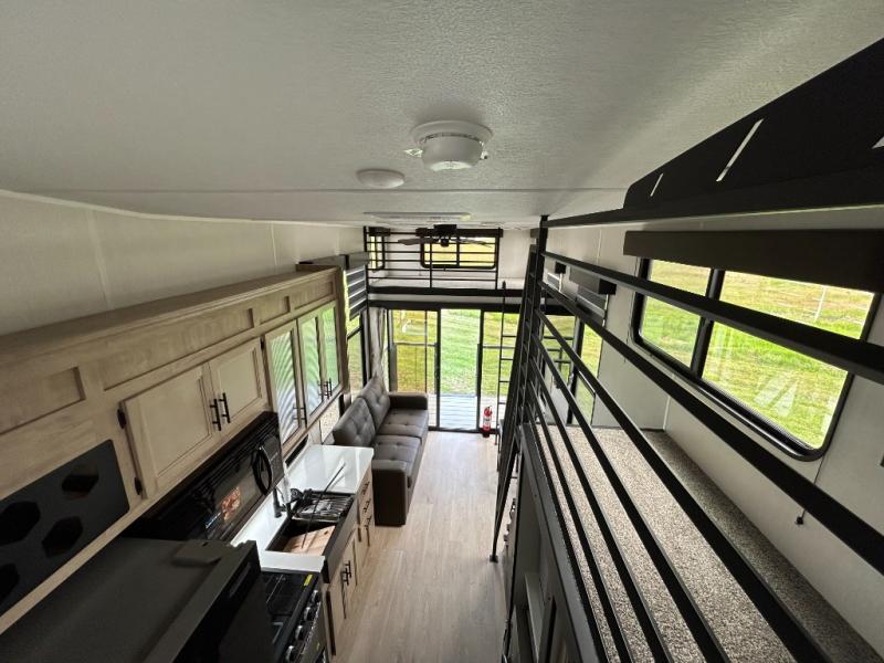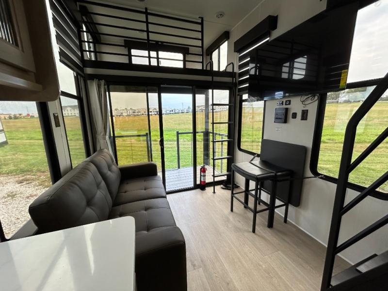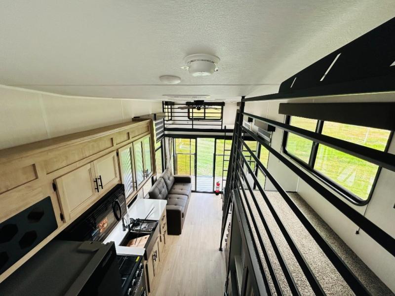 This model is similar to 16ML but larger! A bigger bathroom, RV king bed in the lower master, and a queen bed plus a twin bunk mat in the front loft. And the second loft can be utilized as extra sleeping space or storage space! There is an 18 cu. ft. refrigerator so you can stock up for a week long vacation, a hide-a-bed sofa that can transform into added sleeping for guests, and a high top table with two stools to dine at. The bathroom below is split with a shower on one side, and a private toilet area and sink opposite. And the view is amazing from just about anywhere inside.
