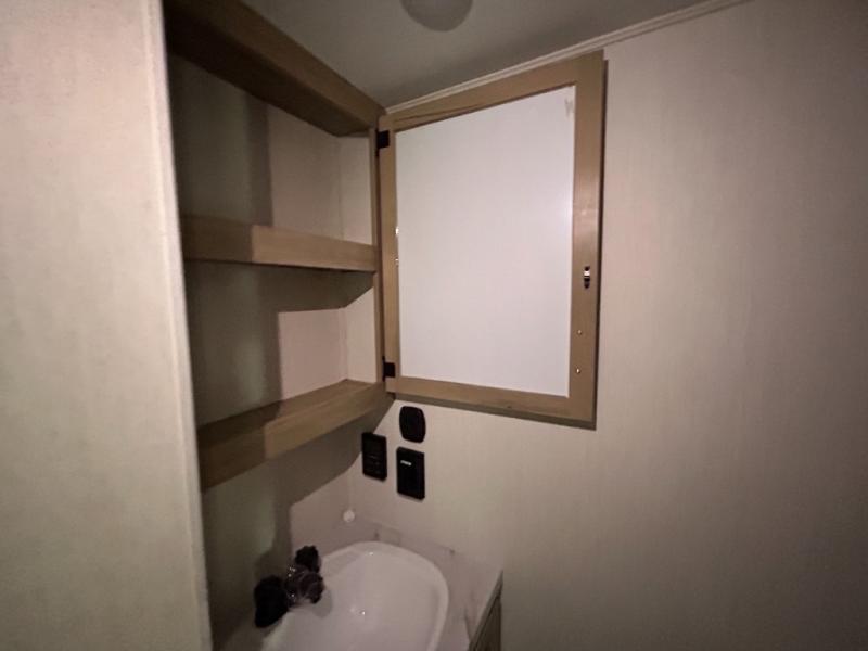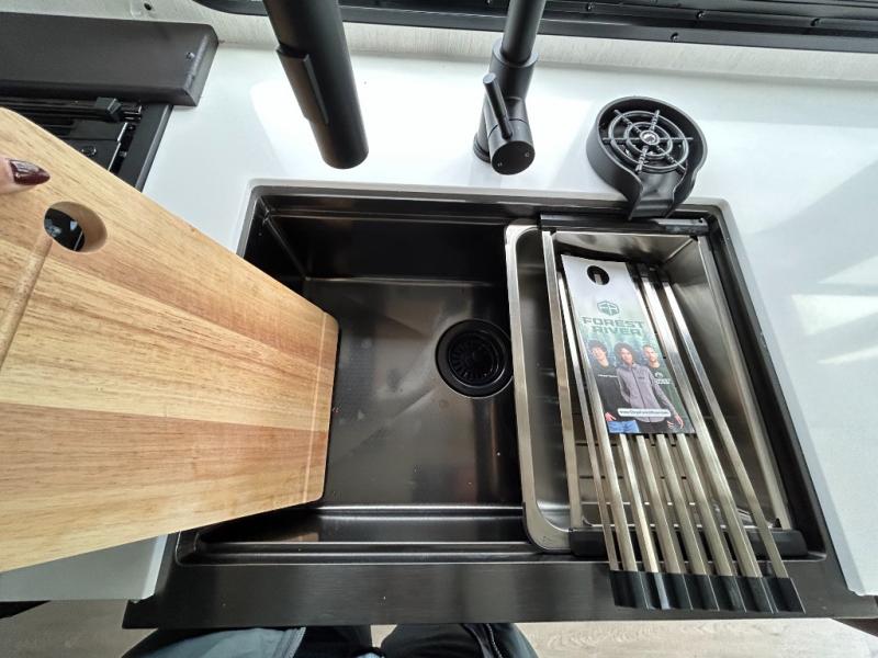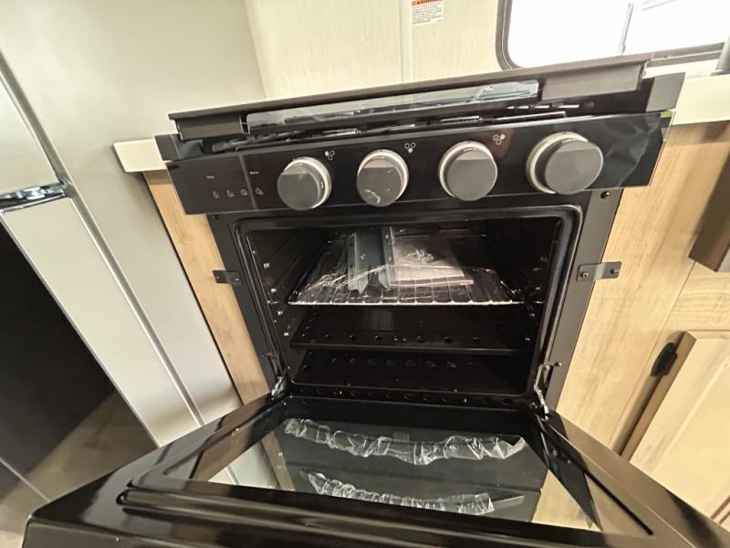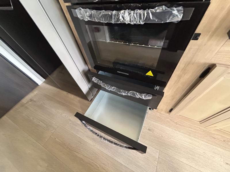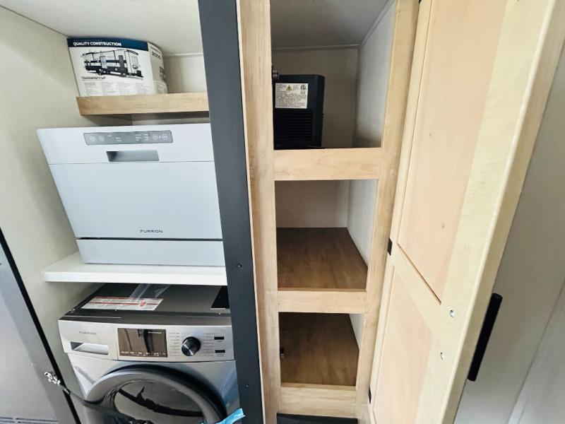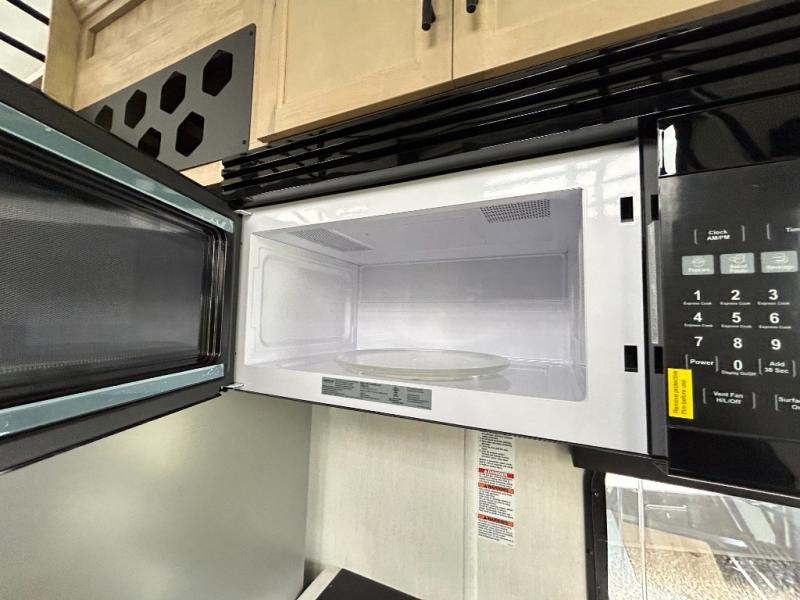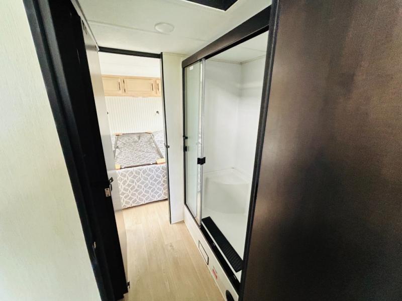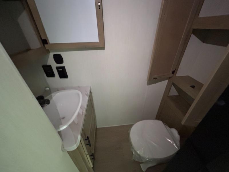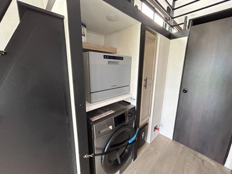 This model is similar to 16ML but larger! A bigger bathroom, RV king bed in the lower master, and a queen bed plus a twin bunk mat in the front loft. And the second loft can be utilized as extra sleeping space or storage space! There is an 18 cu. ft. refrigerator so you can stock up for a week long vacation, a hide-a-bed sofa that can transform into added sleeping for guests, and a high top table with two stools to dine at. The bathroom below is split with a shower on one side, and a private toilet area and sink opposite. And the view is amazing from just about anywhere inside.