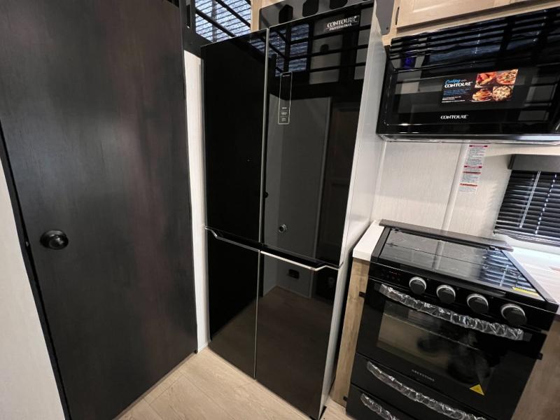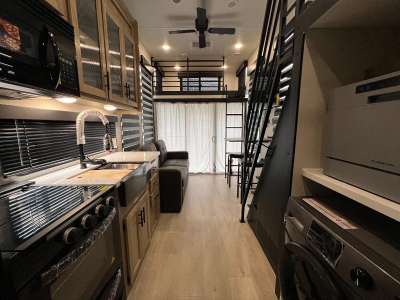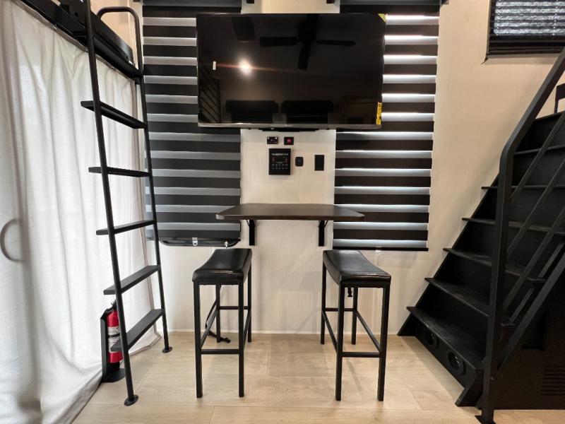 This model is similar to 16ML but larger! A bigger bathroom, king bed in the lower master, and a queen bed plus a twin bunk mat in the front loft. There is an 18 cu. ft. refrigerator so you can stock up for a week long vacation, a hide-a-bed sofa that can transform into added sleeping for guests, and a high top table with two stools to dine at. A ladder allows access into the upper front loft that is over the covered patio. The bathroom below is split with a shower on one side, and a private toilet area and sink opposite. And the view is amazing from just about anywhere inside.