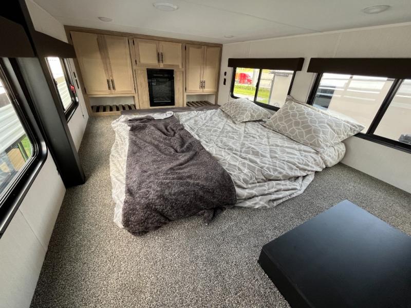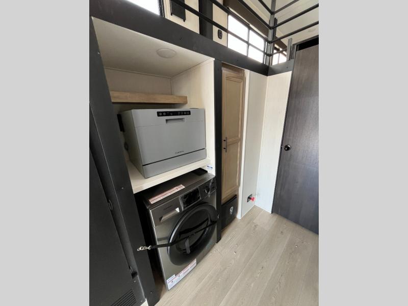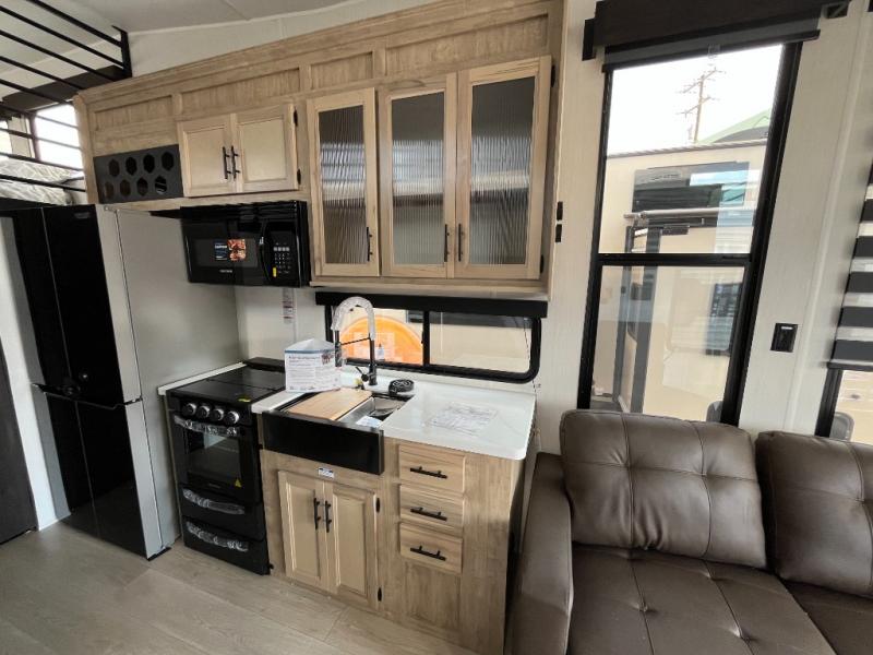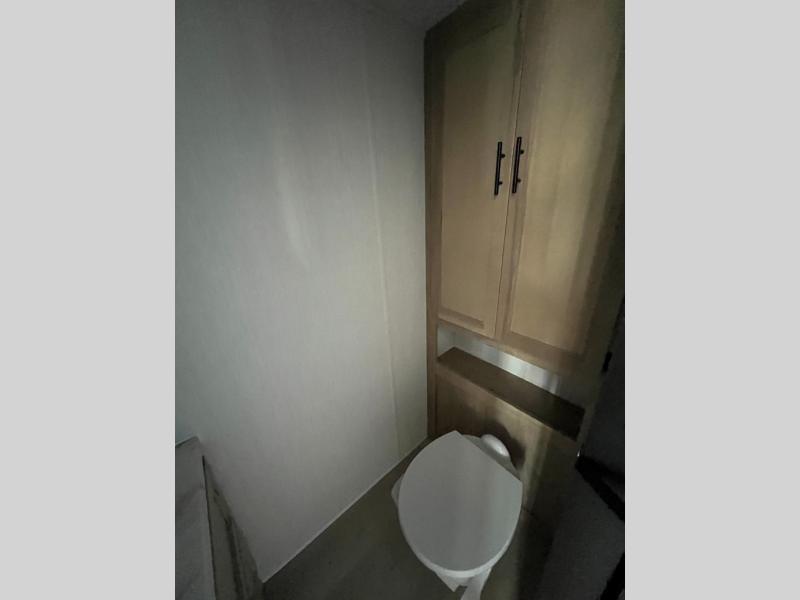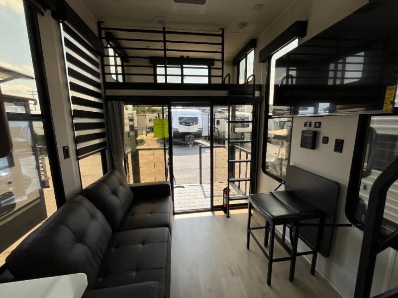 This model is similar to 16ML but larger! A bigger bathroom, king bed in the lower master, and a queen bed plus a twin bunk mat in the front loft. There is an 18 cu. ft. refrigerator so you can stock up for a week long vacation, a hide-a-bed sofa that can transform into added sleeping for guests, and a high top table with two stools to dine at. A ladder allows access into the upper front loft that is over the covered patio. The bathroom below is split with a shower on one side, and a private toilet area and sink opposite. And the view is amazing from just about anywhere inside.