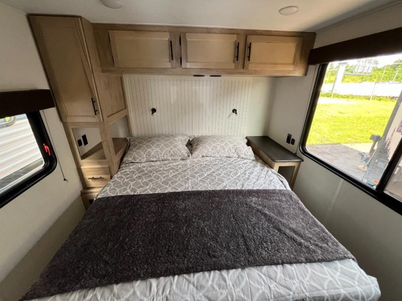 Enjoy comforts of home wherever you decide to roam in a Cherokee Timberwolf destination trailer by Forest River. The seamless roofing membrane with heat reflectivity provide a durable foundation to your RV. You will also appreciate the exclusive solar thermo controlled reflective tinted safety glass windows and an on-demand tankless water heater to make extended stays easier than ever. Inside, the night shades will provide your crew with privacy. There are also seamless countertops, along with a premium bedding ensemble and comforter, USB charging stations, a supersized central A/C unit, and many more comforts!