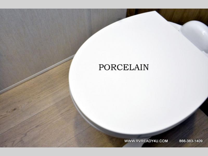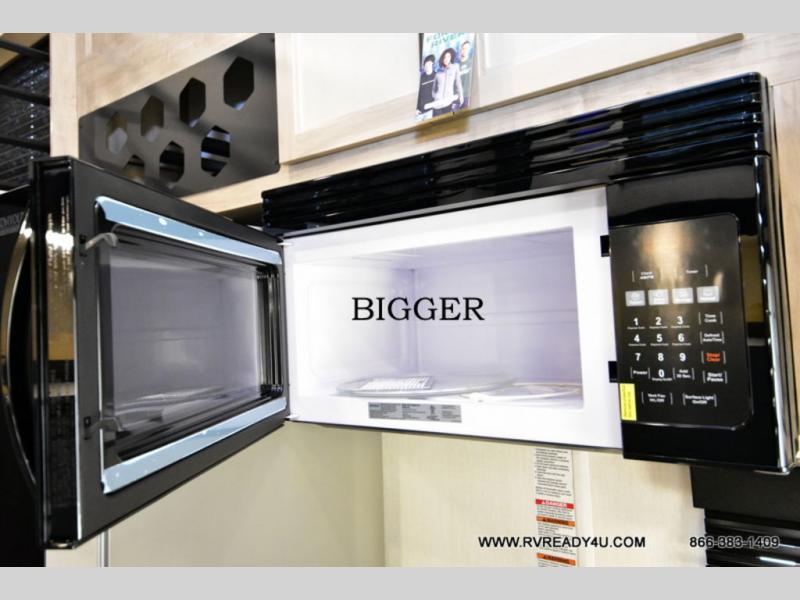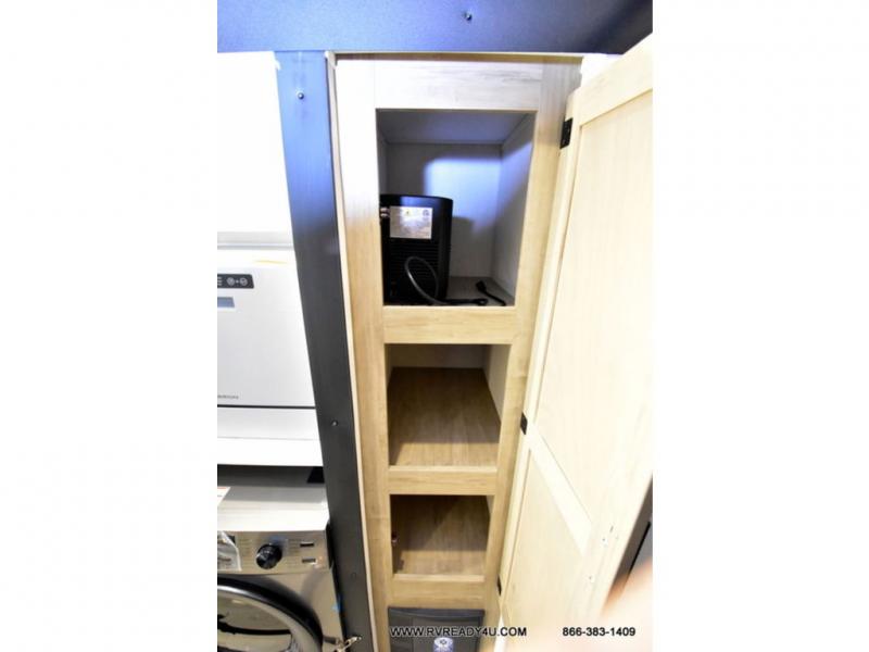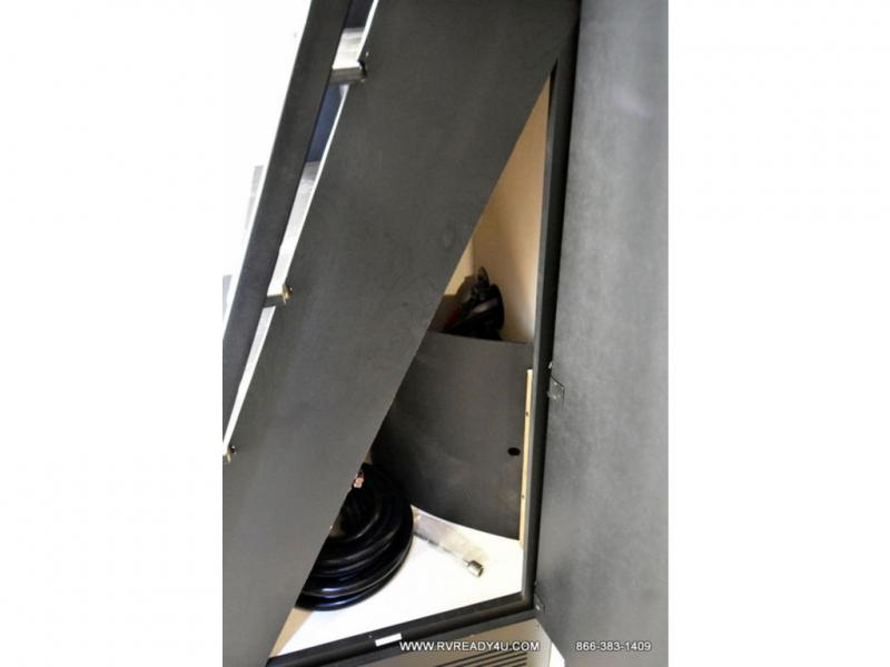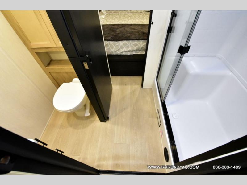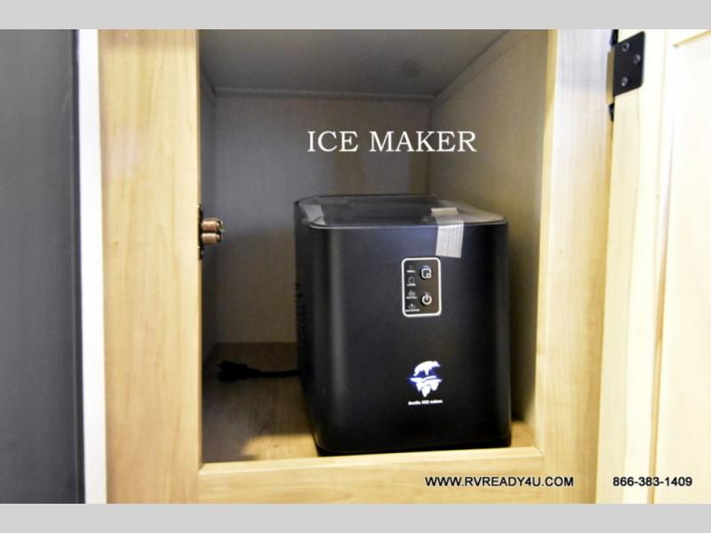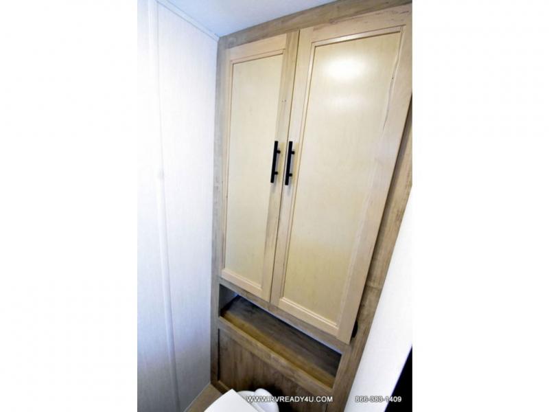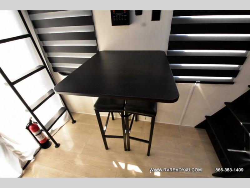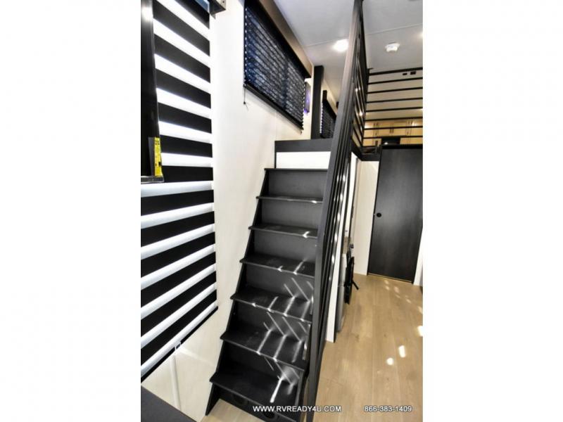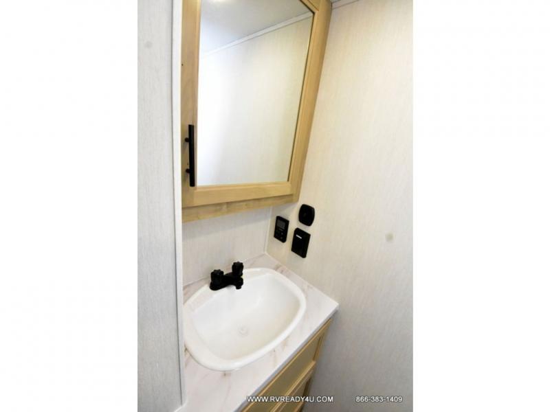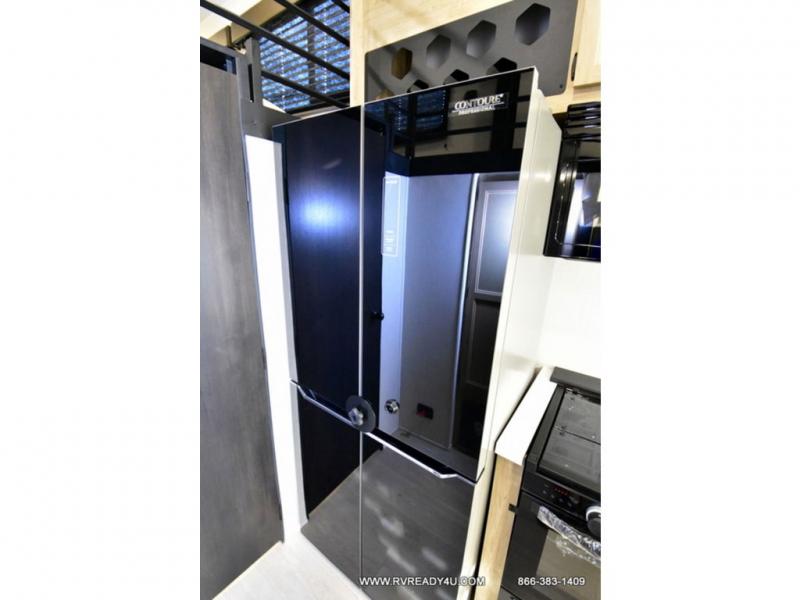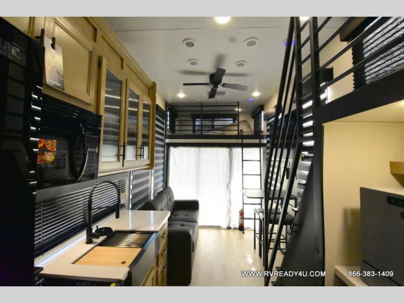 This model is similar to 16ML but larger! A bigger bathroom, king bed in the lower master, and a queen bed plus a twin bunk mat in the front loft. There is an 18 cu. ft. refrigerator so you can stock up for a week long vacation, a hide-a-bed sofa that can transform into added sleeping for guests, and a high top table with two stools to dine at. A ladder allows access into the upper front loft that is over the covered patio. The bathroom below is split with a shower on one side, and a private toilet area and sink opposite. And the view is amazing from just about anywhere inside.