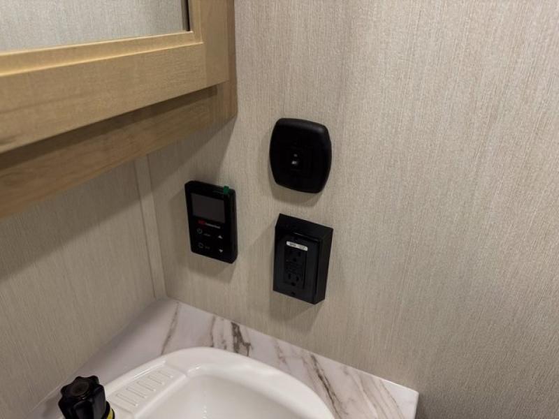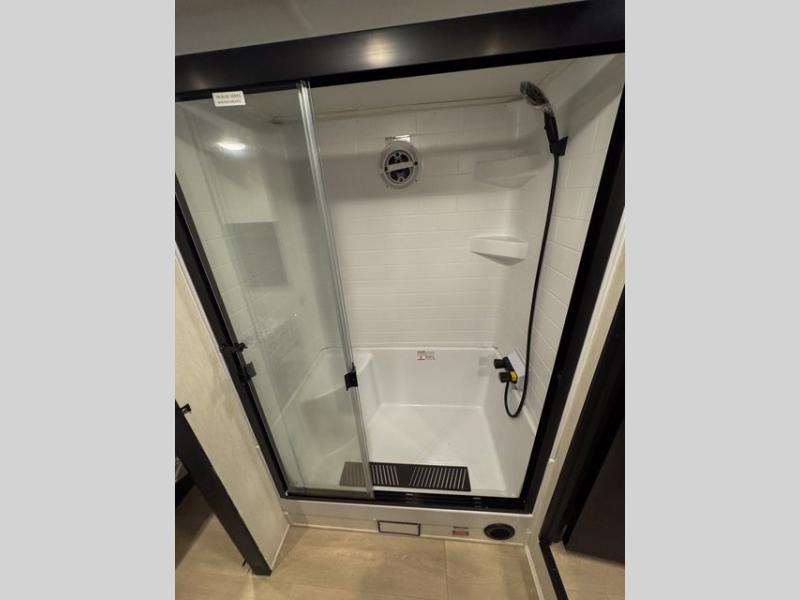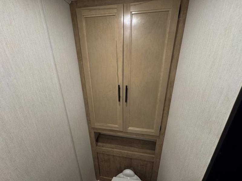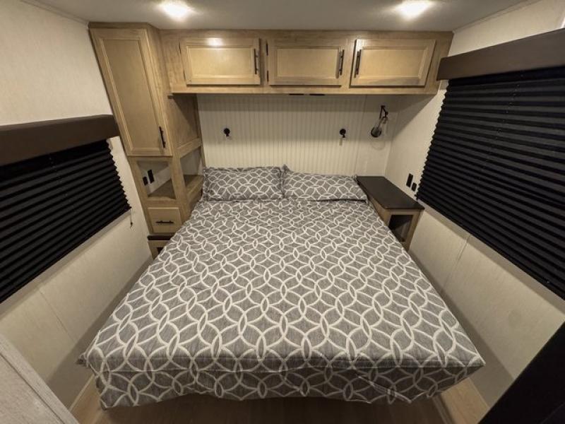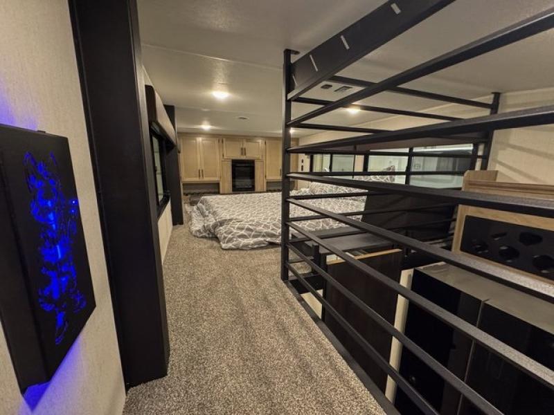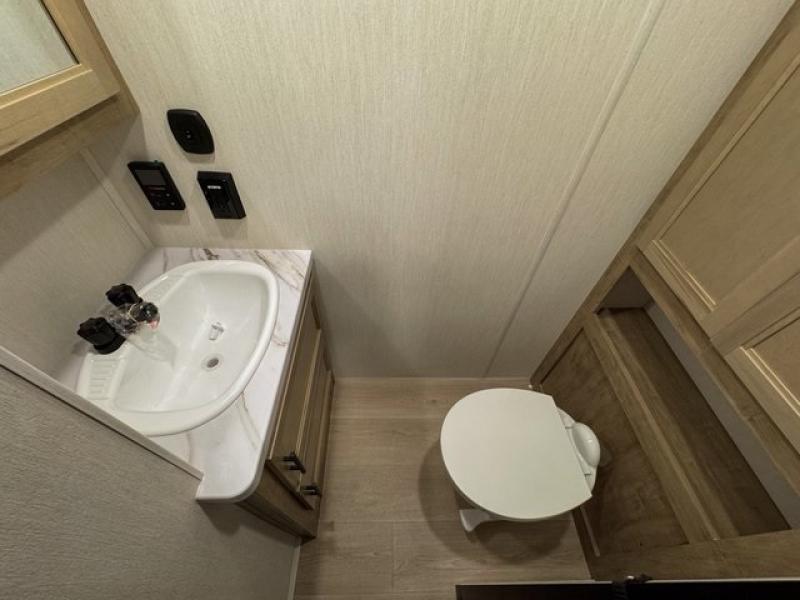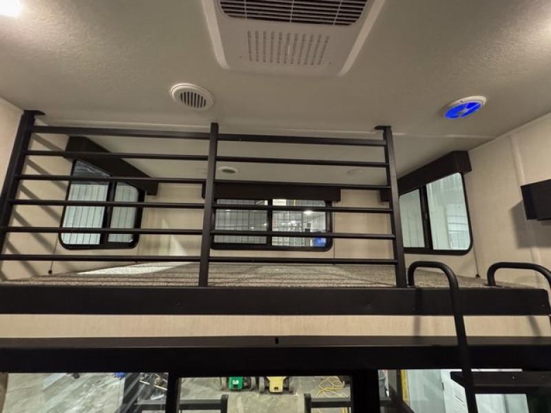 This model is similar to 16ML but larger! A bigger bathroom, RV king bed in the lower master, and a queen bed plus a twin bunk mat in the front loft. And the second loft can be utilized as extra sleeping space or storage space! There is an 18 cu. ft. refrigerator so you can stock up for a week long vacation, a hide-a-bed sofa that can transform into added sleeping for guests, and a high top table with two stools to dine at. The bathroom below is split with a shower on one side, and a private toilet area and sink opposite. And the view is amazing from just about anywhere inside.