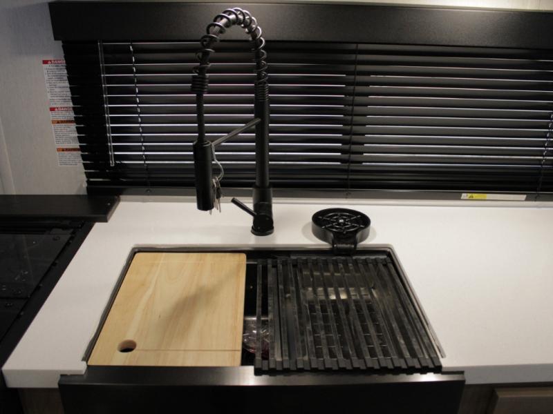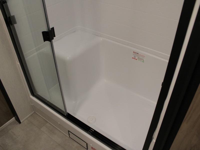 This model is similar to 16ML but larger! A bigger bathroom, RV king bed in the lower master, and a queen bed plus a twin bunk mat in the front loft. And the second loft can be utilized as extra sleeping space or storage space! There is an 18 cu. ft. refrigerator so you can stock up for a week long vacation, a hide-a-bed sofa that can transform into added sleeping for guests, and a high top table with two stools to dine at. The bathroom below is split with a shower on one side, and a private toilet area and sink opposite. And the view is amazing from just about anywhere inside.