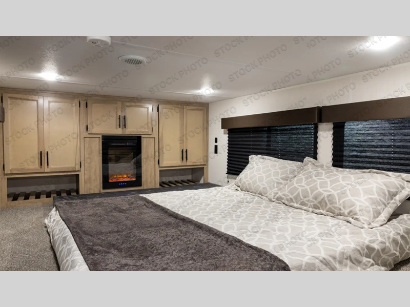 This model is similar to 16ML but larger! A bigger bathroom, RV king bed in the lower master, and a queen bed plus a twin bunk mat in the front loft. And the second loft can be utilized as extra sleeping space or storage space! There is an 18 cu. ft. refrigerator so you can stock up for a week long vacation, a hide-a-bed sofa that can transform into added sleeping for guests, and a high top table with two stools to dine at. The bathroom below is split with a shower on one side, and a private toilet area and sink opposite. And the view is amazing from just about anywhere inside.