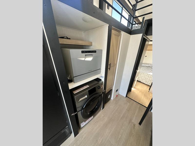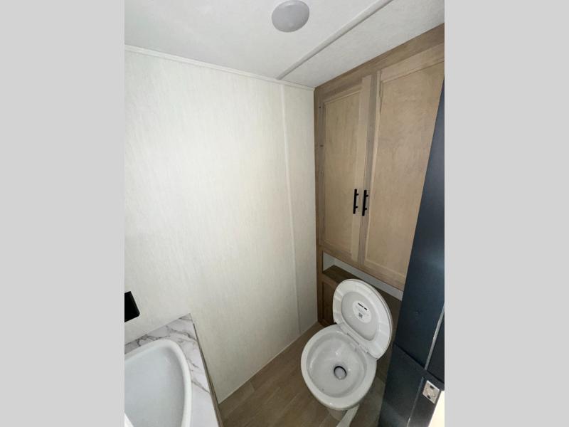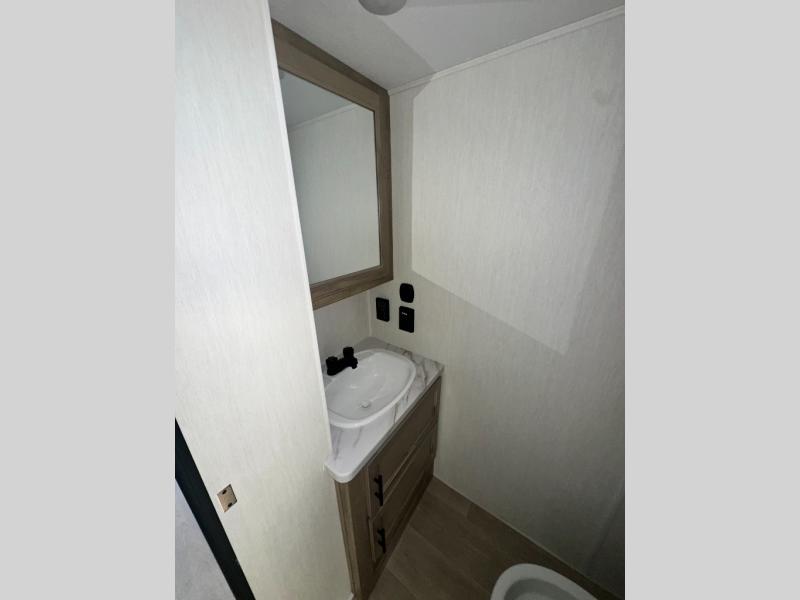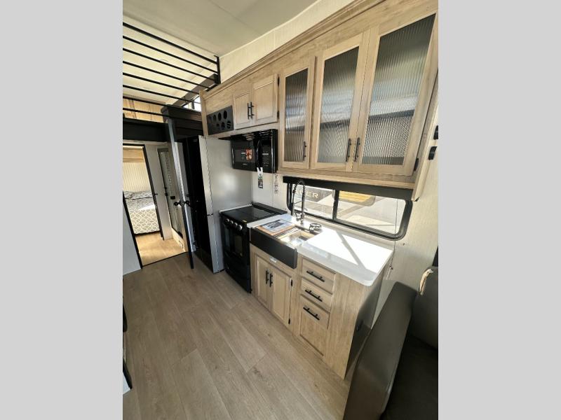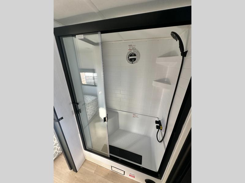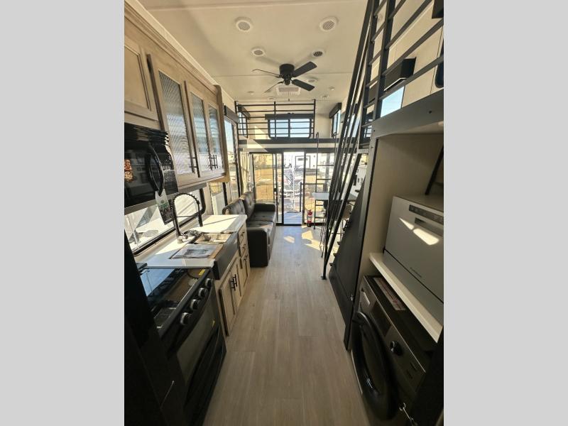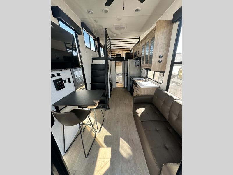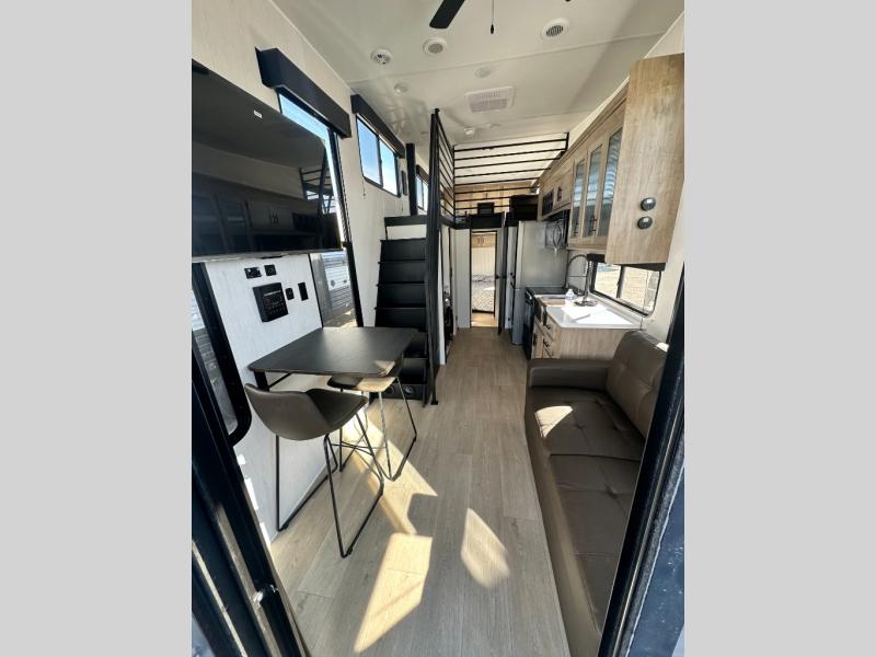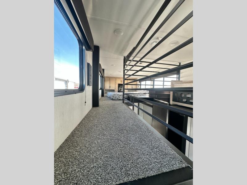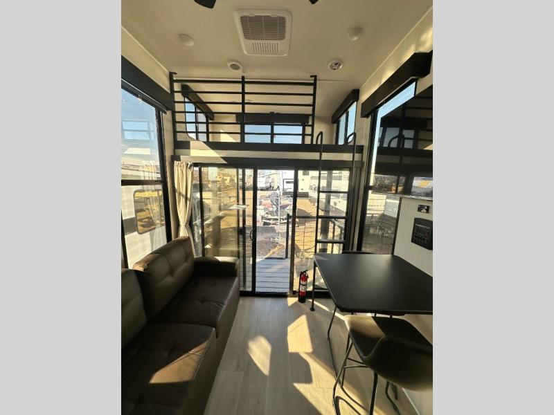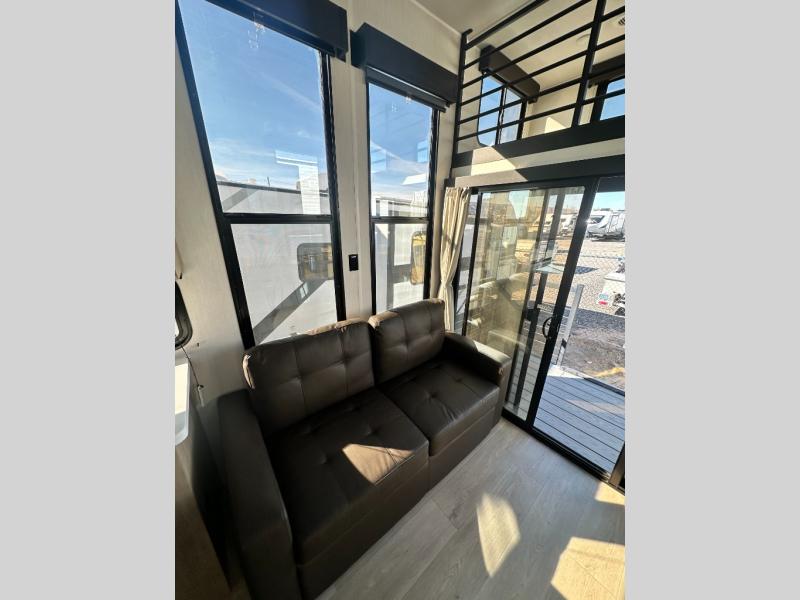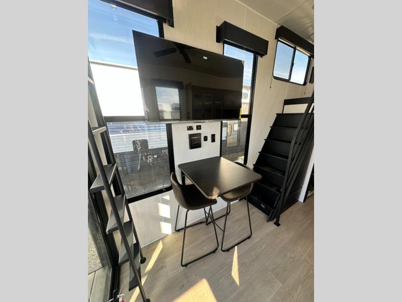 This model is similar to 16ML but larger! A bigger bathroom, RV king bed in the lower master, and a queen bed plus a twin bunk mat in the front loft. And the second loft can be utilized as extra sleeping space or storage space! There is an 18 cu. ft. refrigerator so you can stock up for a week long vacation, a hide-a-bed sofa that can transform into added sleeping for guests, and a high top table with two stools to dine at. The bathroom below is split with a shower on one side, and a private toilet area and sink opposite. And the view is amazing from just about anywhere inside.