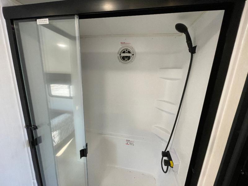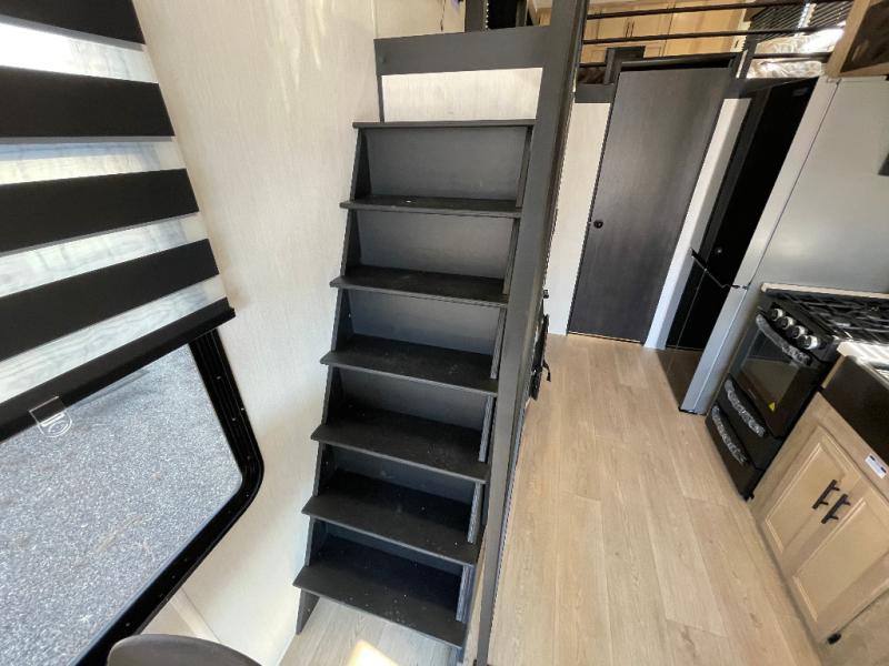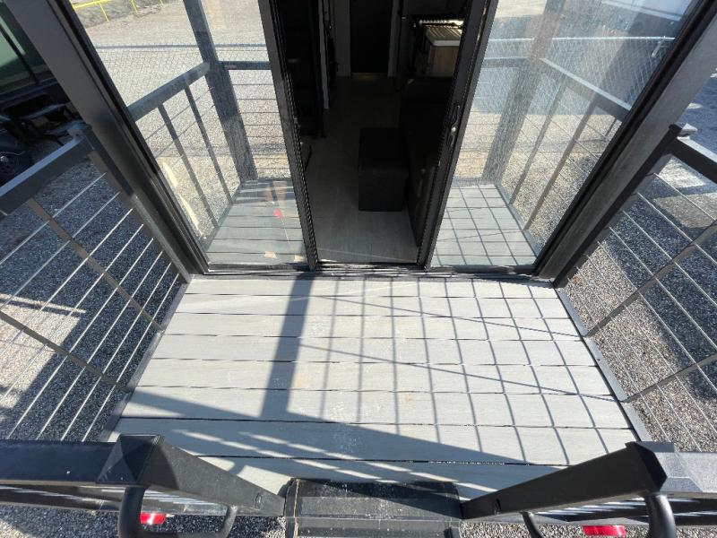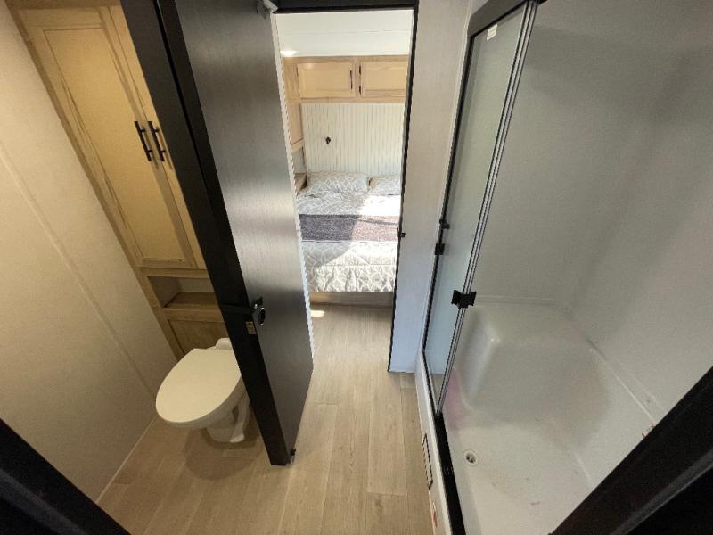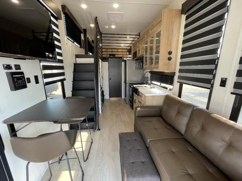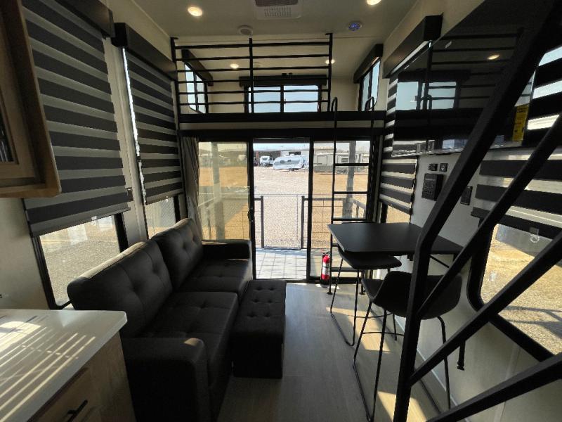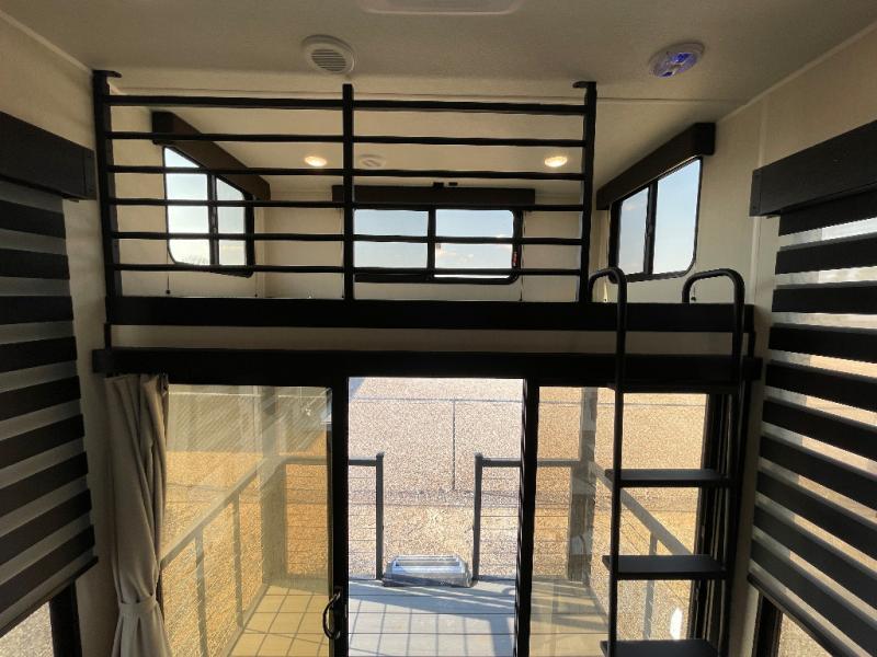 This model is similar to 16ML but larger! A bigger bathroom, RV king bed in the lower master, and a queen bed plus a twin bunk mat in the front loft. And the second loft can be utilized as extra sleeping space or storage space! There is an 18 cu. ft. refrigerator so you can stock up for a week long vacation, a hide-a-bed sofa that can transform into added sleeping for guests, and a high top table with two stools to dine at. The bathroom below is split with a shower on one side, and a private toilet area and sink opposite. And the view is amazing from just about anywhere inside.