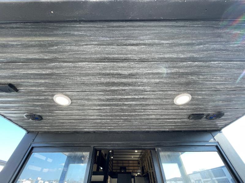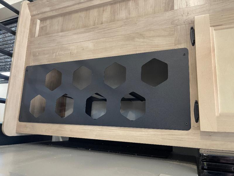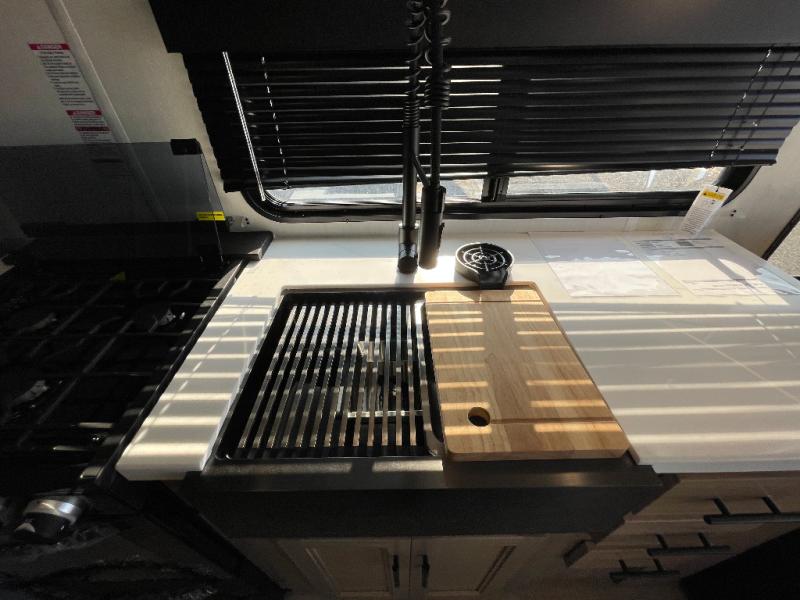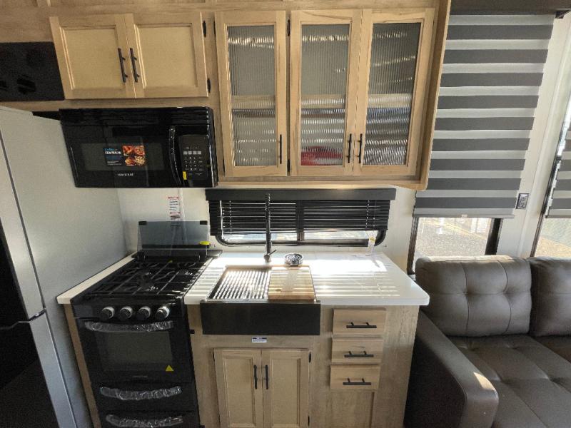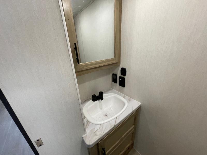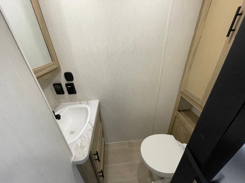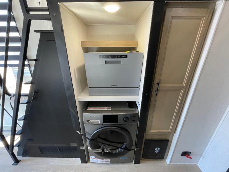 This model is similar to 16ML but larger! A bigger bathroom, RV king bed in the lower master, and a queen bed plus a twin bunk mat in the front loft. And the second loft can be utilized as extra sleeping space or storage space! There is an 18 cu. ft. refrigerator so you can stock up for a week long vacation, a hide-a-bed sofa that can transform into added sleeping for guests, and a high top table with two stools to dine at. The bathroom below is split with a shower on one side, and a private toilet area and sink opposite. And the view is amazing from just about anywhere inside.