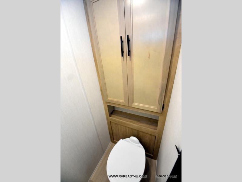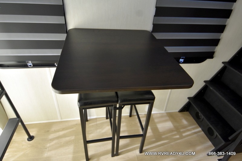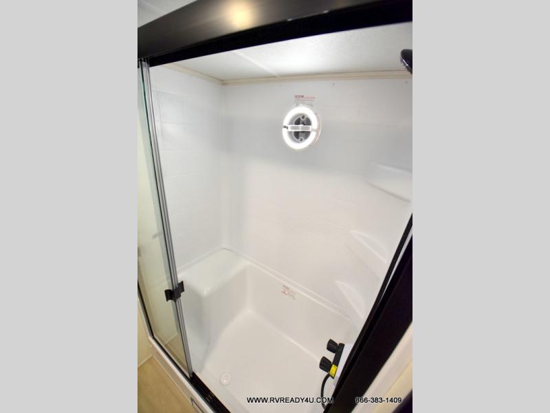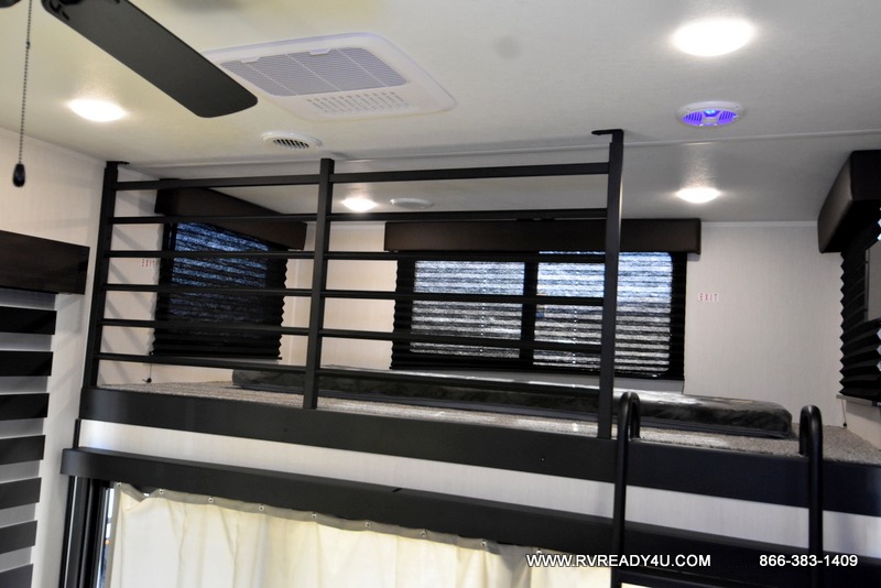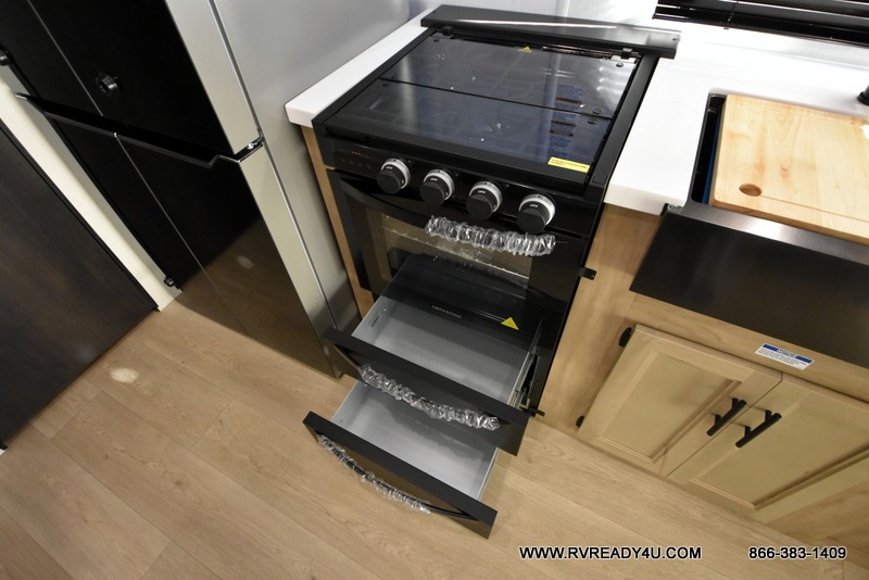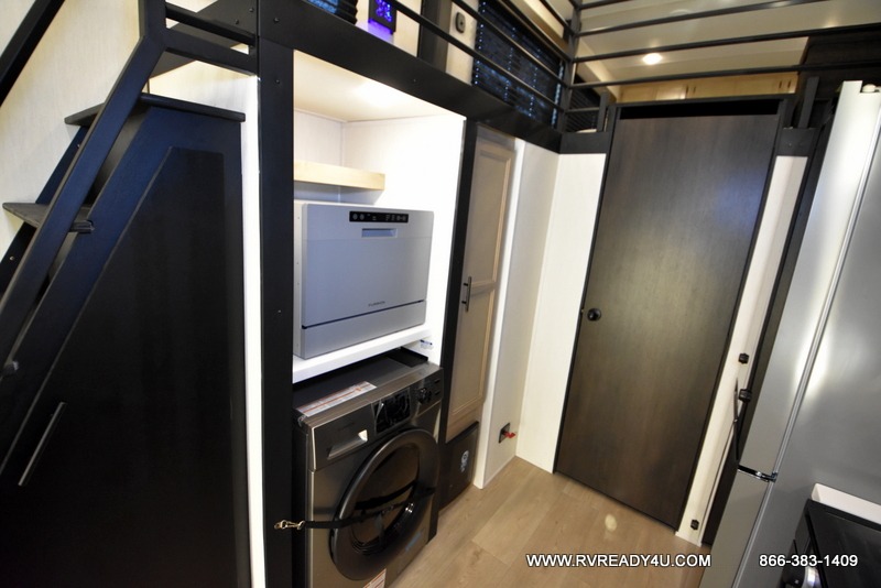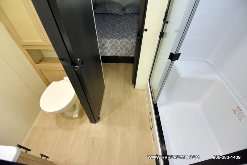 This model is similar to 16ML but larger! A bigger bathroom, RV king bed in the lower master, and a queen bed plus a twin bunk mat in the front loft. And the second loft can be utilized as extra sleeping space or storage space! There is an 18 cu. ft. refrigerator so you can stock up for a week long vacation, a hide-a-bed sofa that can transform into added sleeping for guests, and a high top table with two stools to dine at. The bathroom below is split with a shower on one side, and a private toilet area and sink opposite. And the view is amazing from just about anywhere inside.