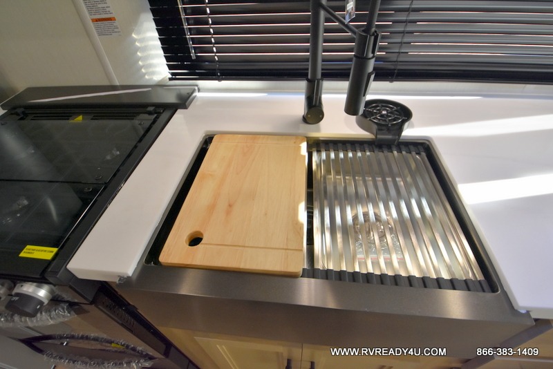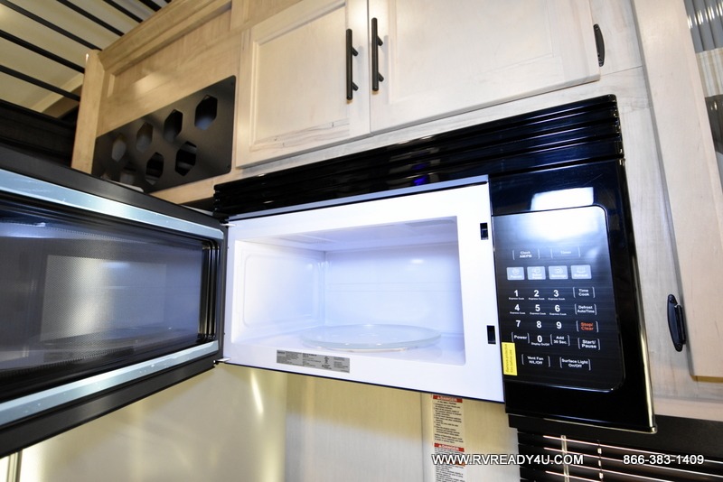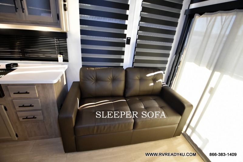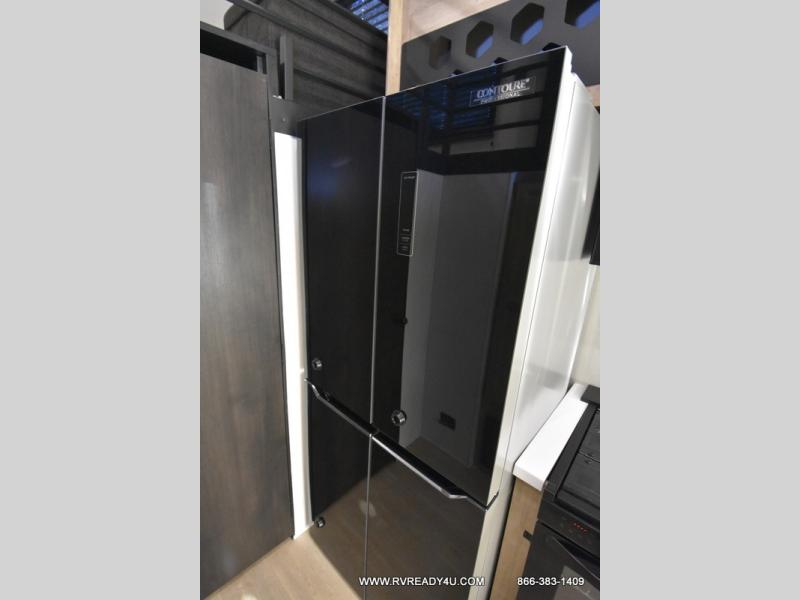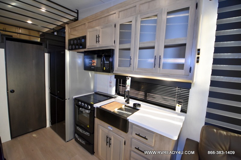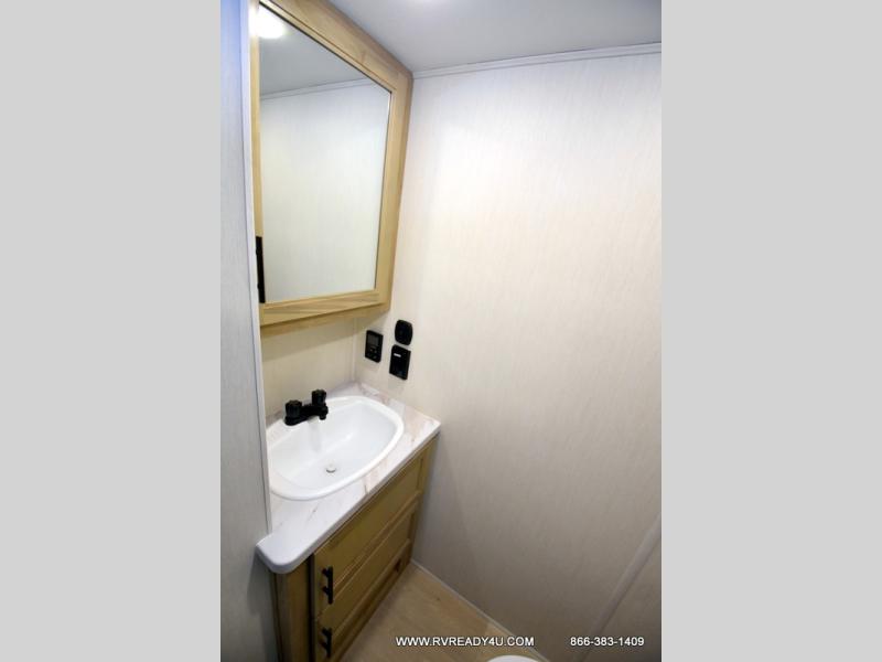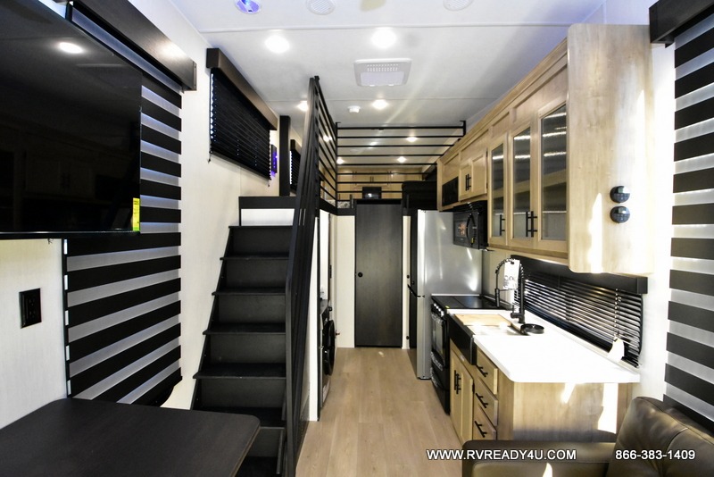 This model is similar to 16ML but larger! A bigger bathroom, RV king bed in the lower master, and a queen bed plus a twin bunk mat in the front loft. And the second loft can be utilized as extra sleeping space or storage space! There is an 18 cu. ft. refrigerator so you can stock up for a week long vacation, a hide-a-bed sofa that can transform into added sleeping for guests, and a high top table with two stools to dine at. The bathroom below is split with a shower on one side, and a private toilet area and sink opposite. And the view is amazing from just about anywhere inside.