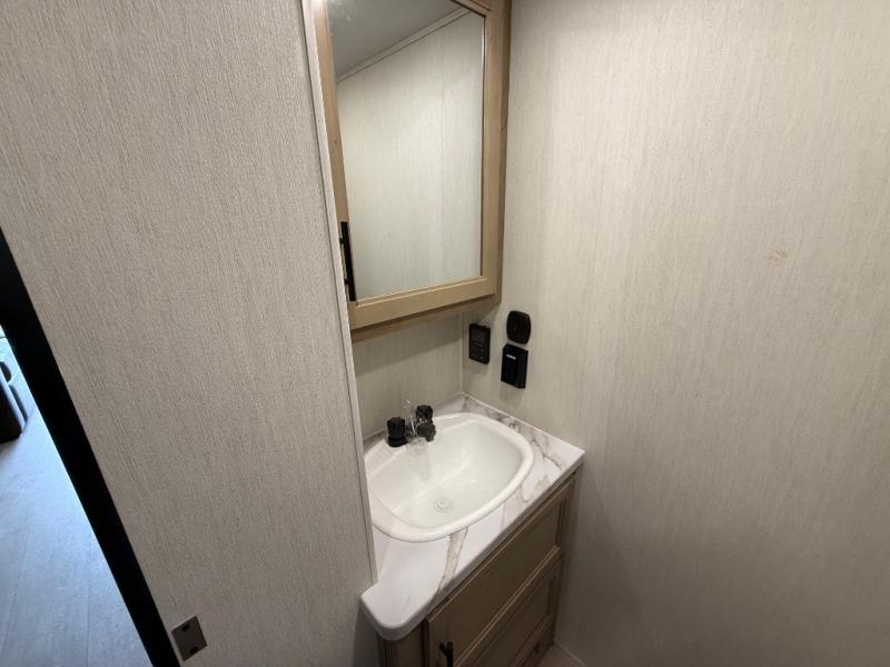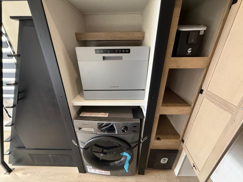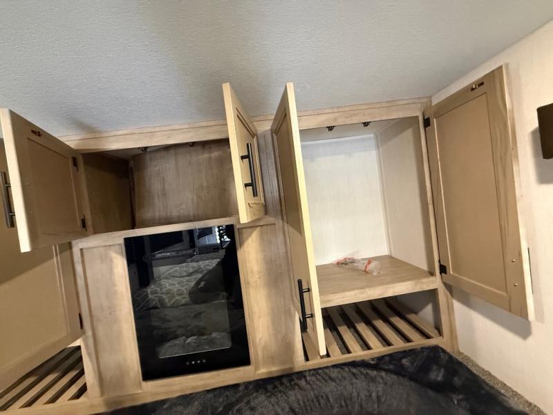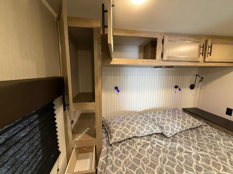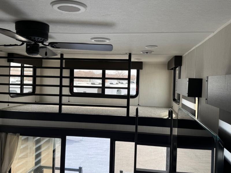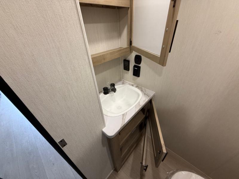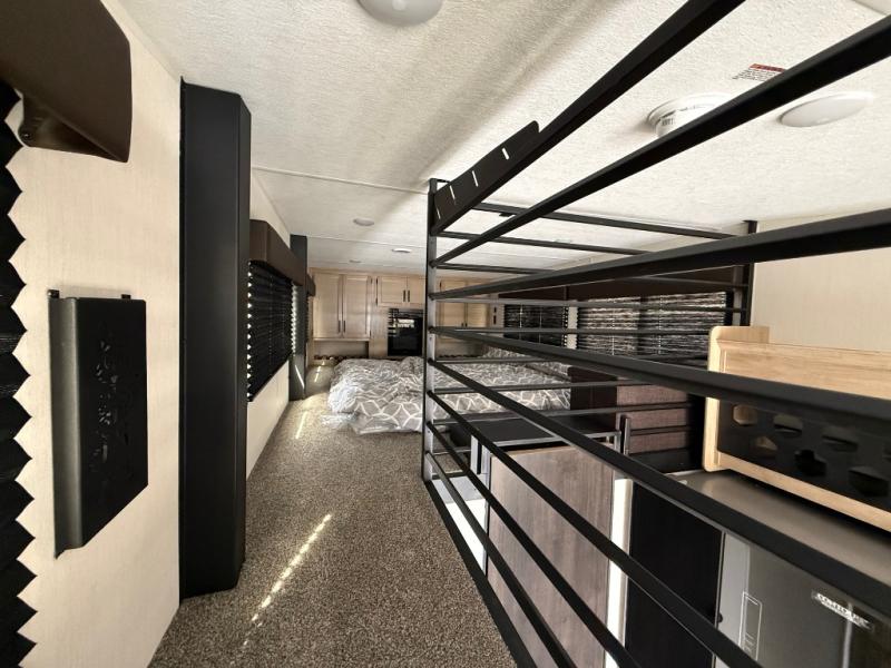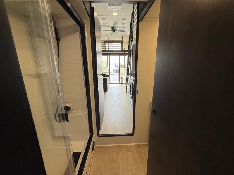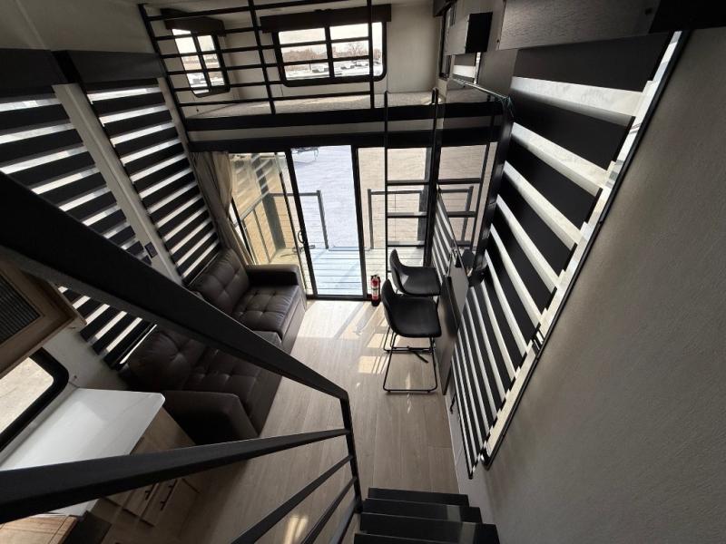 This model is similar to 16ML but larger! A bigger bathroom, RV king bed in the lower master, and a queen bed plus a twin bunk mat in the front loft. And the second loft can be utilized as extra sleeping space or storage space! There is an 18 cu. ft. refrigerator so you can stock up for a week long vacation, a hide-a-bed sofa that can transform into added sleeping for guests, and a high top table with two stools to dine at. The bathroom below is split with a shower on one side, and a private toilet area and sink opposite. And the view is amazing from just about anywhere inside.