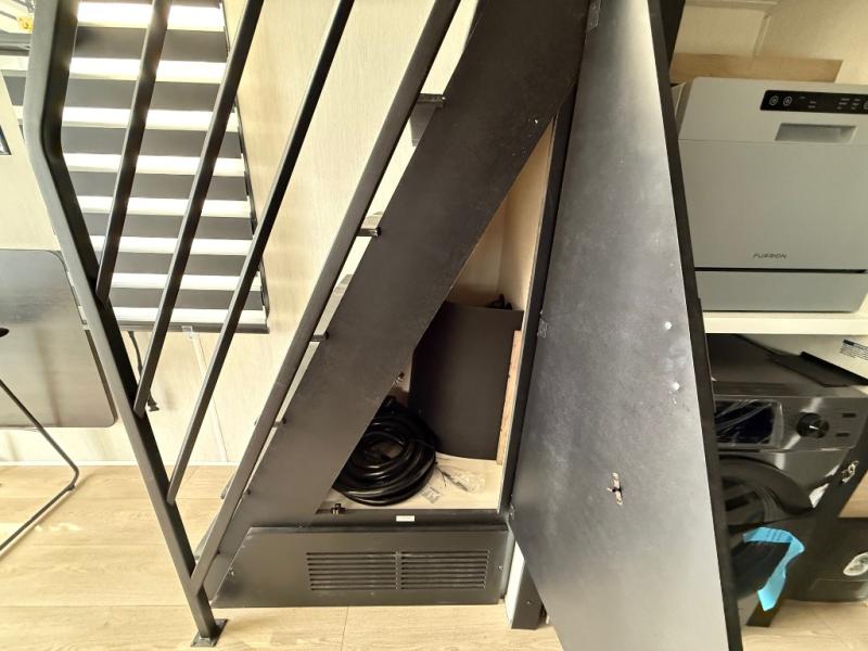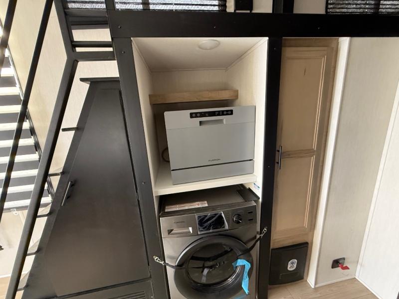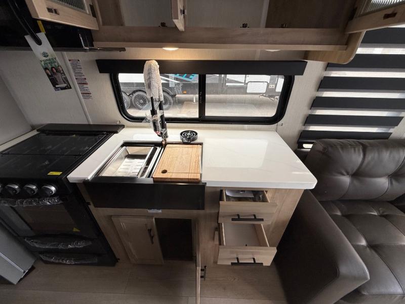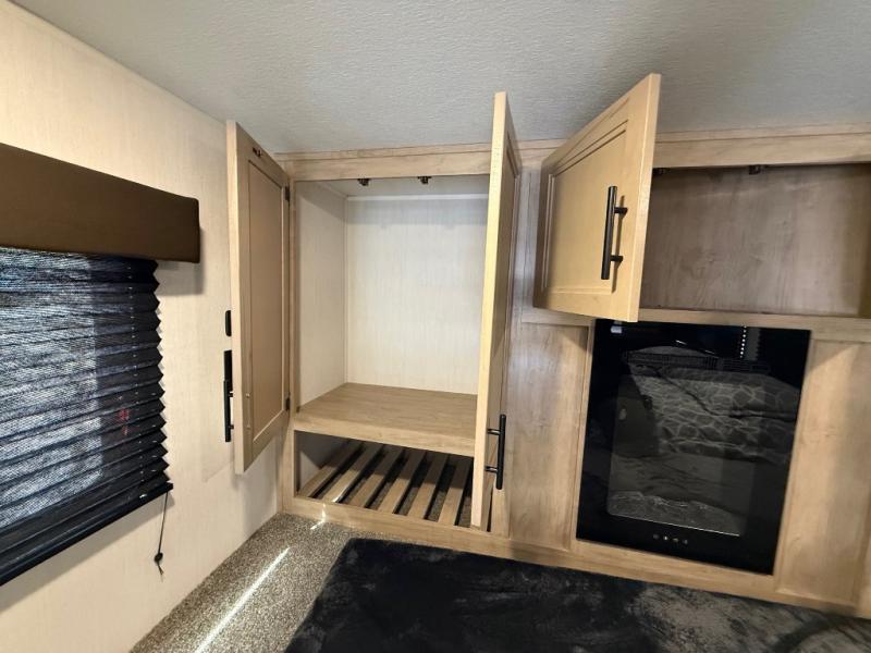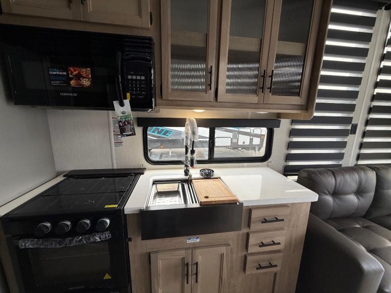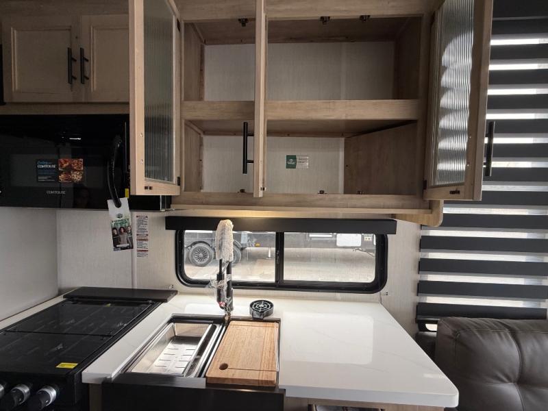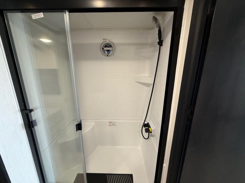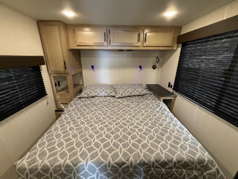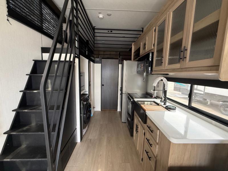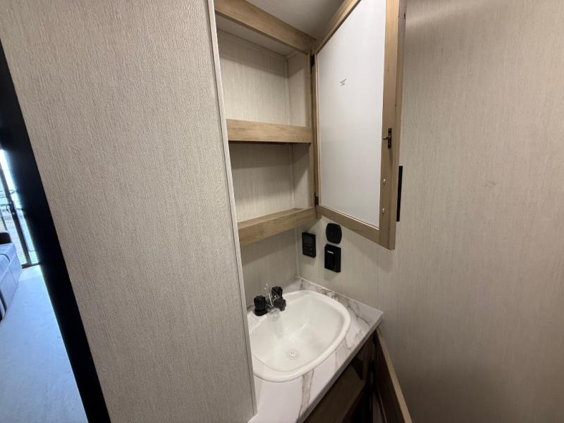 This model is similar to 16ML but larger! A bigger bathroom, RV king bed in the lower master, and a queen bed plus a twin bunk mat in the front loft. And the second loft can be utilized as extra sleeping space or storage space! There is an 18 cu. ft. refrigerator so you can stock up for a week long vacation, a hide-a-bed sofa that can transform into added sleeping for guests, and a high top table with two stools to dine at. The bathroom below is split with a shower on one side, and a private toilet area and sink opposite. And the view is amazing from just about anywhere inside.