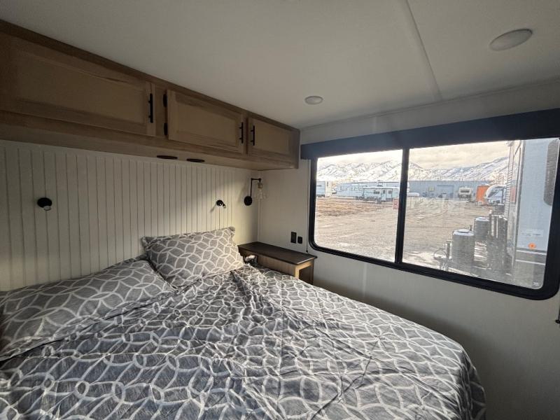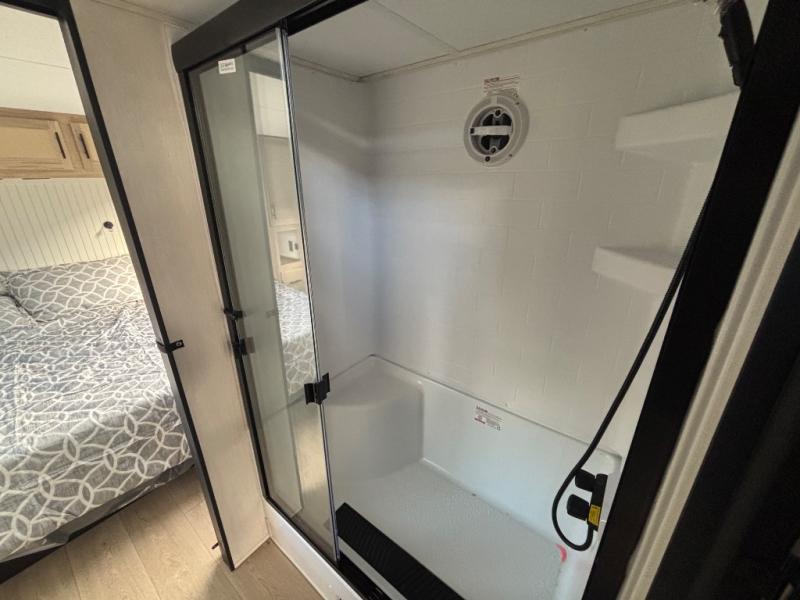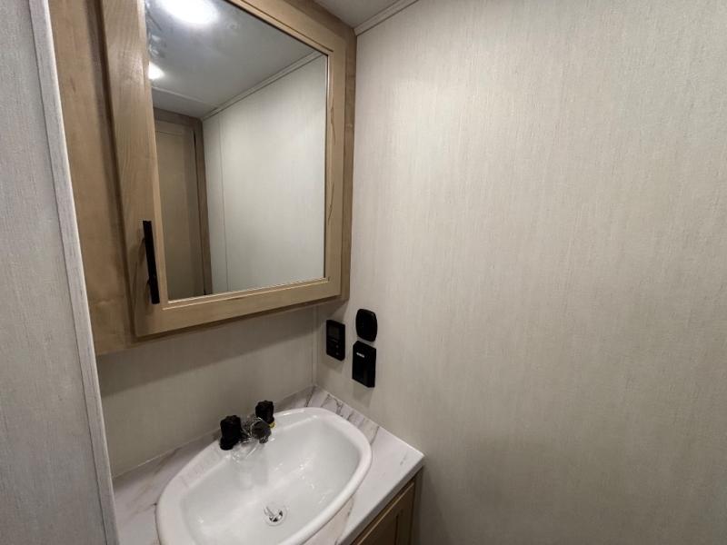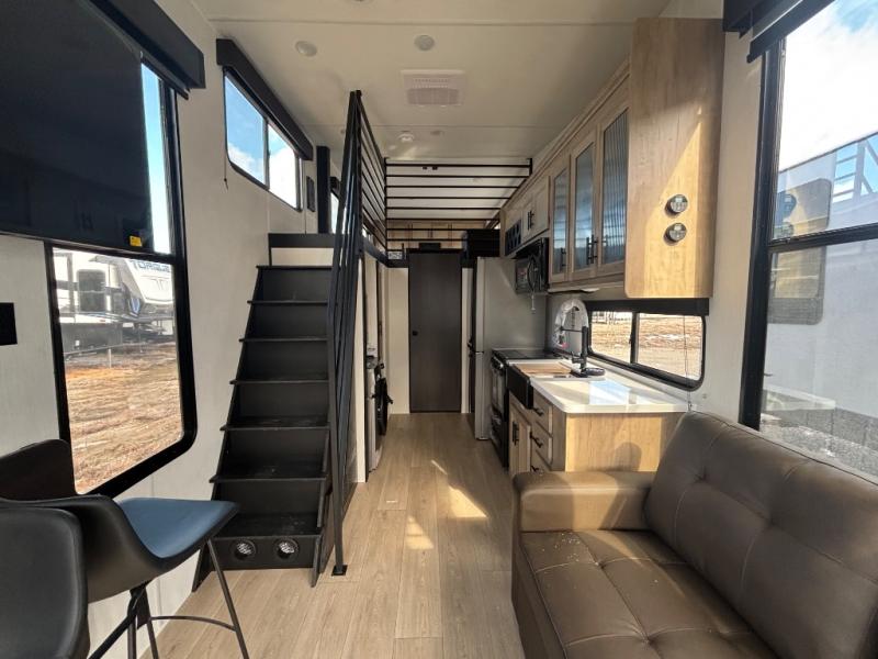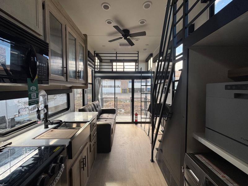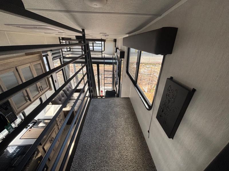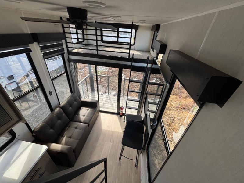 This model is similar to 16ML but larger! A bigger bathroom, RV king bed in the lower master, and a queen bed plus a twin bunk mat in the front loft. And the second loft can be utilized as extra sleeping space or storage space! There is an 18 cu. ft. refrigerator so you can stock up for a week long vacation, a hide-a-bed sofa that can transform into added sleeping for guests, and a high top table with two stools to dine at. The bathroom below is split with a shower on one side, and a private toilet area and sink opposite. And the view is amazing from just about anywhere inside.