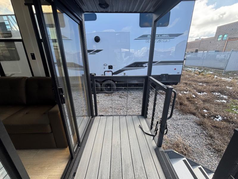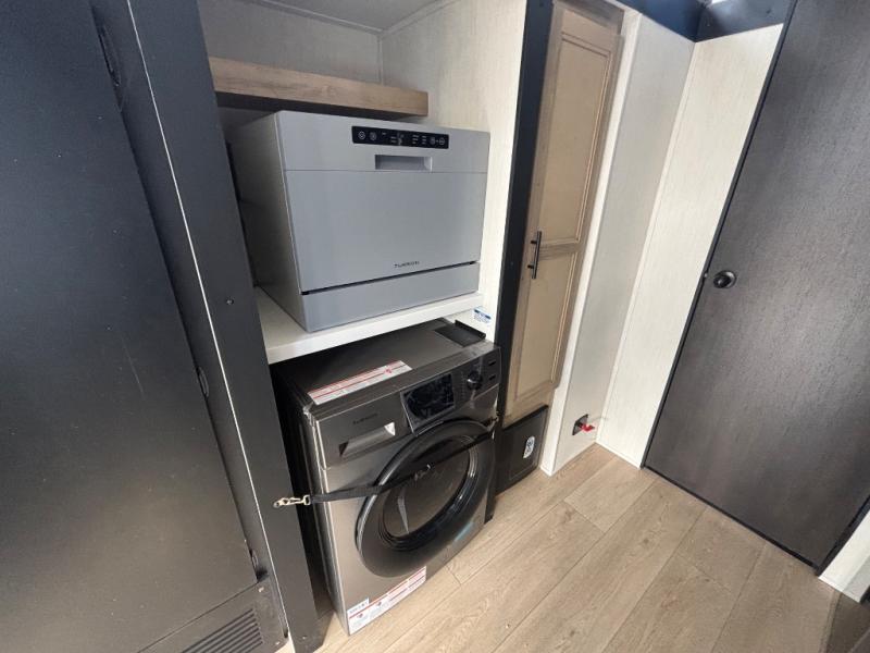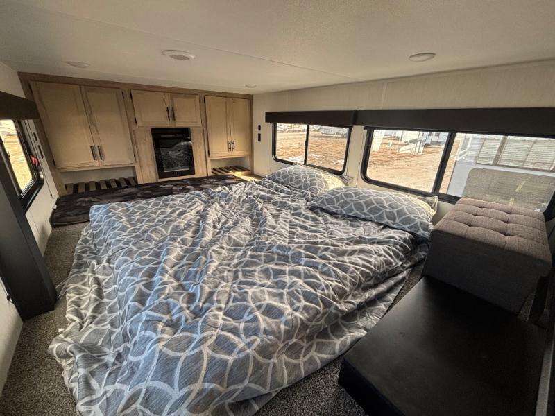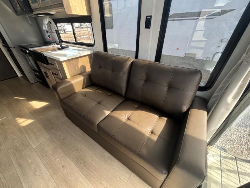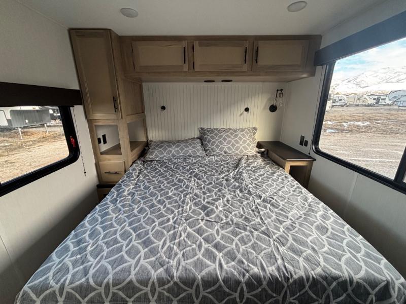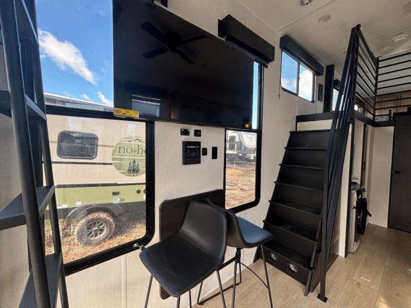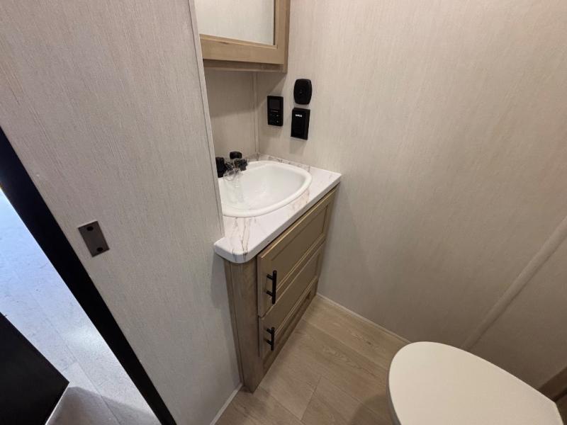 This model is similar to 16ML but larger! A bigger bathroom, RV king bed in the lower master, and a queen bed plus a twin bunk mat in the front loft. And the second loft can be utilized as extra sleeping space or storage space! There is an 18 cu. ft. refrigerator so you can stock up for a week long vacation, a hide-a-bed sofa that can transform into added sleeping for guests, and a high top table with two stools to dine at. The bathroom below is split with a shower on one side, and a private toilet area and sink opposite. And the view is amazing from just about anywhere inside.