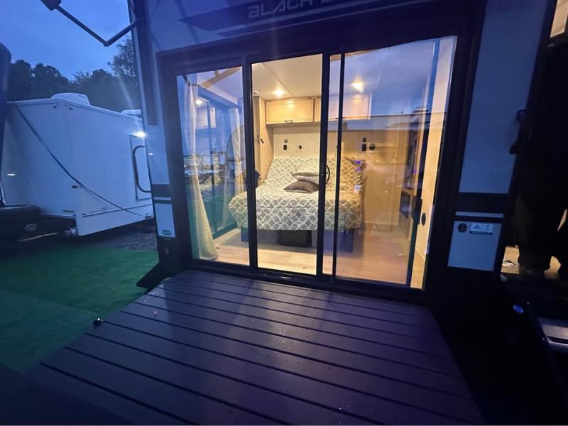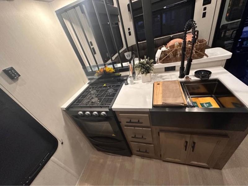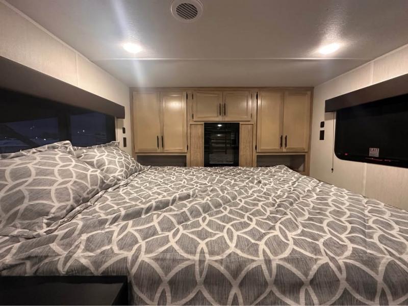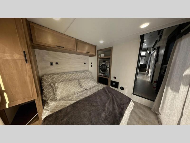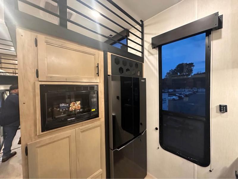 You'll feel right at home in this feature-packed destination trailer! The rear private bedroom features one of the dual entry doors, an RV king bed, and a side patio for great outdoor views! There is also a wardrobe with washer/dryer prep if you want the option to add these appliances. Above the bedroom, you'll find a loft with a queen bed, a fireplace and a storage cabinet to keep the space tidy. The chef of your group can whip up their best meals in the middle kitchen, and there is a spacious pantry to keep snacks stocked. Your crew can relax on the L-shaped sofa in the front living room, enjoy the fireplace and TV, or just take in the outdoor views provided by the huge side patio!
