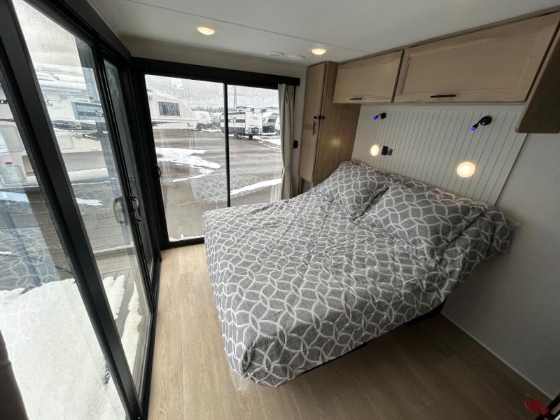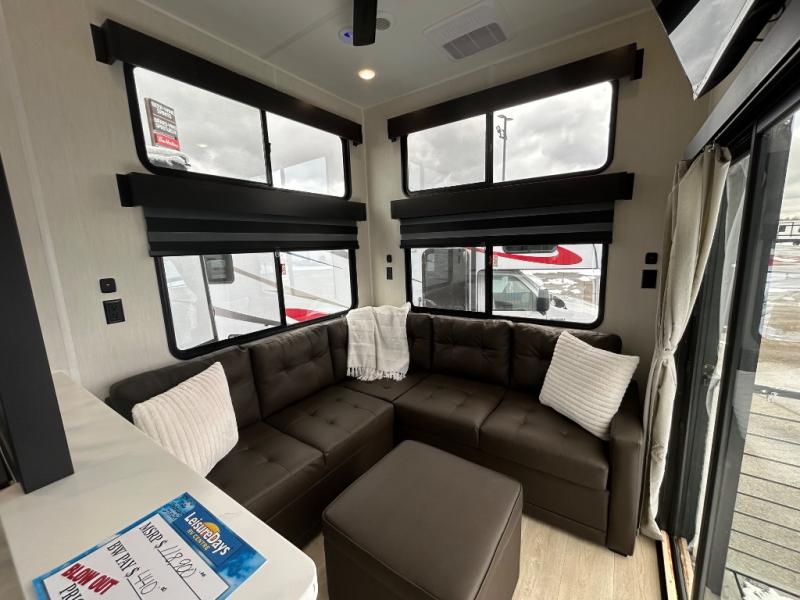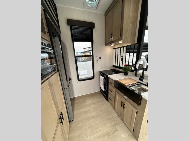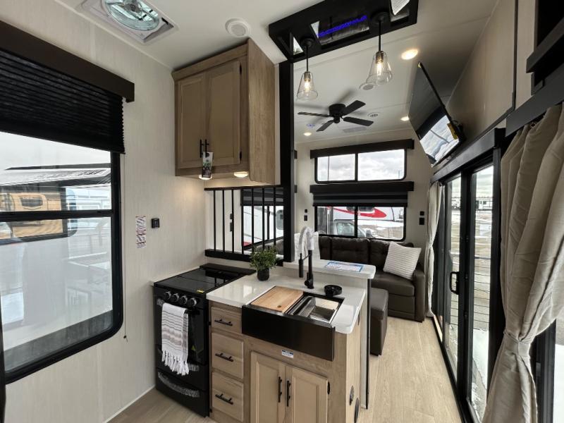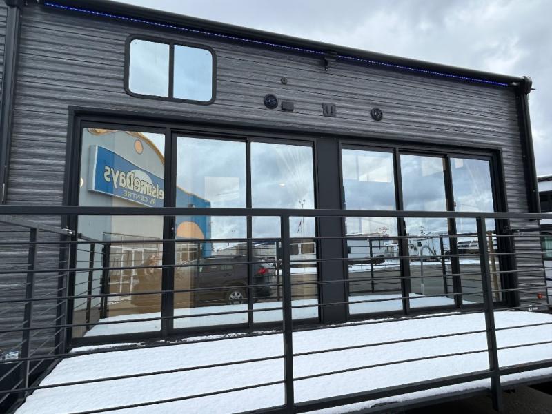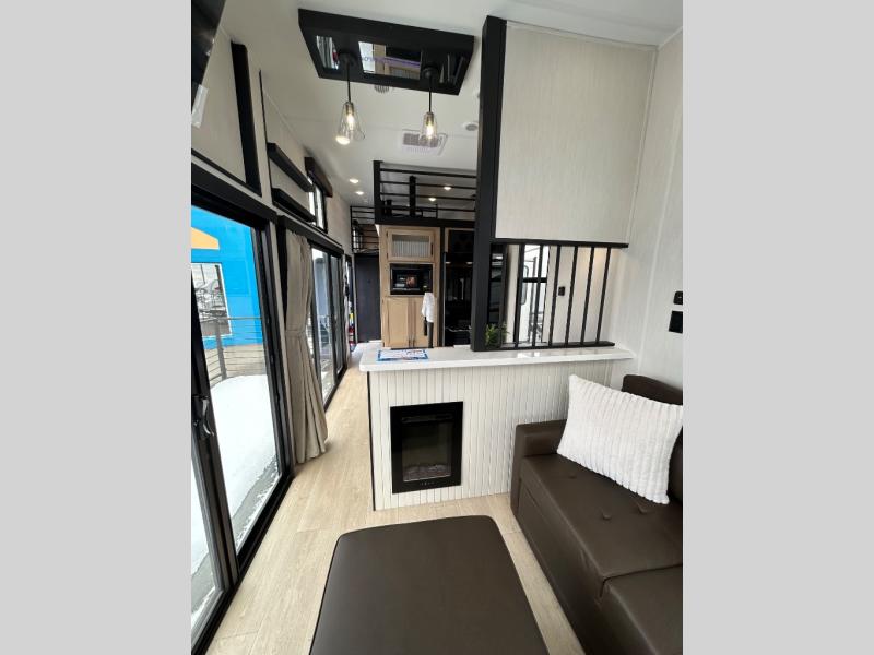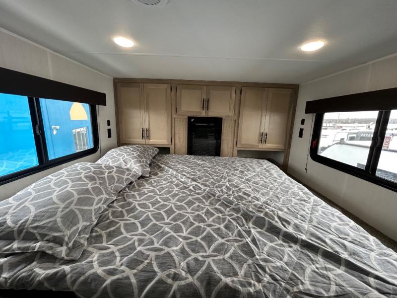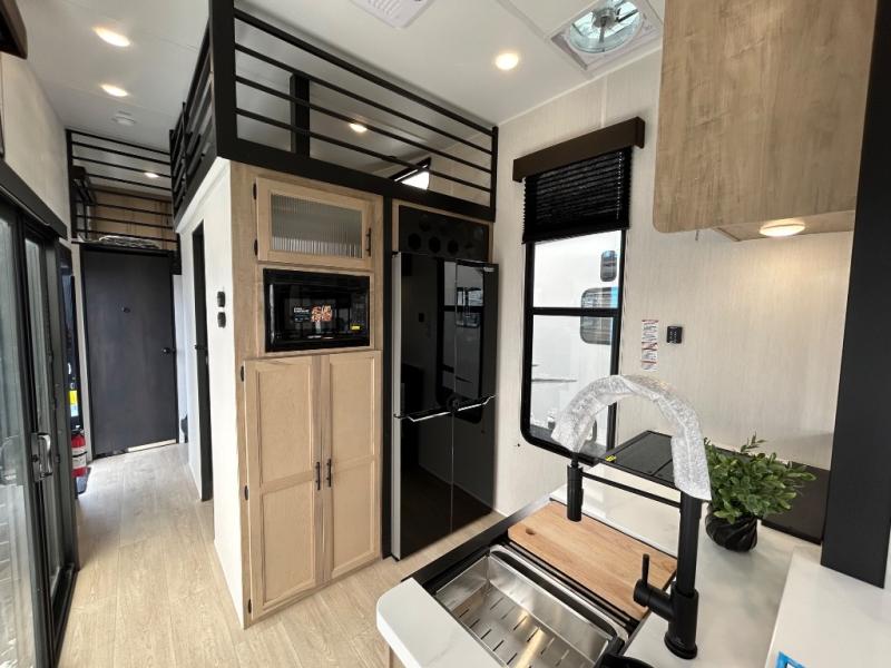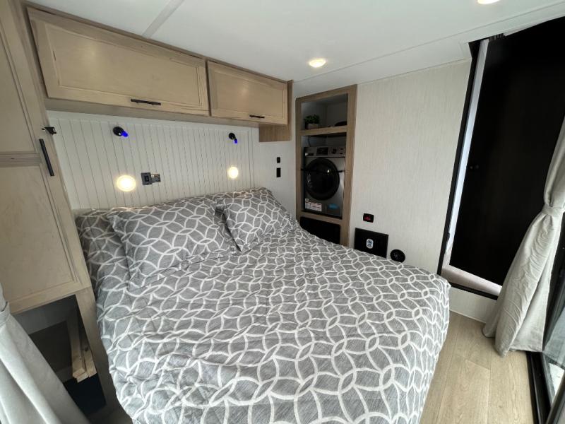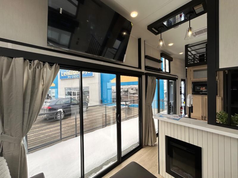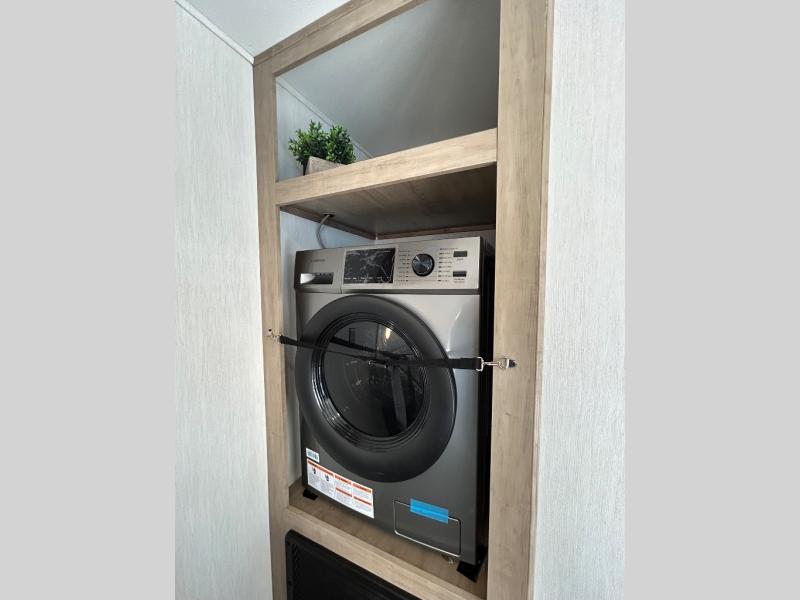 You'll feel right at home in this feature-packed destination trailer! The rear private bedroom features one of the dual entry doors, an RV king bed, and a side patio for great outdoor views! There is also a wardrobe with washer/dryer prep if you want the option to add these appliances. Above the bedroom, you'll find a loft with a queen bed, a fireplace and a storage cabinet to keep the space tidy. The chef of your group can whip up their best meals in the middle kitchen, and there is a spacious pantry to keep snacks stocked. Your crew can relax on the L-shaped sofa in the front living room, enjoy the fireplace and TV, or just take in the outdoor views provided by the huge side patio!