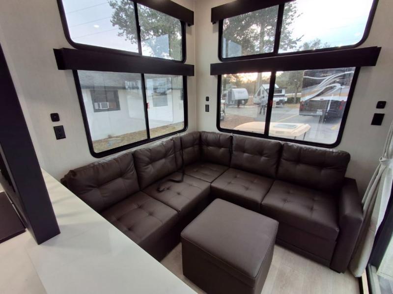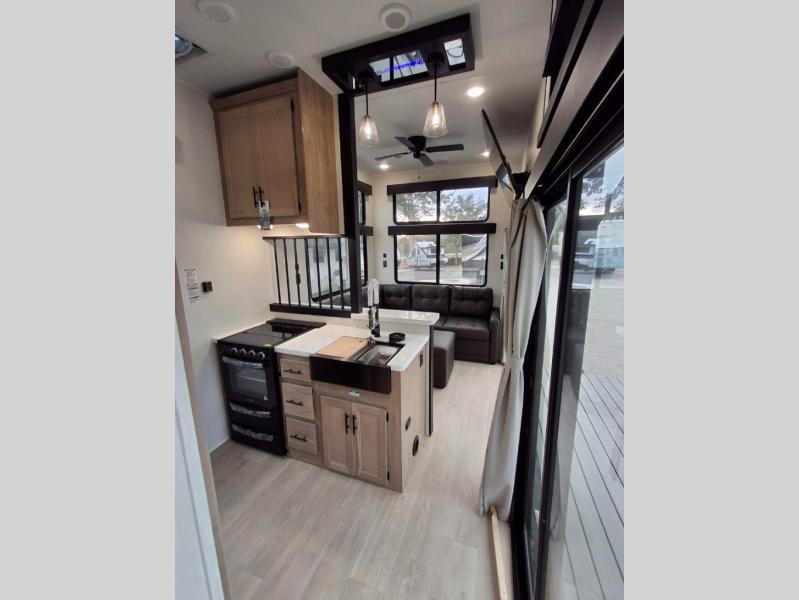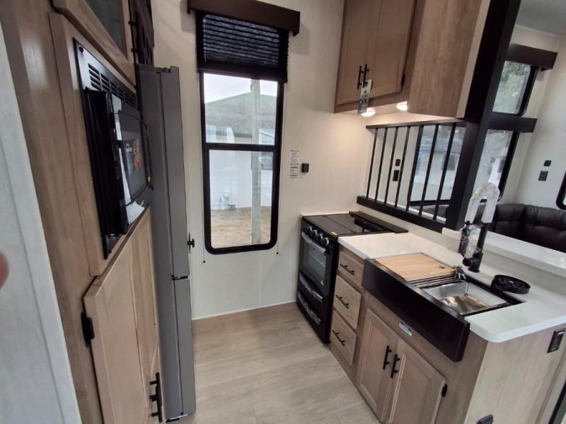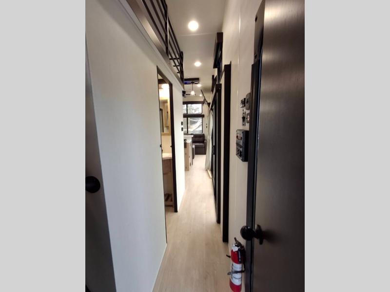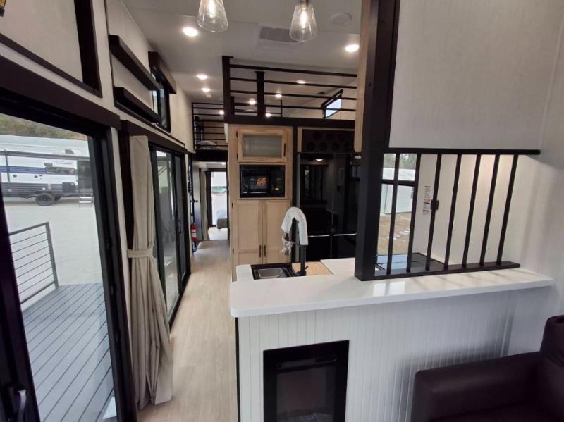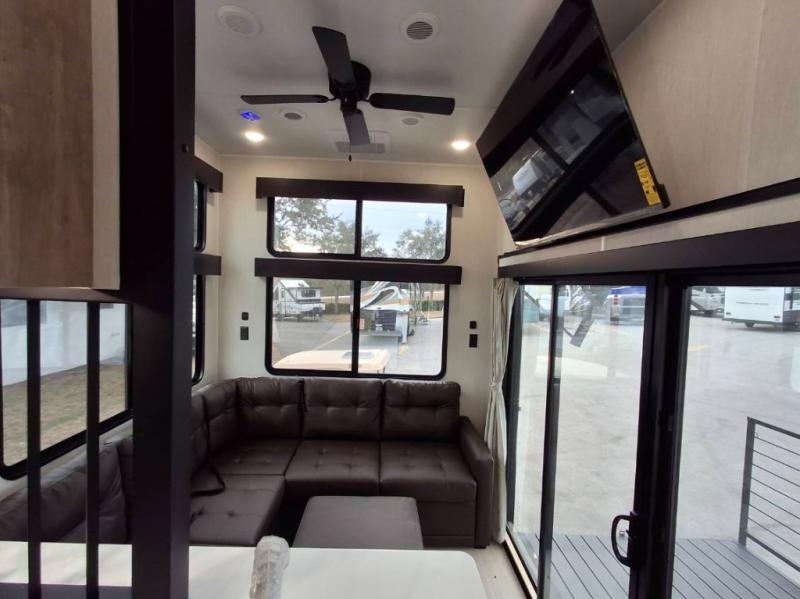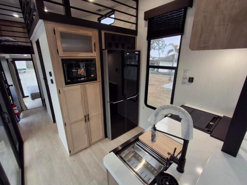 You'll feel right at home in this feature-packed destination trailer! The rear private bedroom features one of the dual entry doors, an RV king bed, and a side patio for great outdoor views! There is also a wardrobe with washer/dryer prep if you want the option to add these appliances. Above the bedroom, you'll find a loft with a queen bed, a fireplace and a storage cabinet to keep the space tidy. The chef of your group can whip up their best meals in the middle kitchen, and there is a spacious pantry to keep snacks stocked. Your crew can relax on the L-shaped sofa in the front living room, enjoy the fireplace and TV, or just take in the outdoor views provided by the huge side patio!
