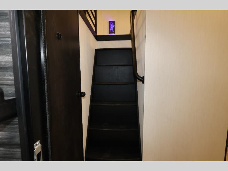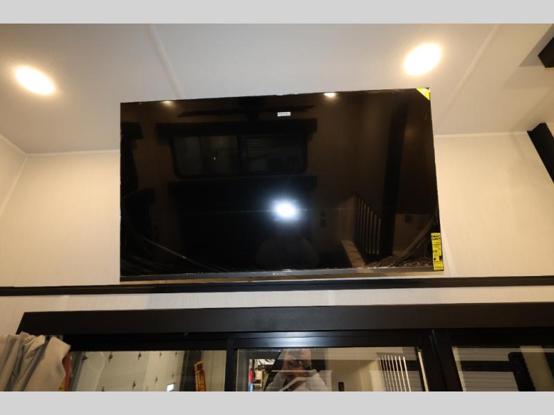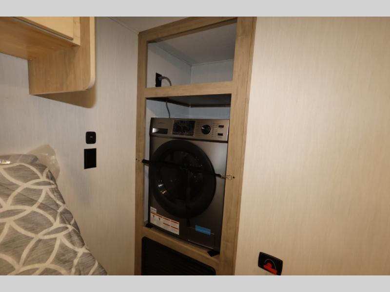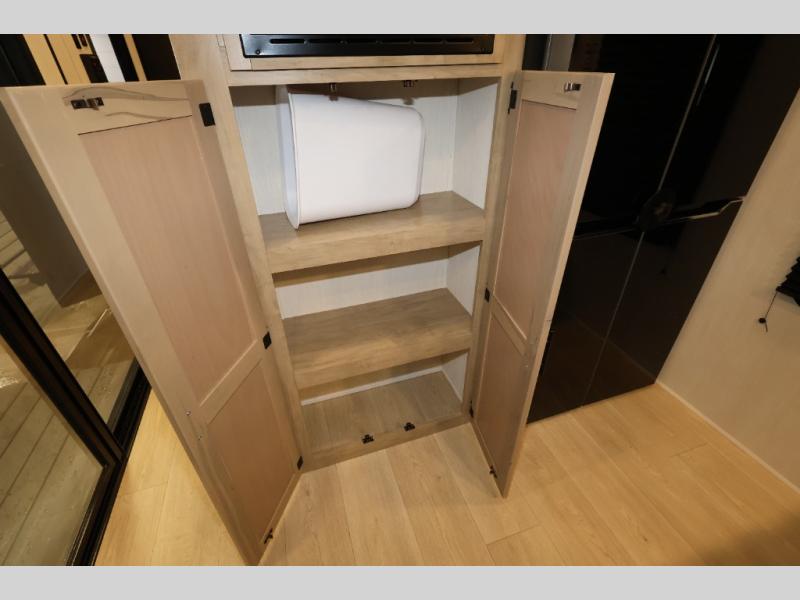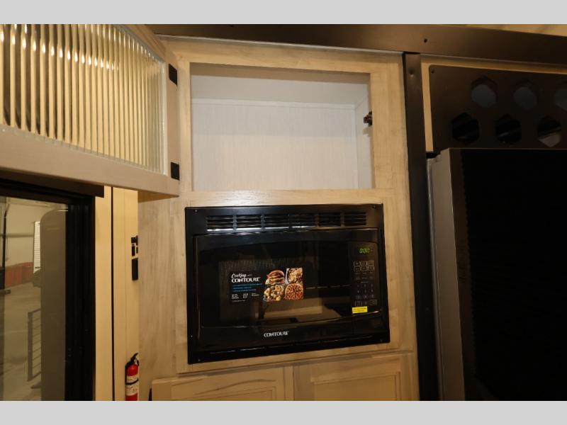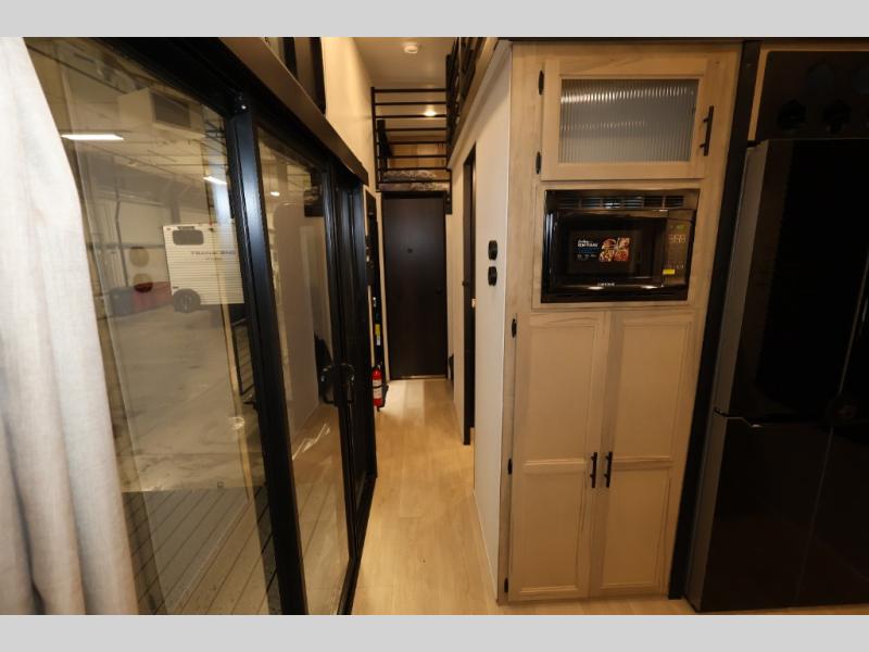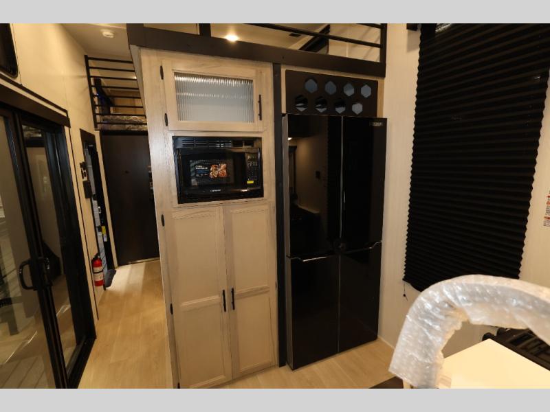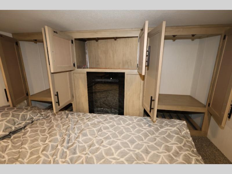You'll feel right at home in this feature-packed destination trailer! The rear private bedroom features one of the dual entry doors, an RV king bed, and a side patio for great outdoor views! There is also a wardrobe with washer/dryer prep if you want the option to add these appliances. Above the bedroom, you'll find a loft with a queen bed, a fireplace and a storage cabinet to keep the space tidy. The chef of your group can whip up their best meals in the middle kitchen, and there is a spacious pantry to keep snacks stocked. Your crew can relax on the L-shaped sofa in the front living room, enjoy the fireplace and TV, or just take in the outdoor views provided by the huge side patio!