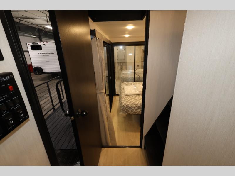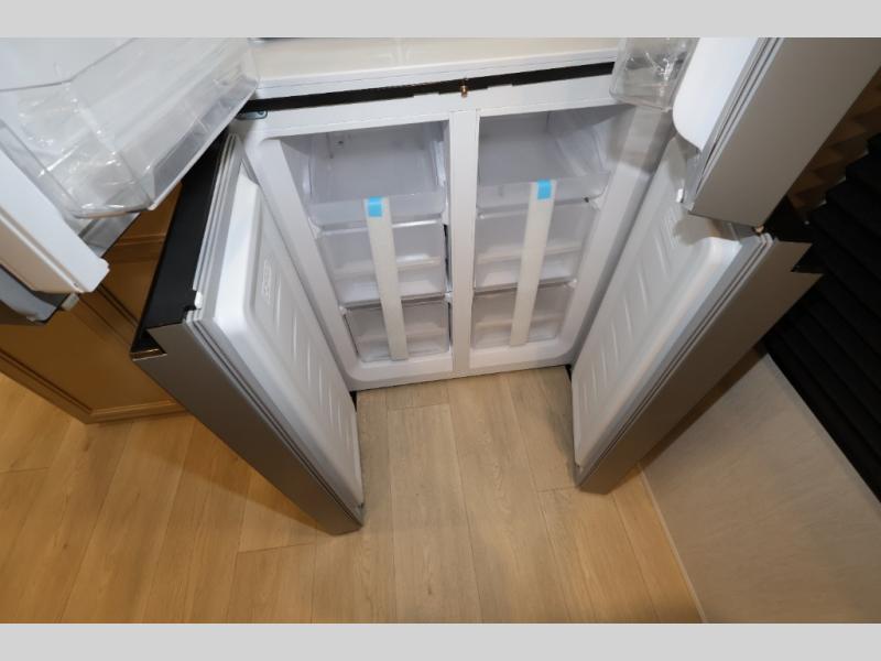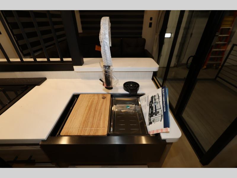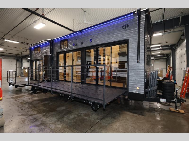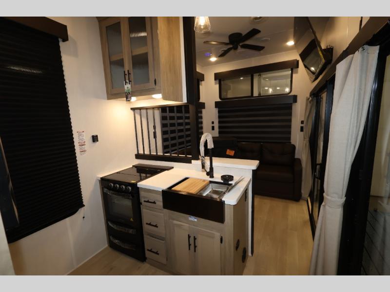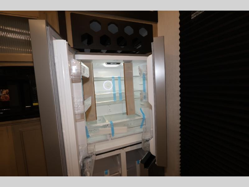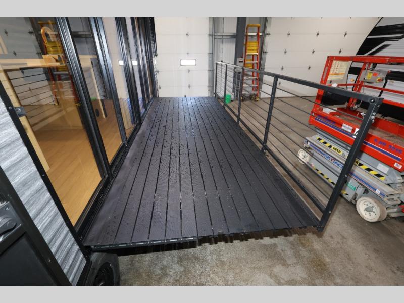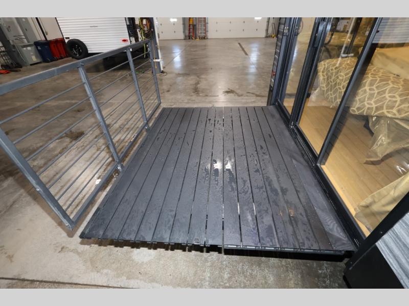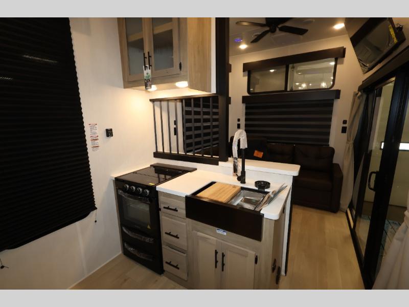 You'll feel right at home in this feature-packed destination trailer! The rear private bedroom features one of the dual entry doors, an RV king bed, and a side patio for great outdoor views! There is also a wardrobe with washer/dryer prep if you want the option to add these appliances. Above the bedroom, you'll find a loft with a queen bed, a fireplace and a storage cabinet to keep the space tidy. The chef of your group can whip up their best meals in the middle kitchen, and there is a spacious pantry to keep snacks stocked. Your crew can relax on the L-shaped sofa in the front living room, enjoy the fireplace and TV, or just take in the outdoor views provided by the huge side patio!