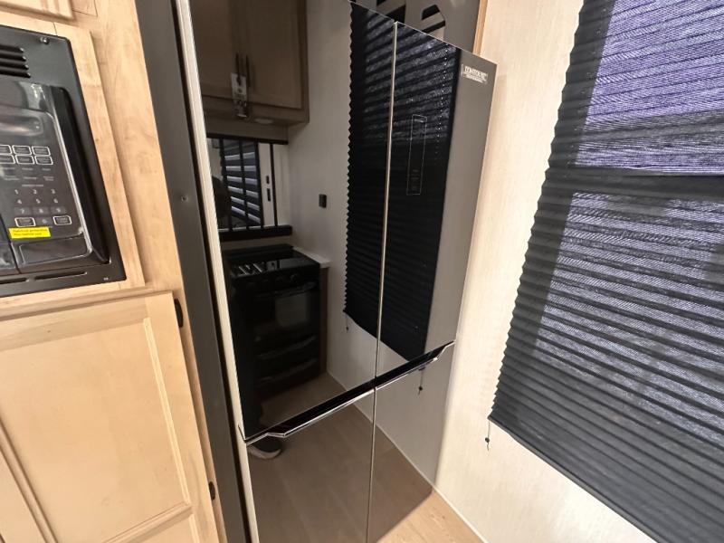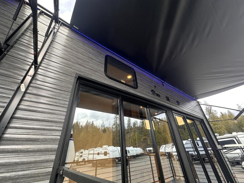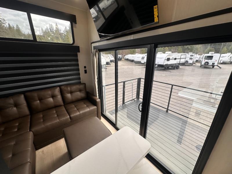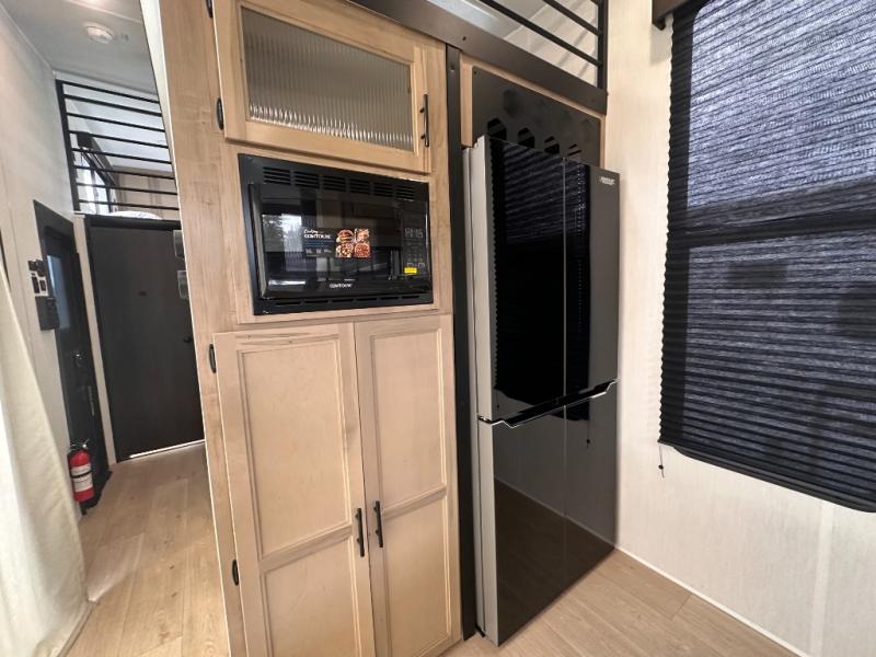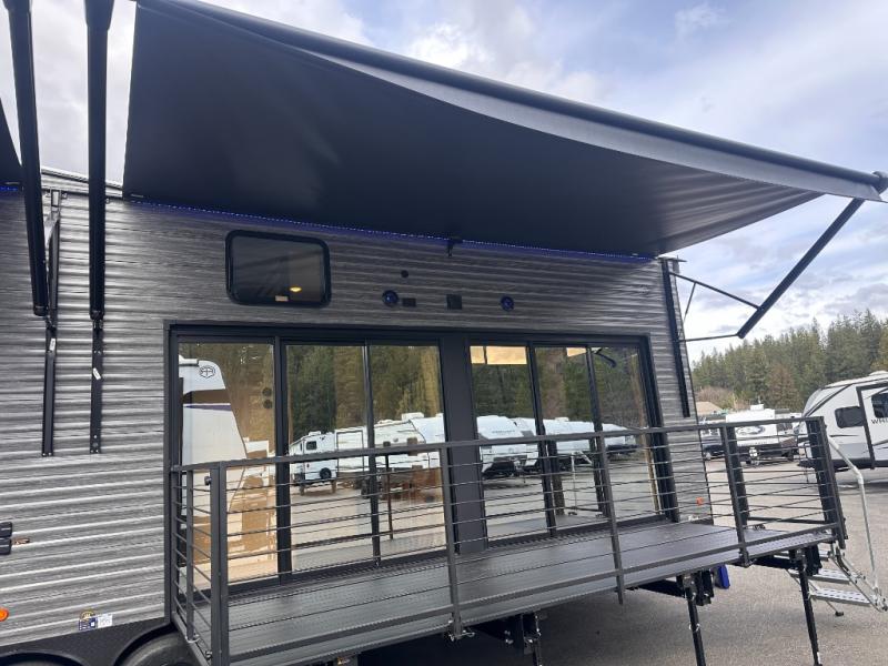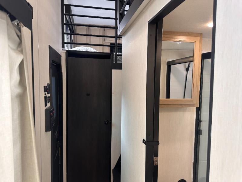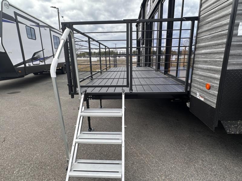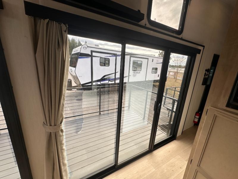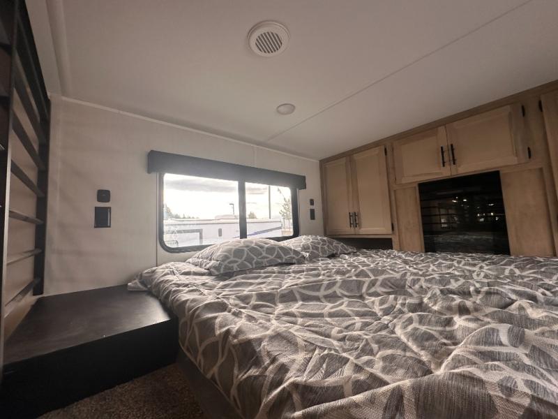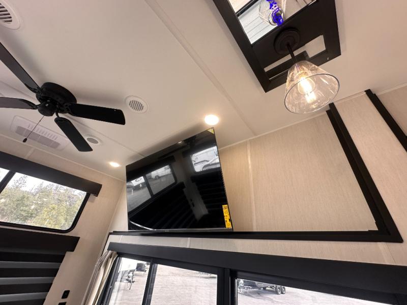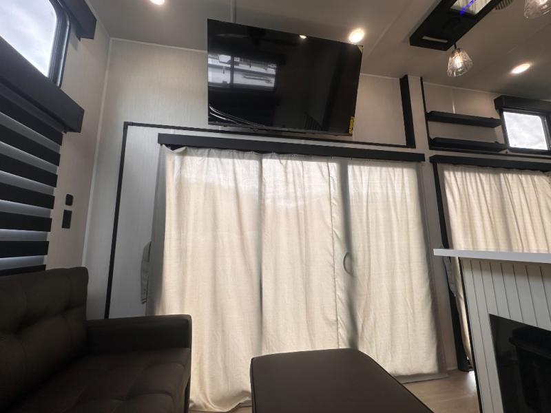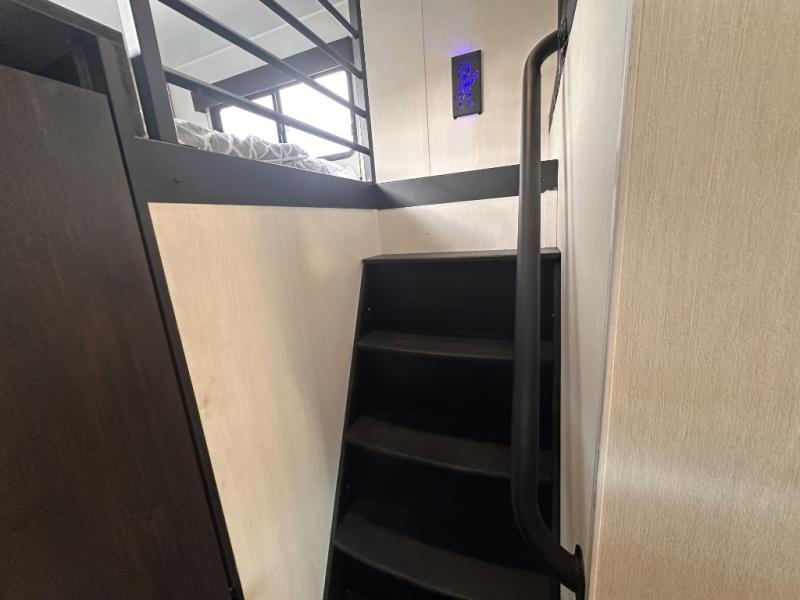 You'll feel right at home in this feature-packed destination trailer! The rear private bedroom features one of the dual entry doors, an RV king bed, and a side patio for great outdoor views! There is also a wardrobe with washer/dryer prep if you want the option to add these appliances. Above the bedroom, you'll find a loft with a queen bed, a fireplace and a storage cabinet to keep the space tidy. The chef of your group can whip up their best meals in the middle kitchen, and there is a spacious pantry to keep snacks stocked. Your crew can relax on the L-shaped sofa in the front living room, enjoy the fireplace and TV, or just take in the outdoor views provided by the huge side patio!