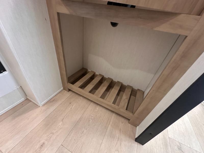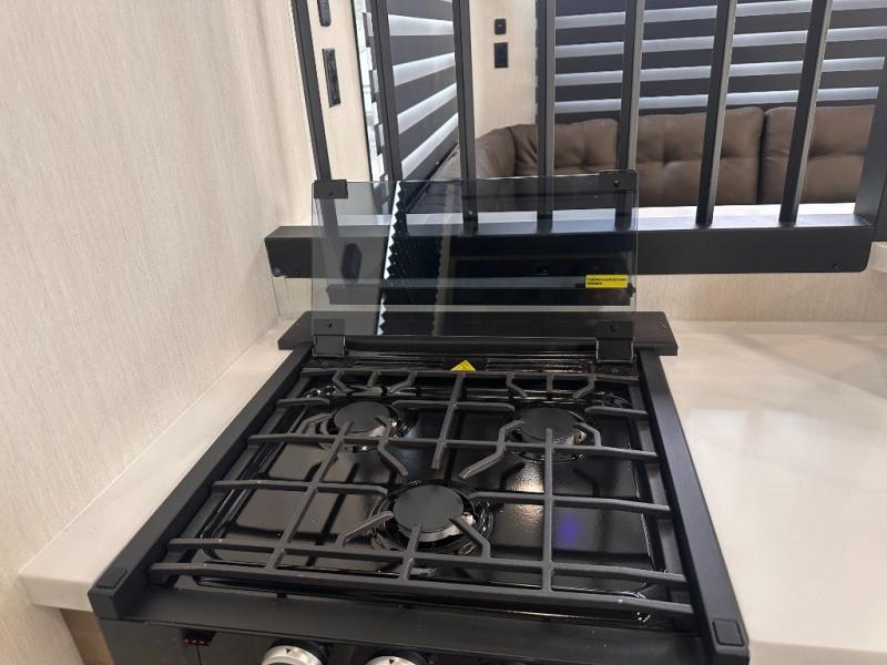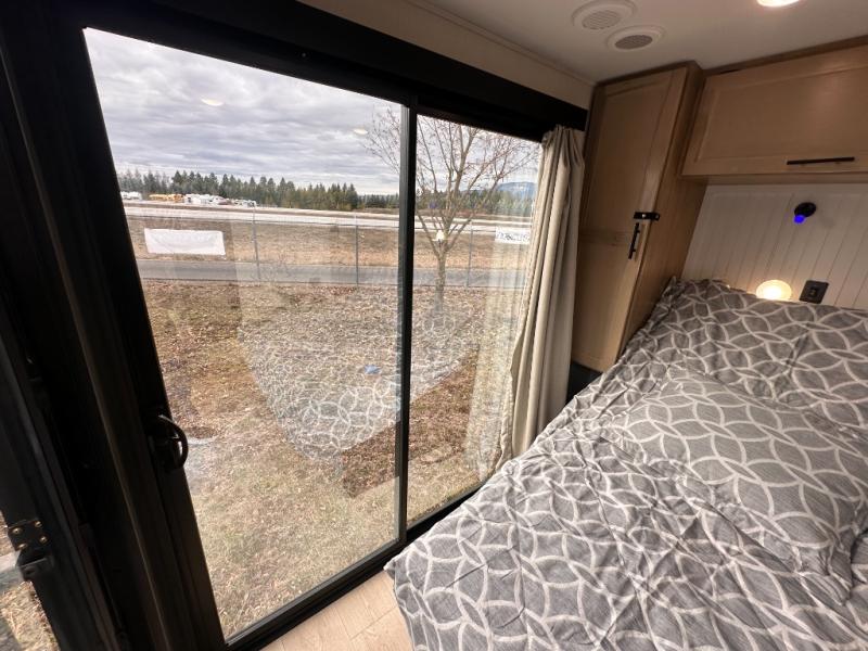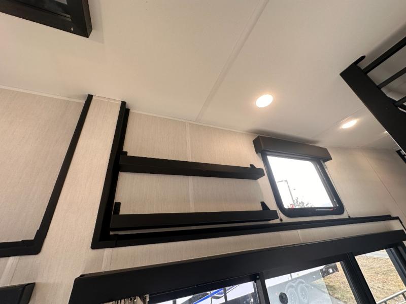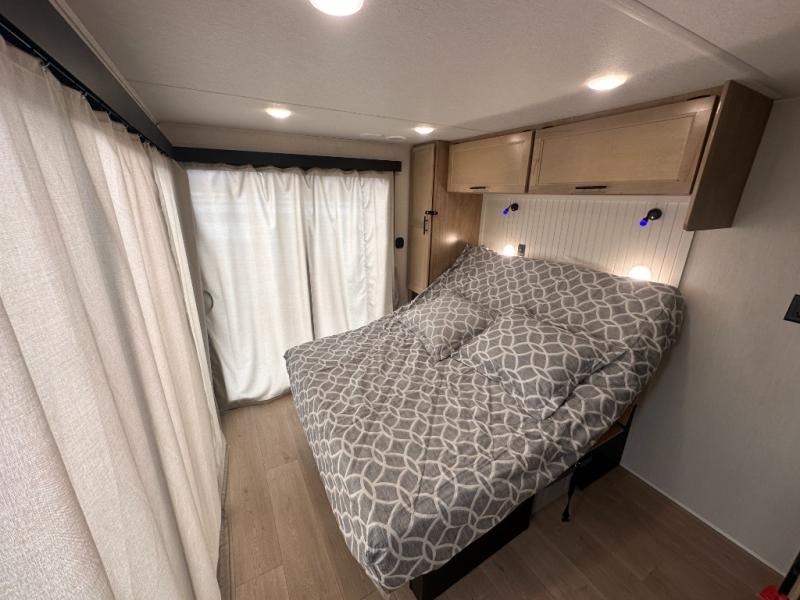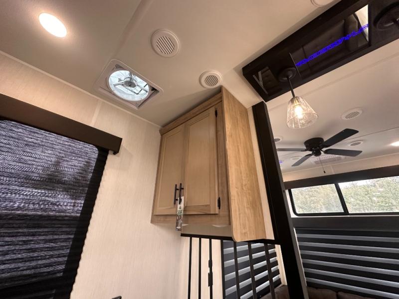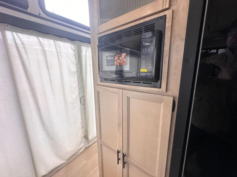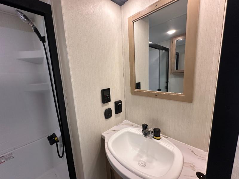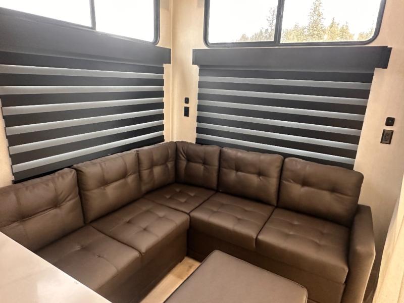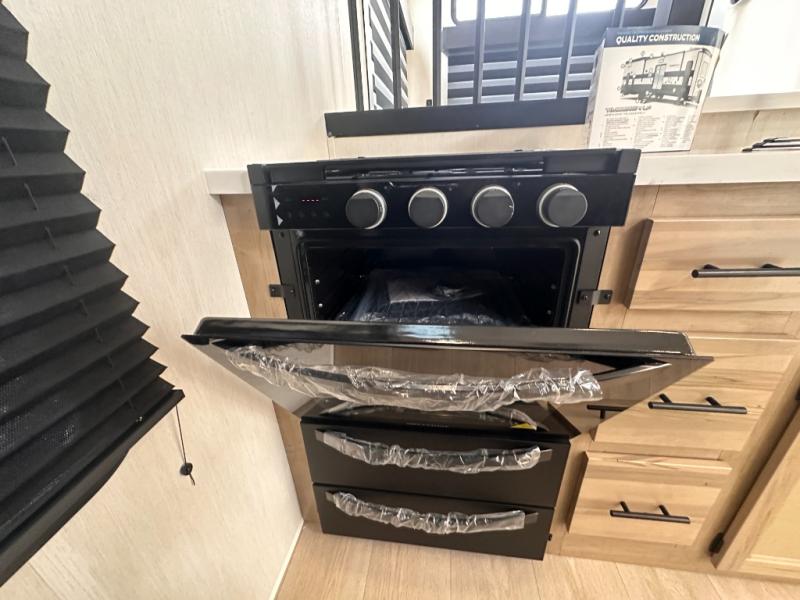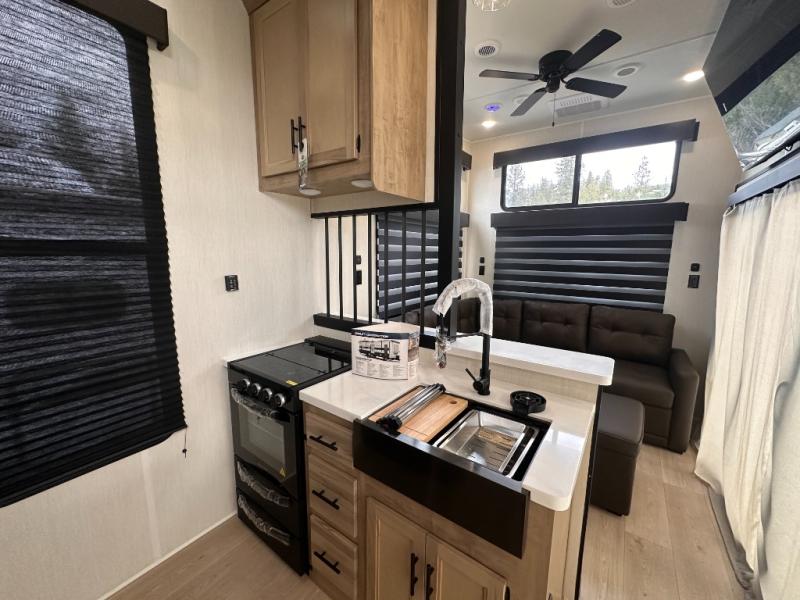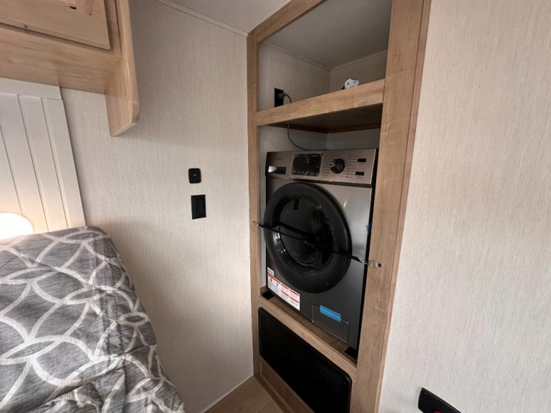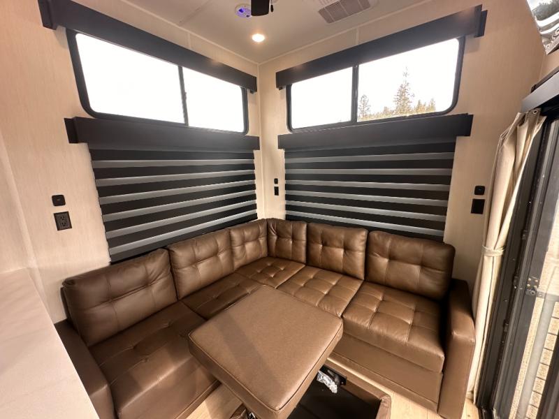 You'll feel right at home in this feature-packed destination trailer! The rear private bedroom features one of the dual entry doors, an RV king bed, and a side patio for great outdoor views! There is also a wardrobe with washer/dryer prep if you want the option to add these appliances. Above the bedroom, you'll find a loft with a queen bed, a fireplace and a storage cabinet to keep the space tidy. The chef of your group can whip up their best meals in the middle kitchen, and there is a spacious pantry to keep snacks stocked. Your crew can relax on the L-shaped sofa in the front living room, enjoy the fireplace and TV, or just take in the outdoor views provided by the huge side patio!