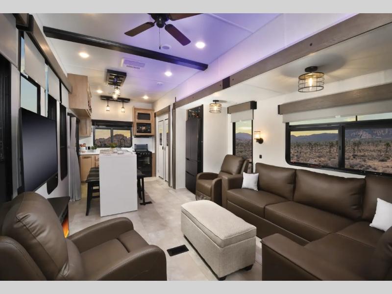 Time spent in this destination trailer will be time well spent! You will appreciate dual entry doors for maximum convenience, plus a spacious full bath that is close by the front private bedroom! Your crew can relax in the middle living area on the L-shaped sofa, and there are two lounge chairs for even more seating spaces. The rear kitchen will be any chef's dream with its island with six stools and all the appliances to create meals each day. This model also features triple slides so you can enjoy more space to relax!