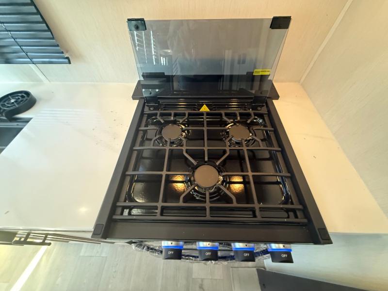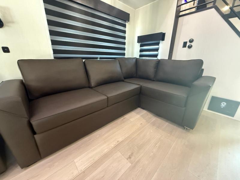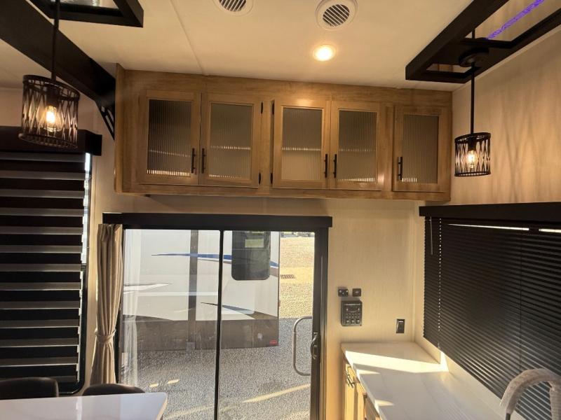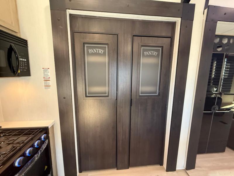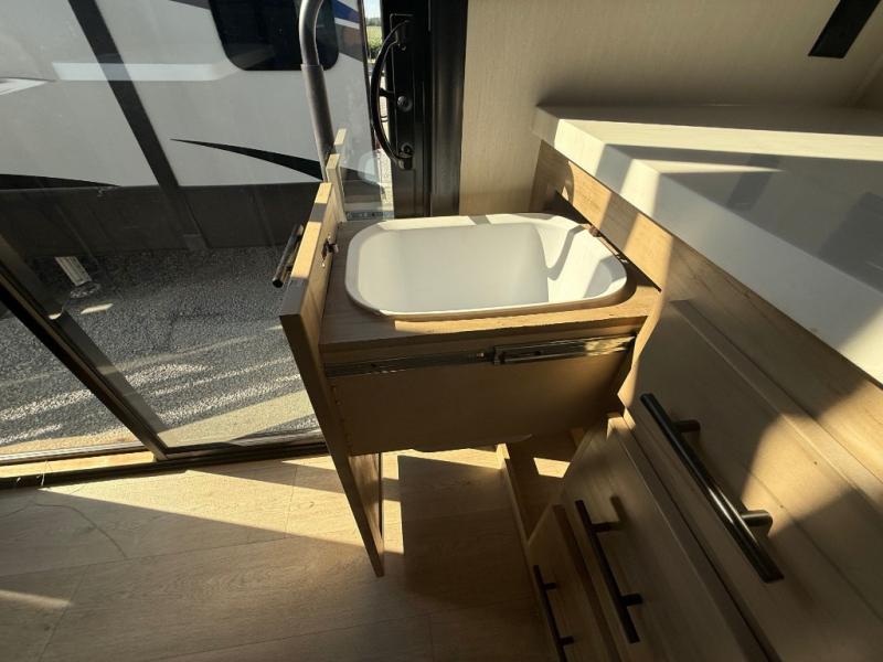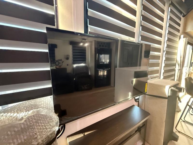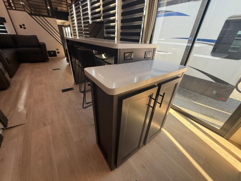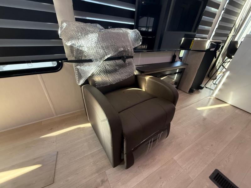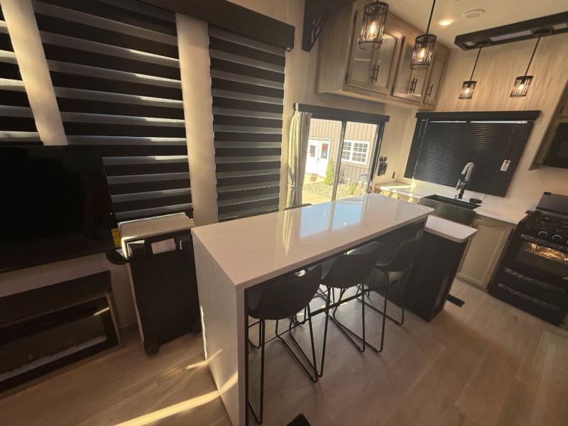 Time spent in this destination trailer will be time well spent! You will appreciate dual entry doors for maximum convenience, plus a spacious full bath that is close by the front private bedroom! Your crew can relax in the middle living area on the L-shaped sofa, and there are two lounge chairs for even more seating spaces. The rear kitchen will be any chef's dream with its island with six stools and all the appliances to create meals each day. This model also features triple slides so you can enjoy more space to relax!