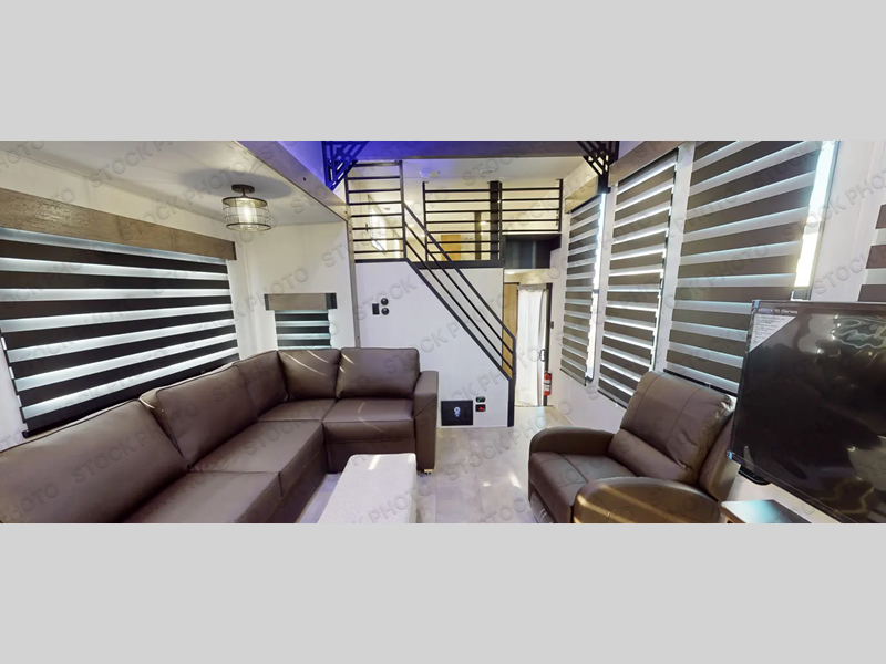 Time spent in this destination trailer will be time well spent! You will appreciate dual entry doors for maximum convenience, plus a spacious full bath that is close by the front private bedroom! Your crew can relax in the middle living area on the L-shaped sofa, and there are two lounge chairs for even more seating spaces. The rear kitchen will be any chef's dream with its island with six stools and all the appliances to create meals each day. This model also features triple slides so you can enjoy more space to relax!