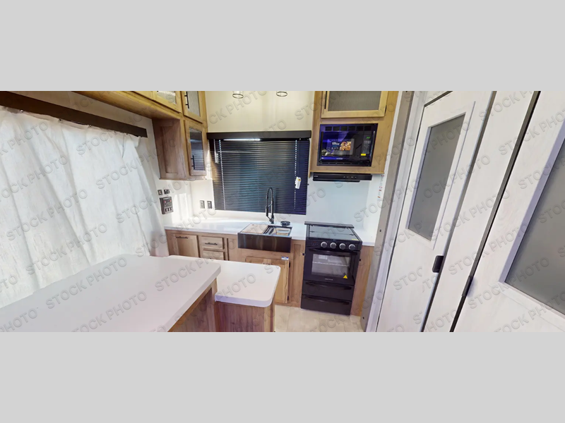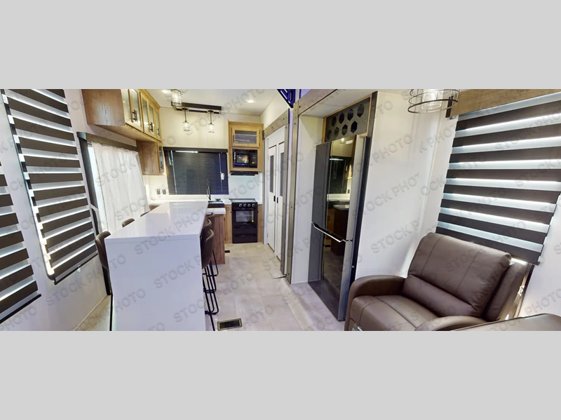 Time spent in this destination trailer will be time well spent! You will appreciate dual entry doors for maximum convenience, plus a spacious full bath that is close by the front private bedroom! Your crew can relax in the middle living area on the L-shaped sofa, and there are two lounge chairs for even more seating spaces. The rear kitchen will be any chef's dream with its island with six stools and all the appliances to create meals each day. This model also features triple slides so you can enjoy more space to relax!