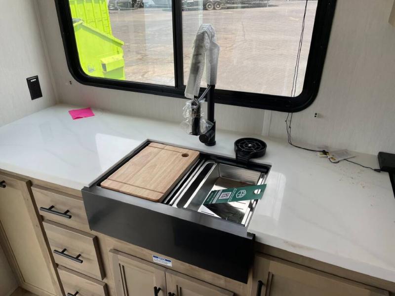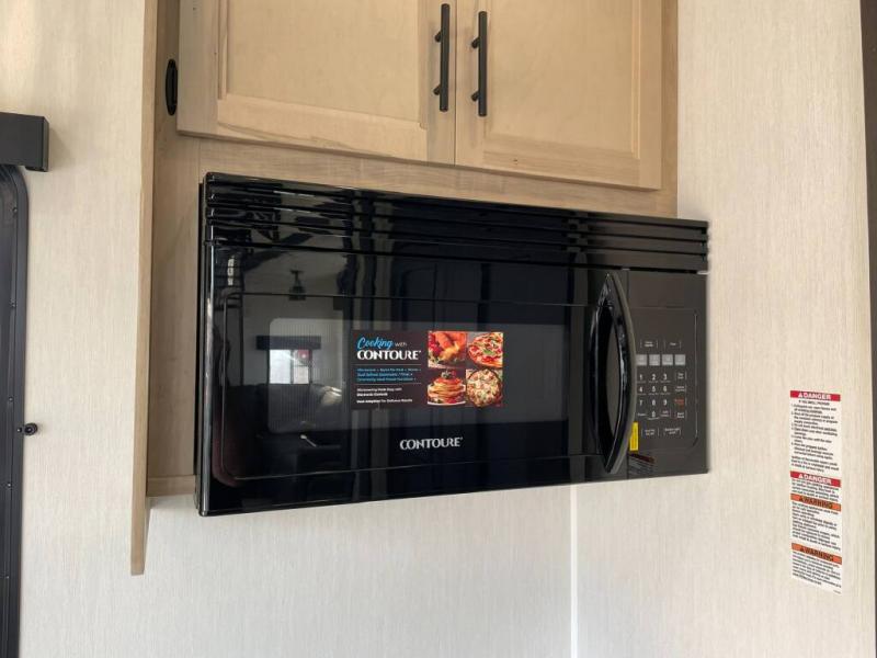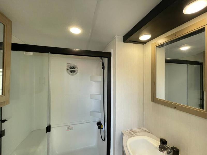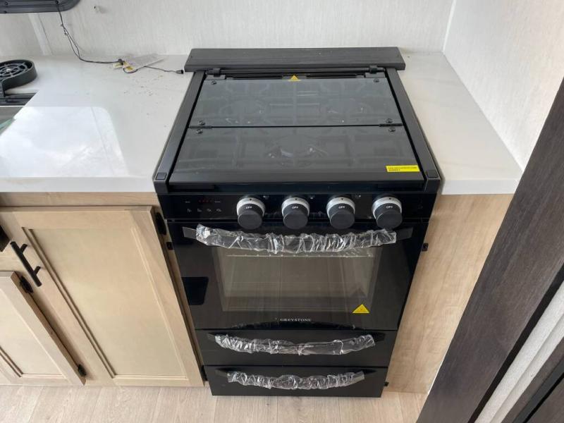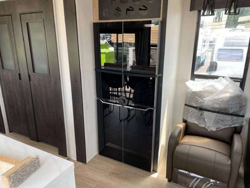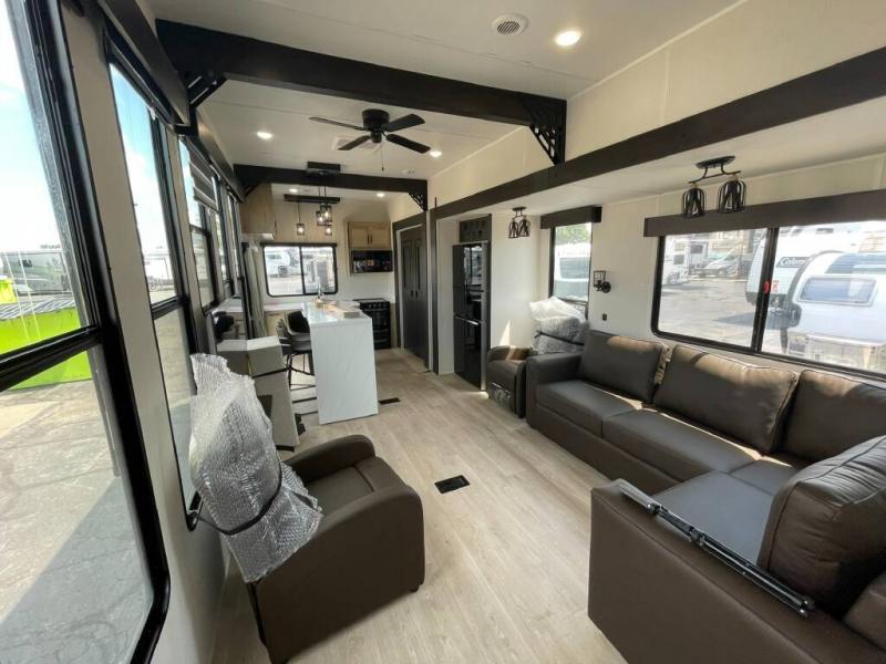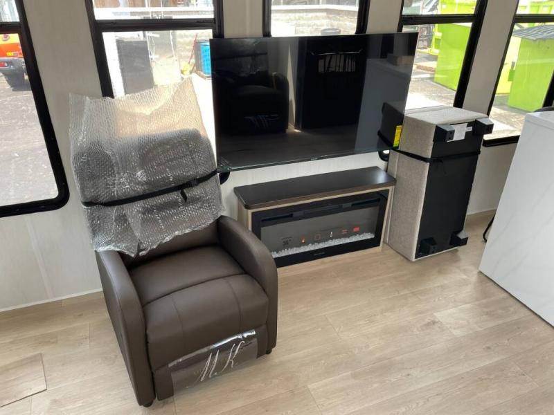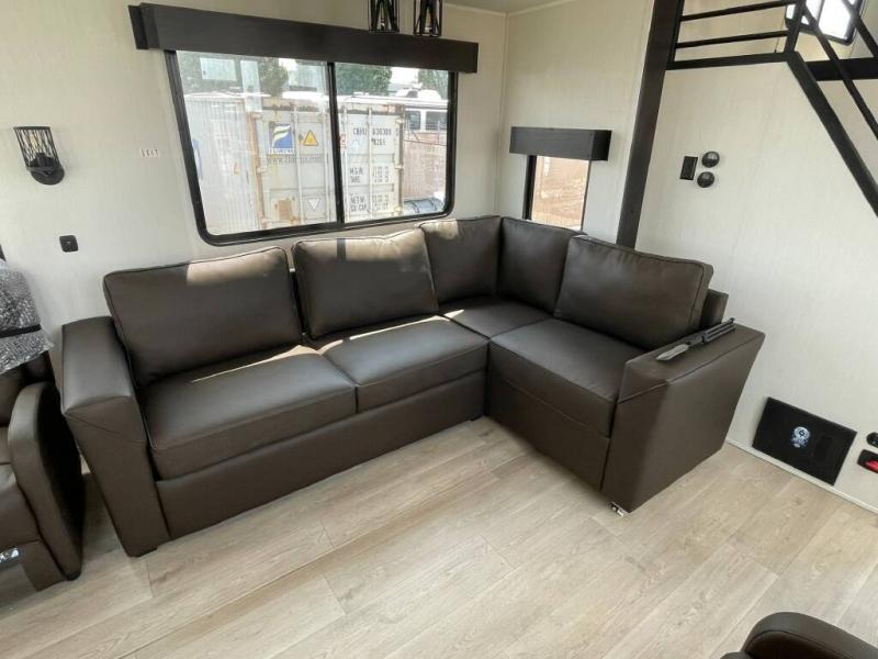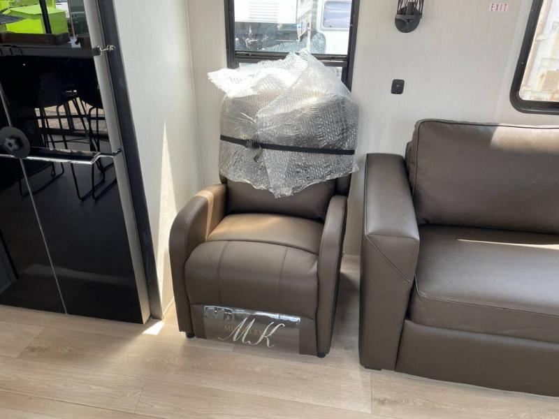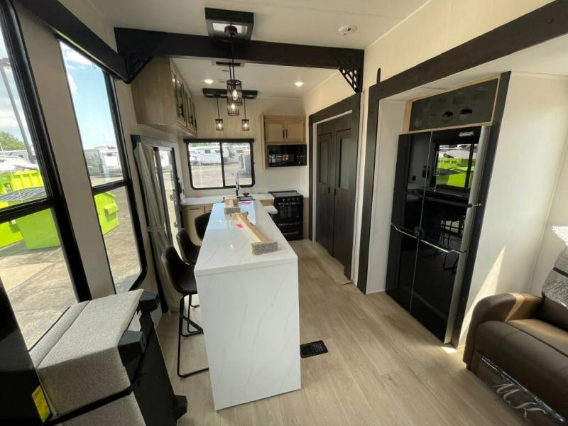 Time spent in this destination trailer will be time well spent! You will appreciate dual entry doors for maximum convenience, plus a spacious full bath that is close by the front private bedroom! Your crew can relax in the middle living area on the L-shaped sofa, and there are two lounge chairs for even more seating spaces. The rear kitchen will be any chef's dream with its island with six stools and all the appliances to create meals each day. This model also features triple slides so you can enjoy more space to relax!