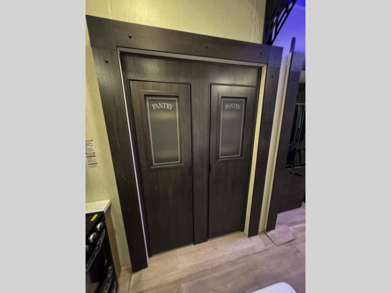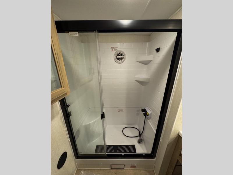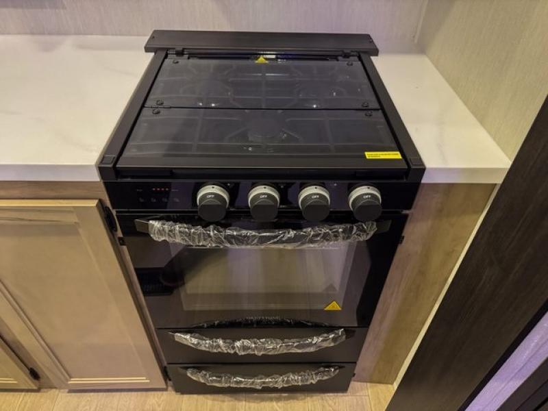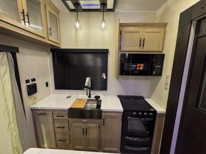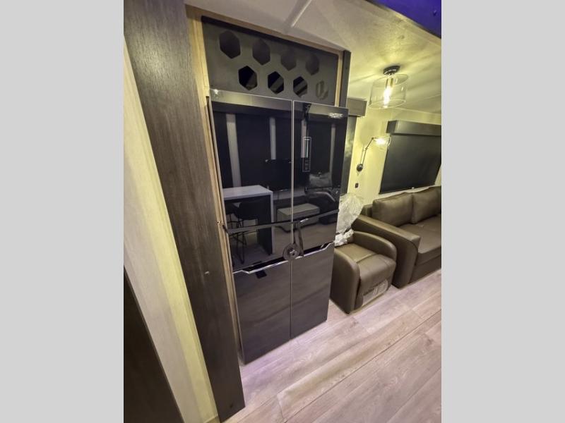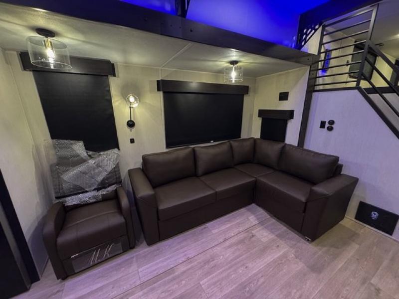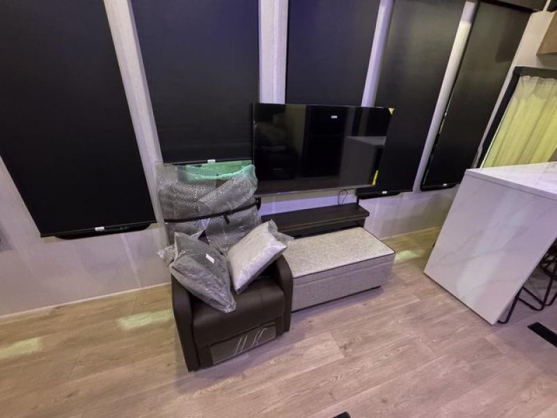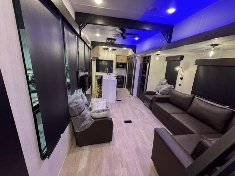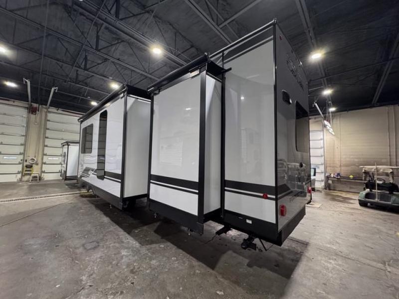 Time spent in this destination trailer will be time well spent! You will appreciate dual entry doors for maximum convenience, plus a spacious full bath that is close by the front private bedroom! Your crew can relax in the middle living area on the L-shaped sofa, and there are two lounge chairs for even more seating spaces. The rear kitchen will be any chef's dream with its island with six stools and all the appliances to create meals each day. This model also features triple slides so you can enjoy more space to relax!