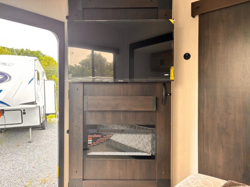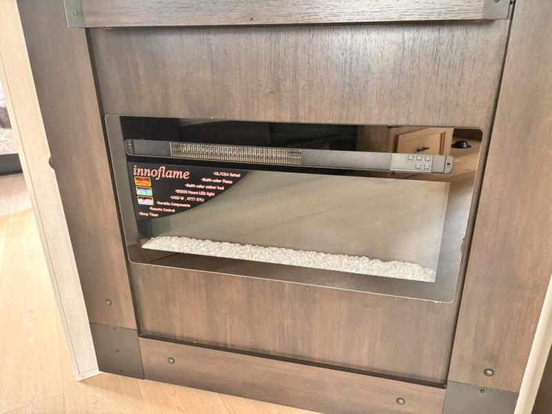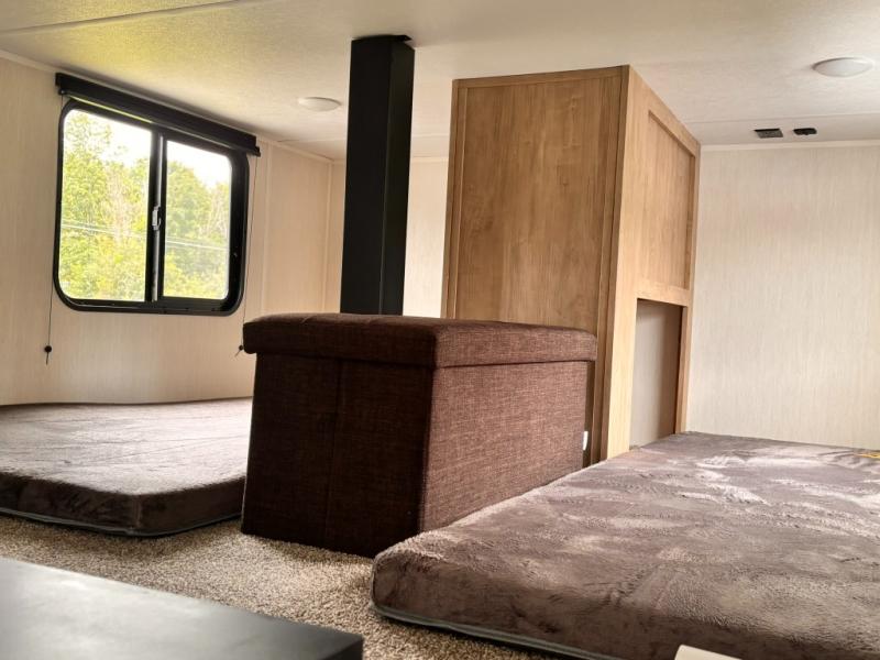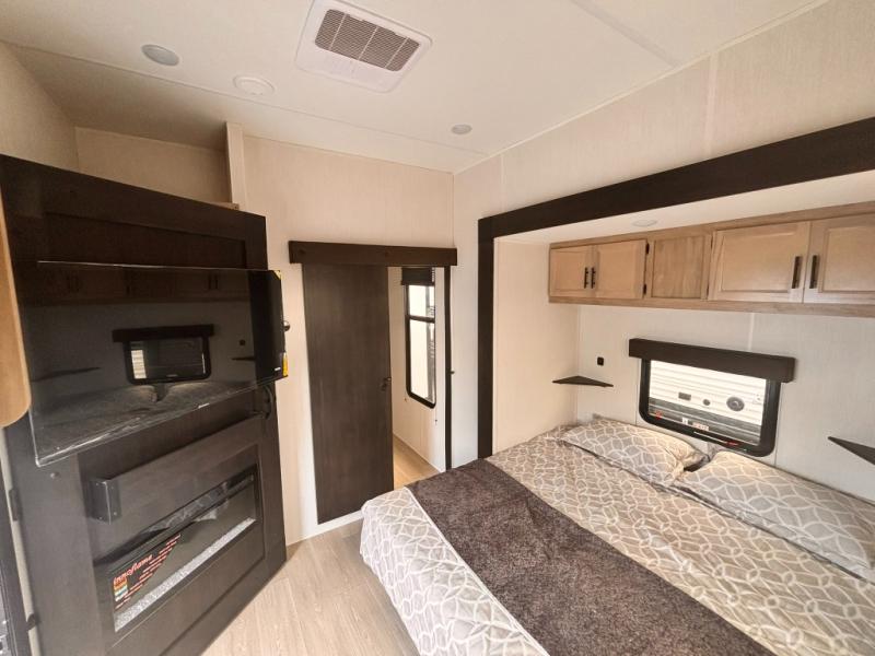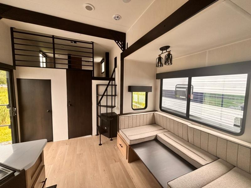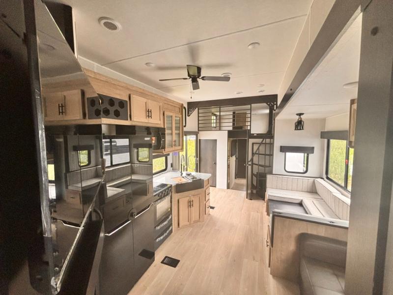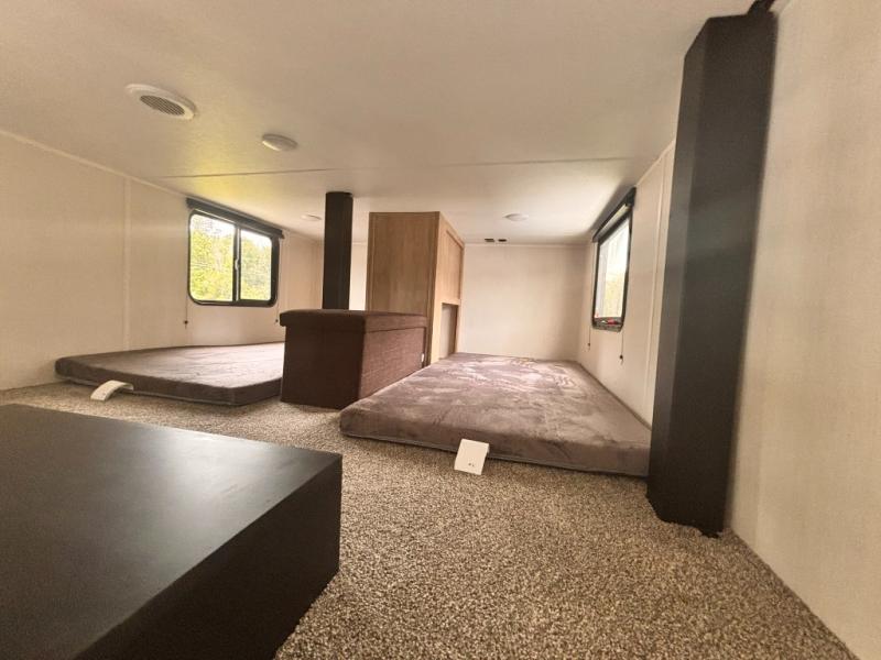 If you plan to camp with a larger group, this destination trailer will be perfect for you! There is a front private bedroom with a king bed slide out, a desk with a shoe rack underneath, plus an entertainment center with a fireplace to make it more cozy! Your guests can claim the rear den with a sofa slide out, plenty of storage, and their own full bath! There is even a loft above this room with two bunk mats and cabinets for storage. And the second full bath is up front right next to the bedroom for convenience. In the morning, everyone can meet in the combined kitchen and living area as the chef make breakfast in the full kitchen. There is a U-shaped dinette and hide-a-bed sofa within the large slide out here, plus an entertainment center with a fireplace and hidden walk-in pantry!
