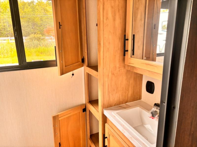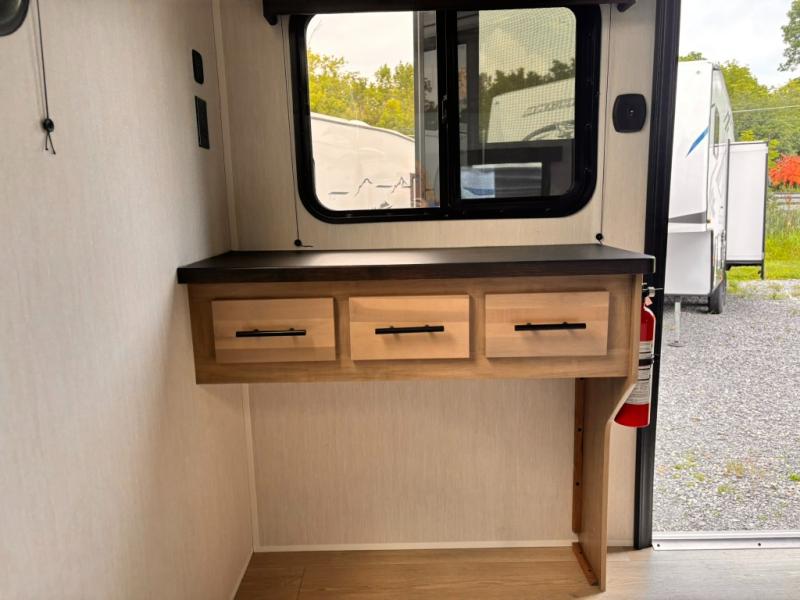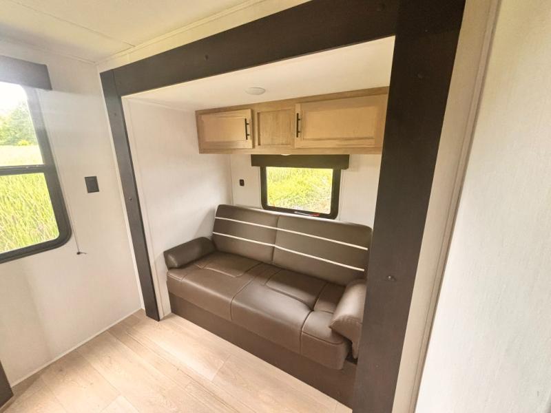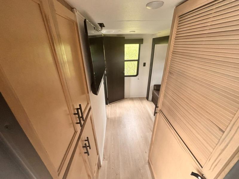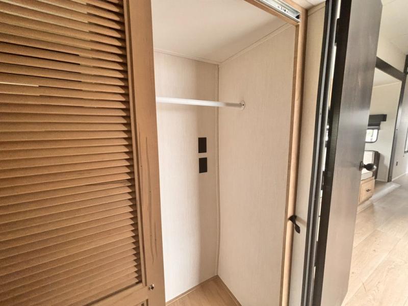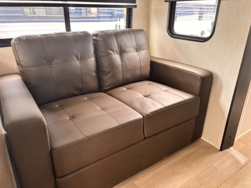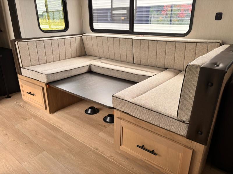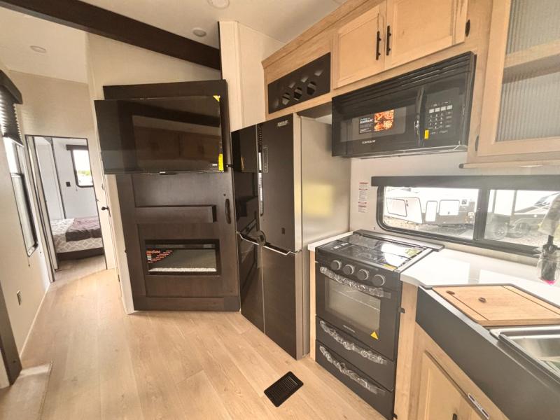 If you plan to camp with a larger group, this destination trailer will be perfect for you! There is a front private bedroom with a king bed slide out, a desk with a shoe rack underneath, plus an entertainment center with a fireplace to make it more cozy! Your guests can claim the rear den with a sofa slide out, plenty of storage, and their own full bath! There is even a loft above this room with two bunk mats and cabinets for storage. And the second full bath is up front right next to the bedroom for convenience. In the morning, everyone can meet in the combined kitchen and living area as the chef make breakfast in the full kitchen. There is a U-shaped dinette and hide-a-bed sofa within the large slide out here, plus an entertainment center with a fireplace and hidden walk-in pantry!