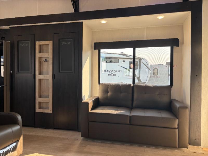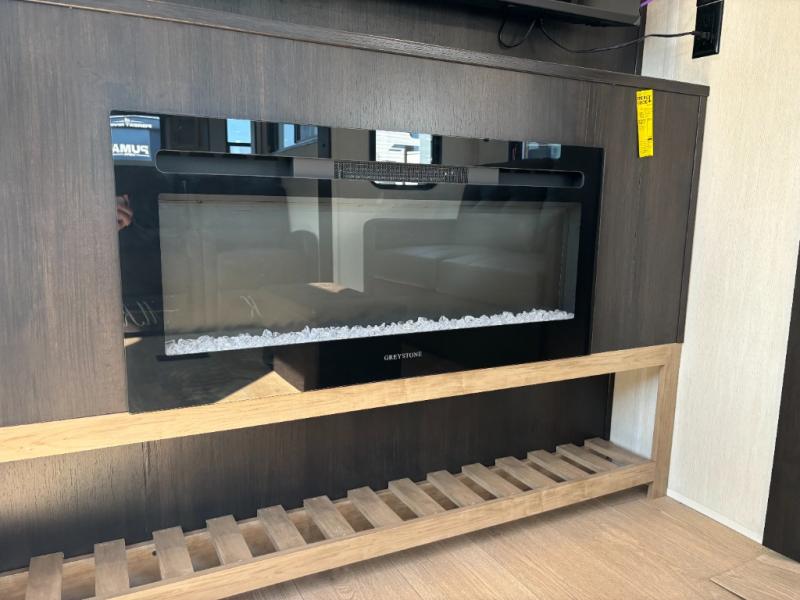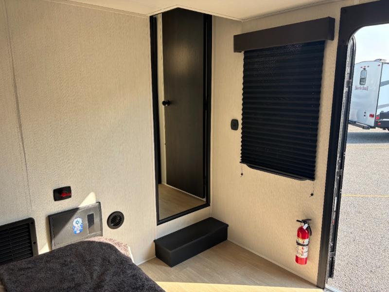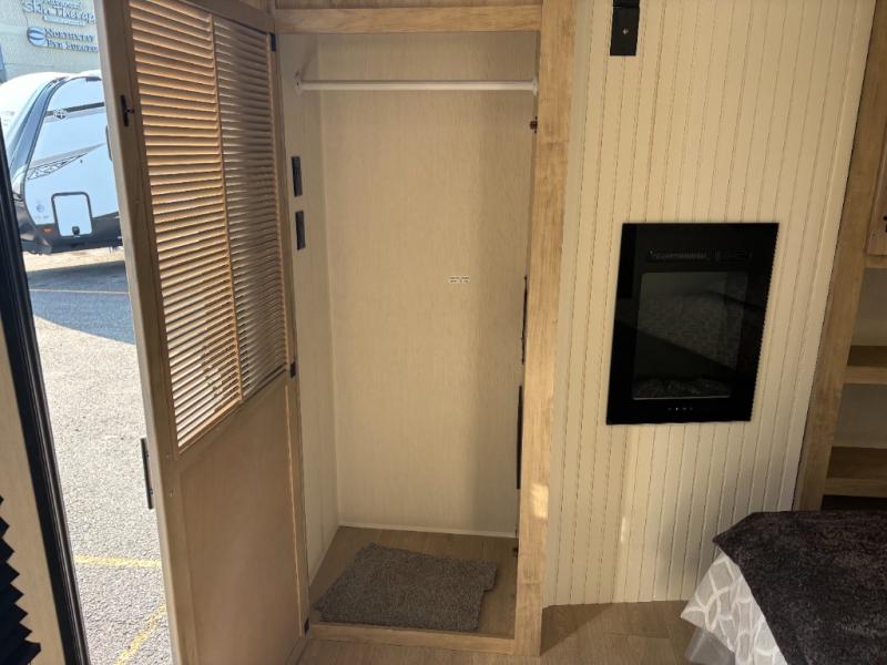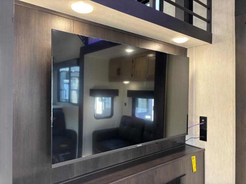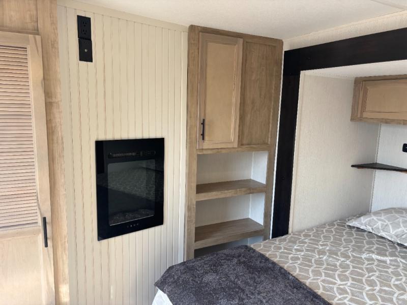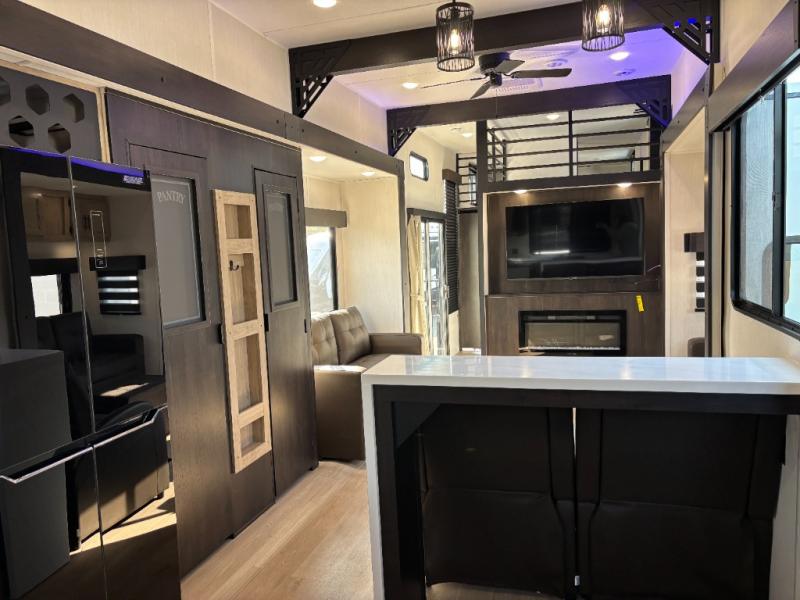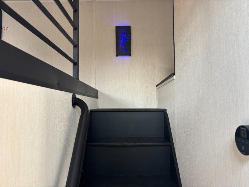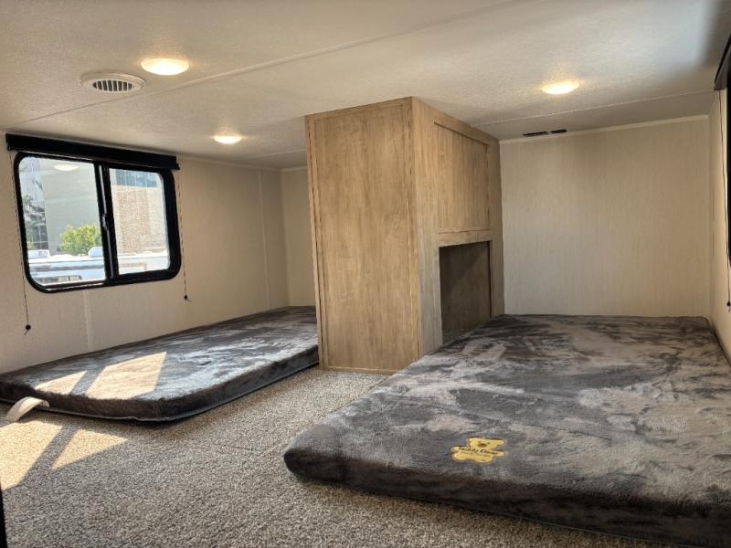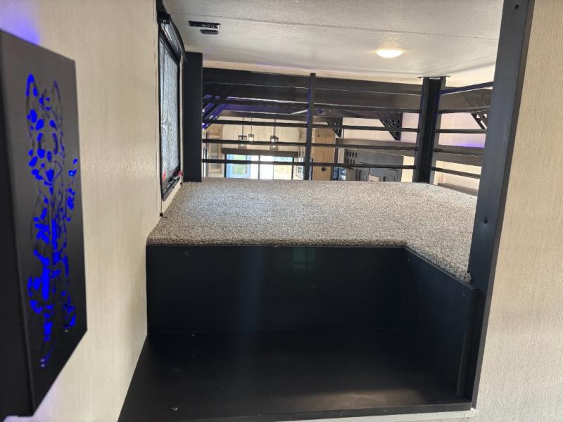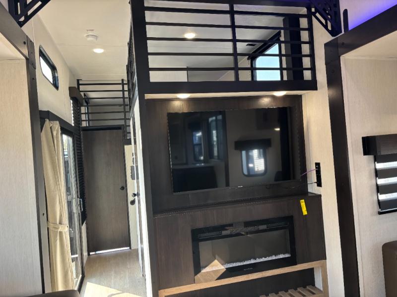 It won't be hard to find comfort in this front kitchen destination trailer! There is ample counter space to prep meals, a free-standing dinette with a slide out, plus a large pantry and 18 cu. ft. refrigerator for food storage. The bar top with stools overlooks the middle living area, where you'll also find dual hide-a-bed sofas and an entertainment center with a fireplace. The full bath includes a shower with a seat for more comfort, and one of the dual entry doors is right across from the bath so you can quickly get back outside. Head up the steps to the dual loft areas with two bunk mats and cabinets on one side, and an open area on the other, perfect for a play room or extra storage! And under the loft you'll find the rear private bedroom with a king bed slide, a wardrobe and an entertainment center, plus washer and dryer prep if you want to add these appliances!